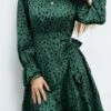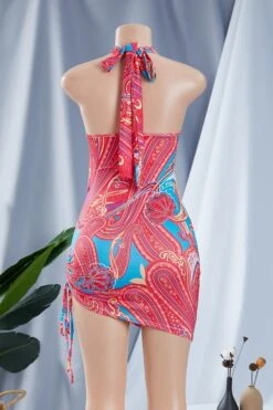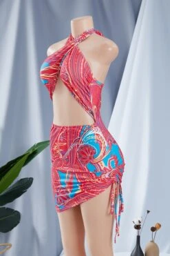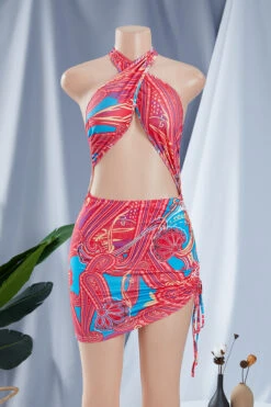 New stylish batch printing halter neck drawstring laced hollow out sexy slim dress #2#