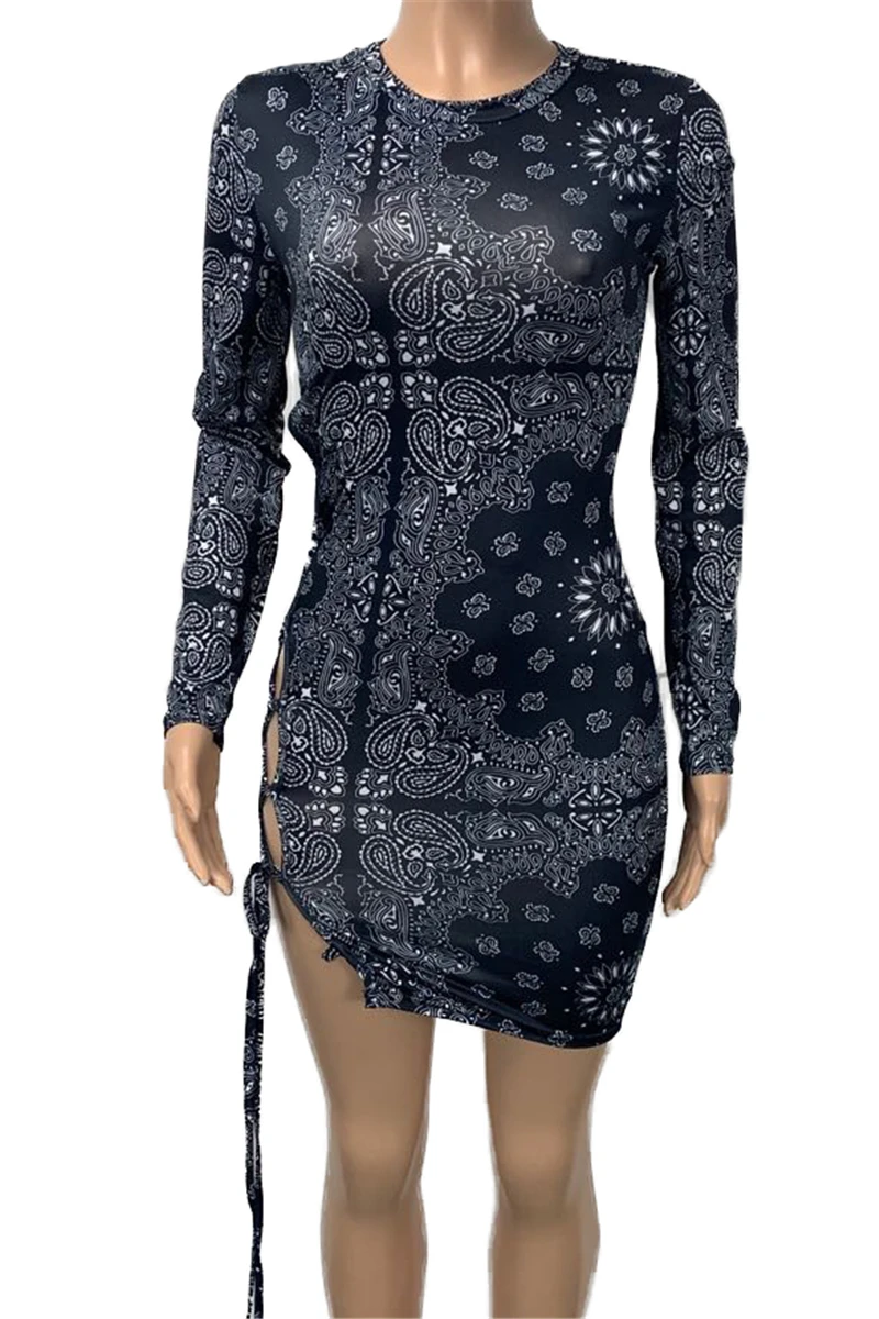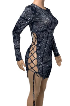 New stylish batch printing lace-up hollow out stretch slim dress