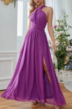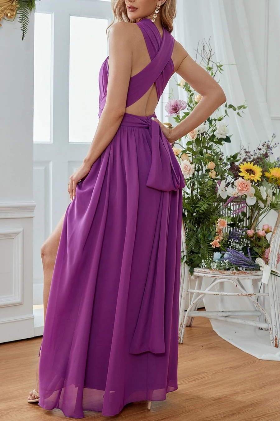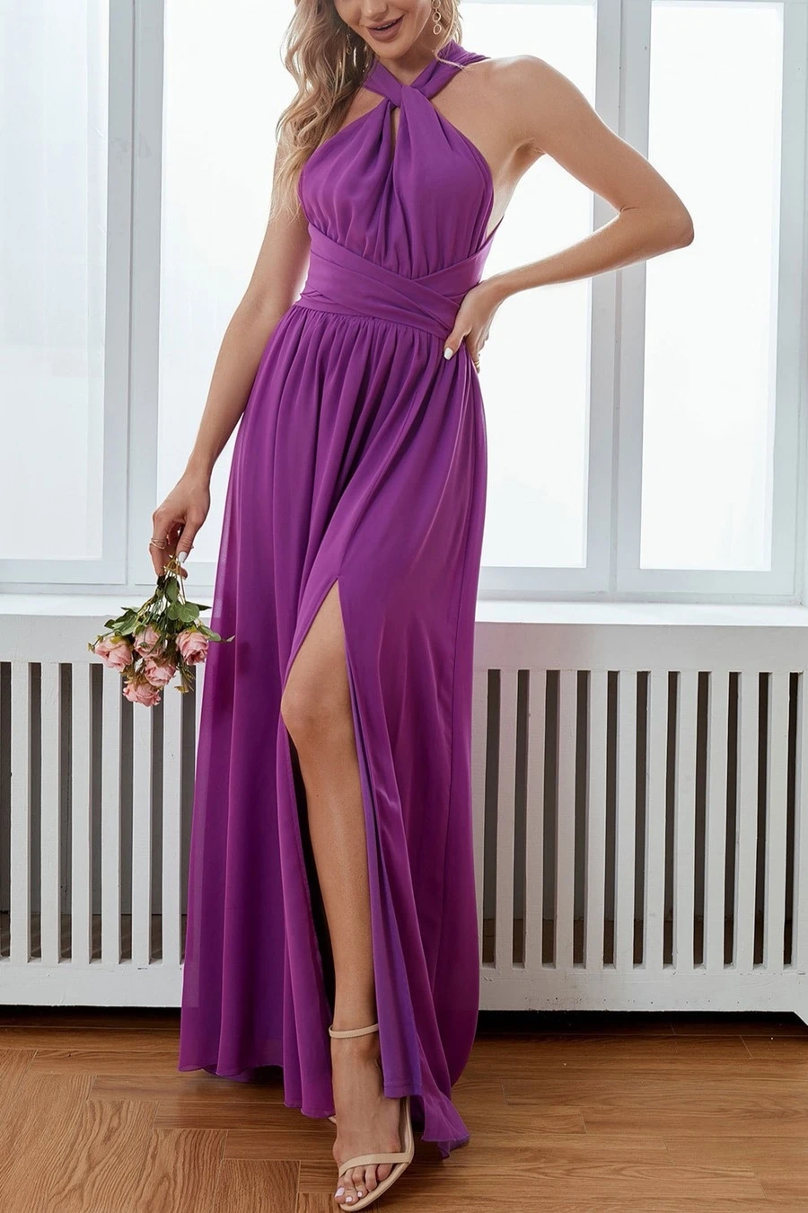 Non stretch chiffon halter lace up high slit swing sexy maxi dress