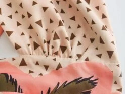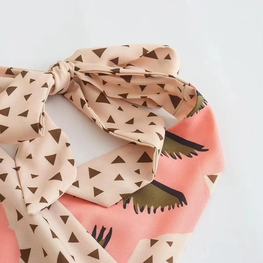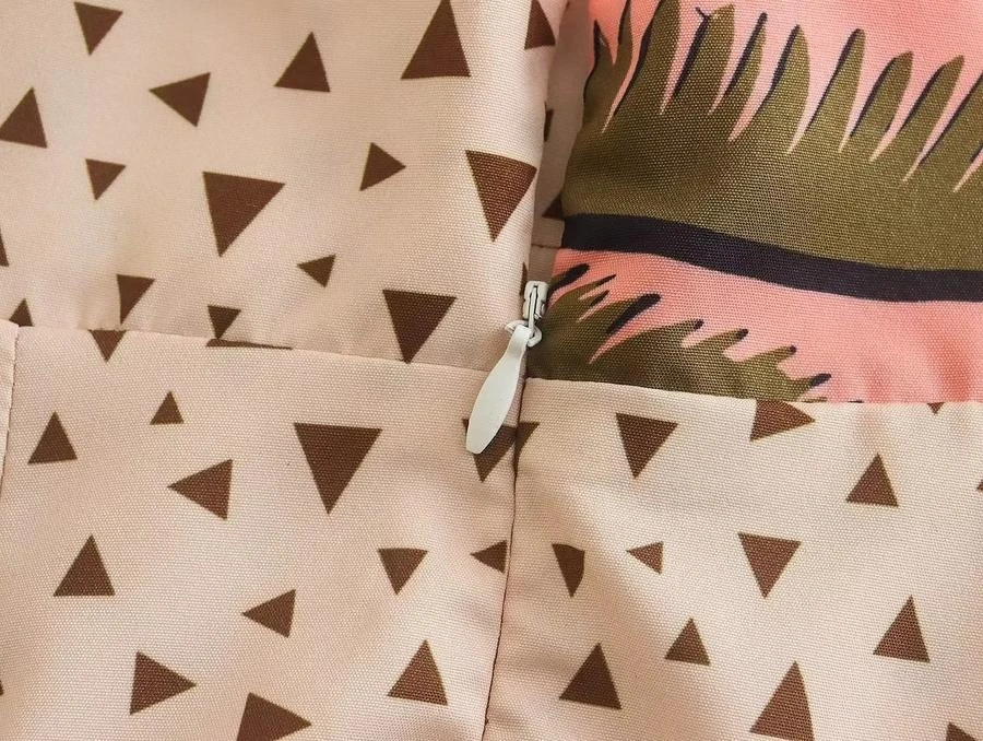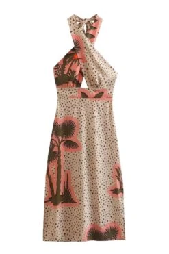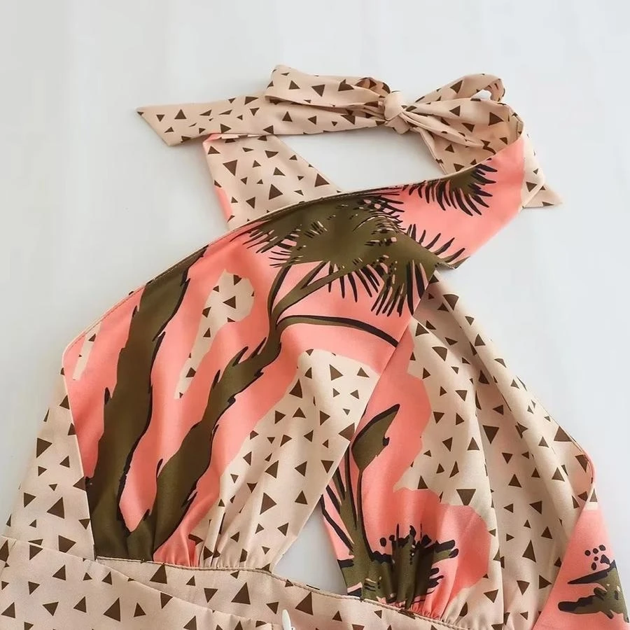 Non-stretch cross halter neck backless leaves batch printing slit mini dress