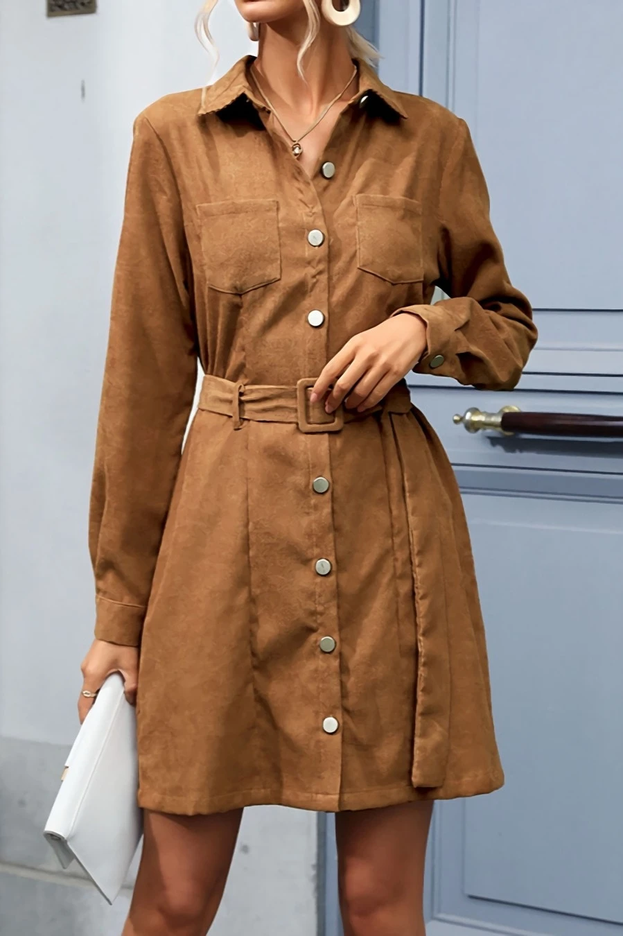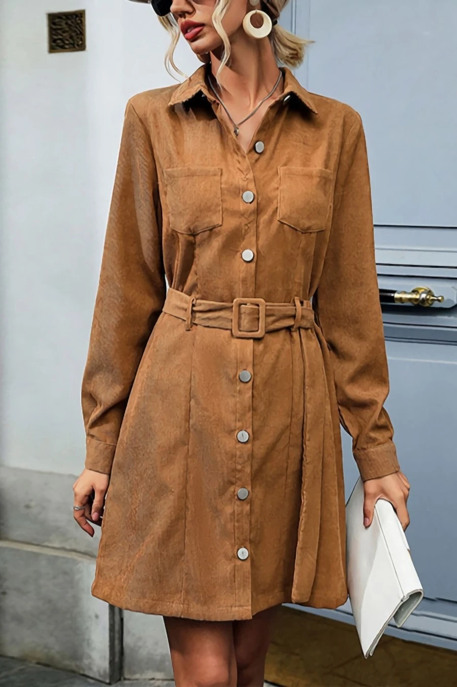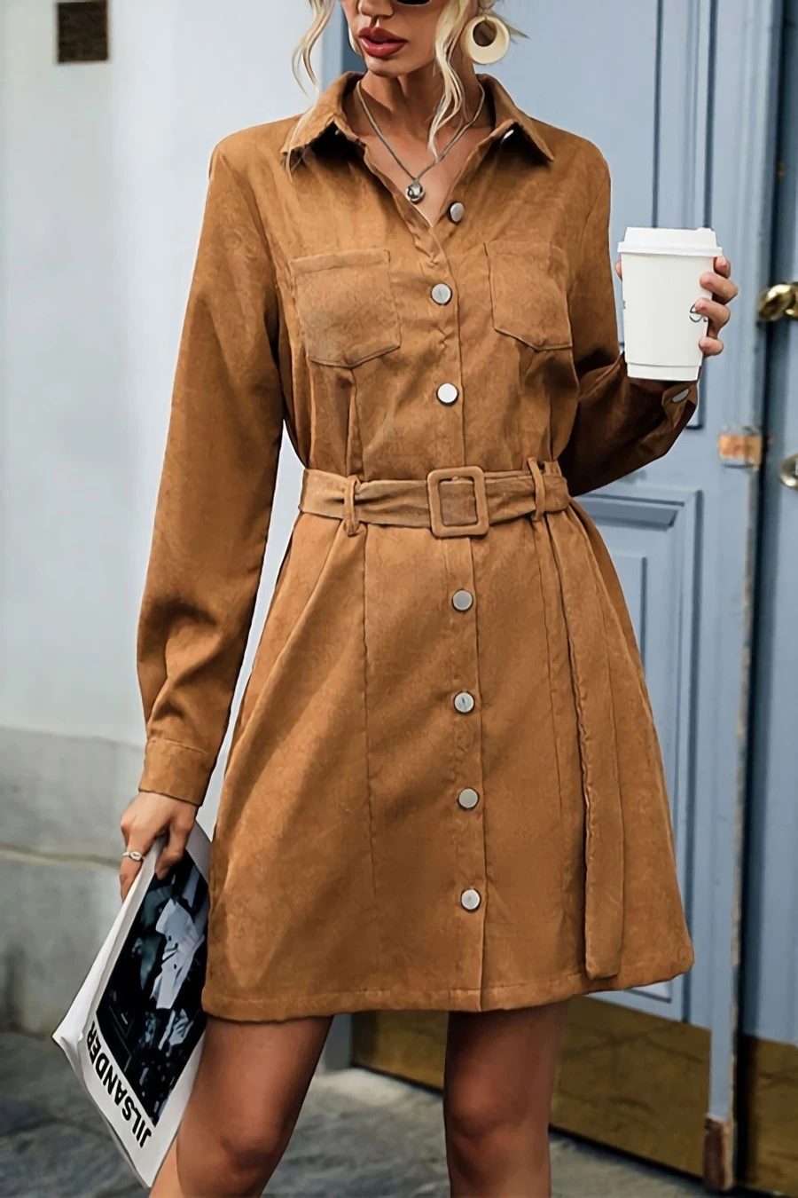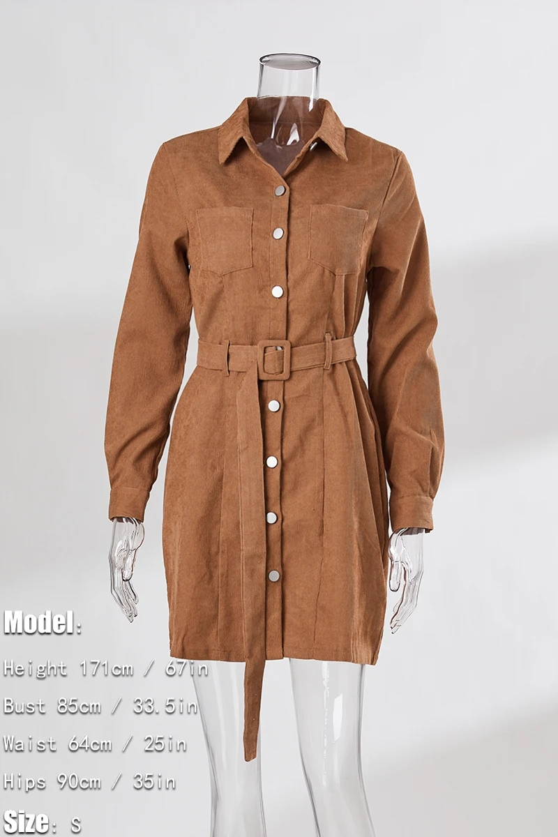 Non-stretch solid color single-breasted pocket belt corduroy casual mini dress