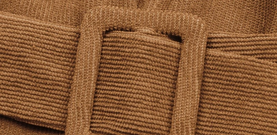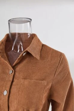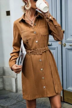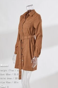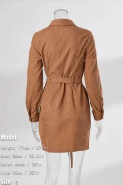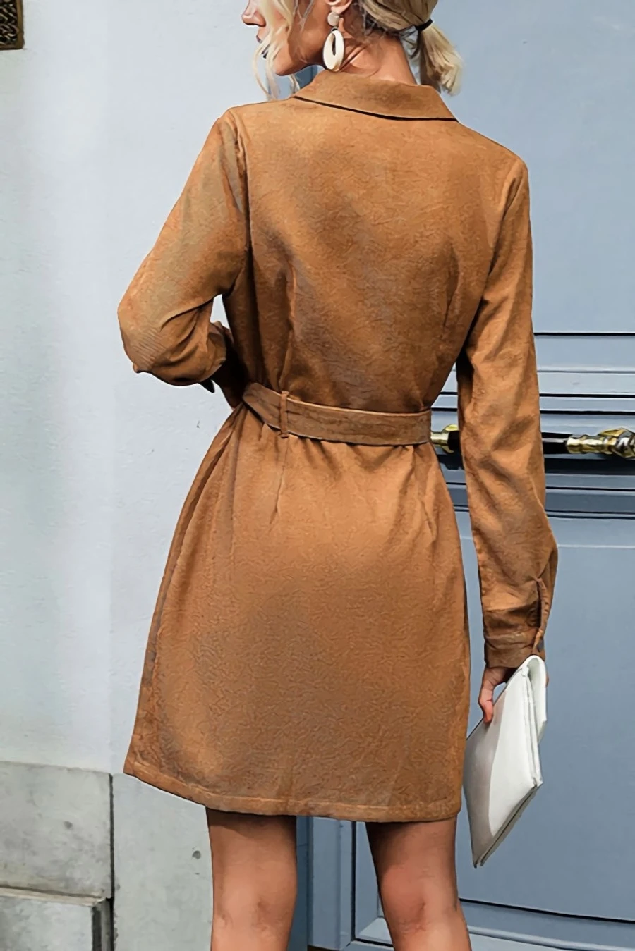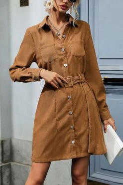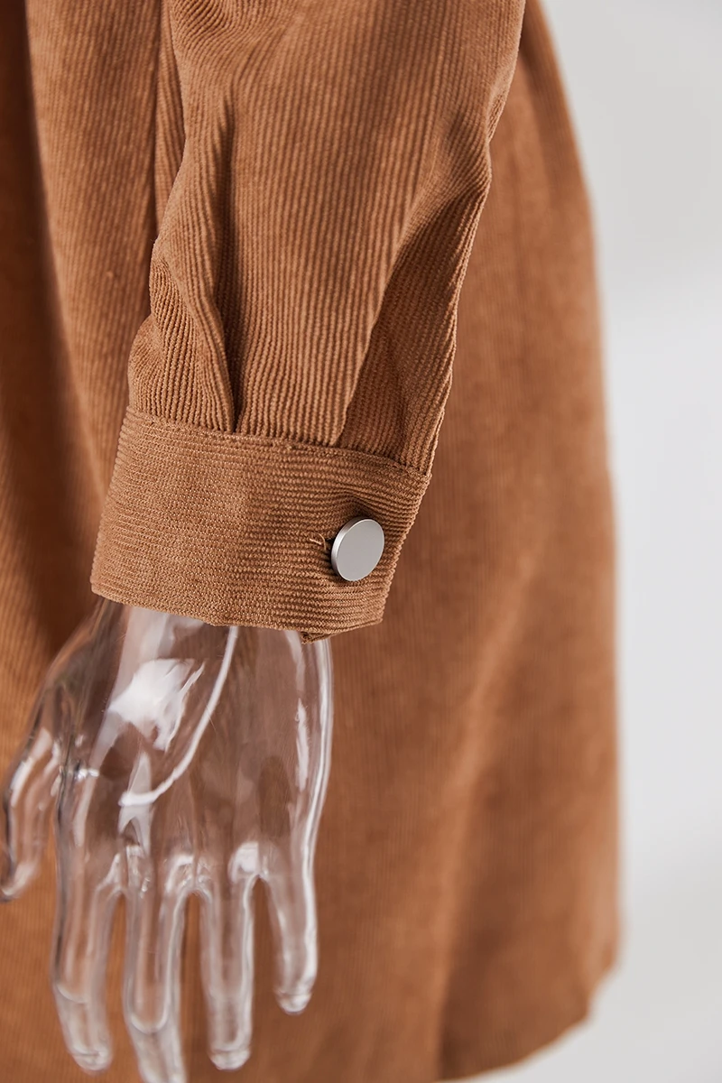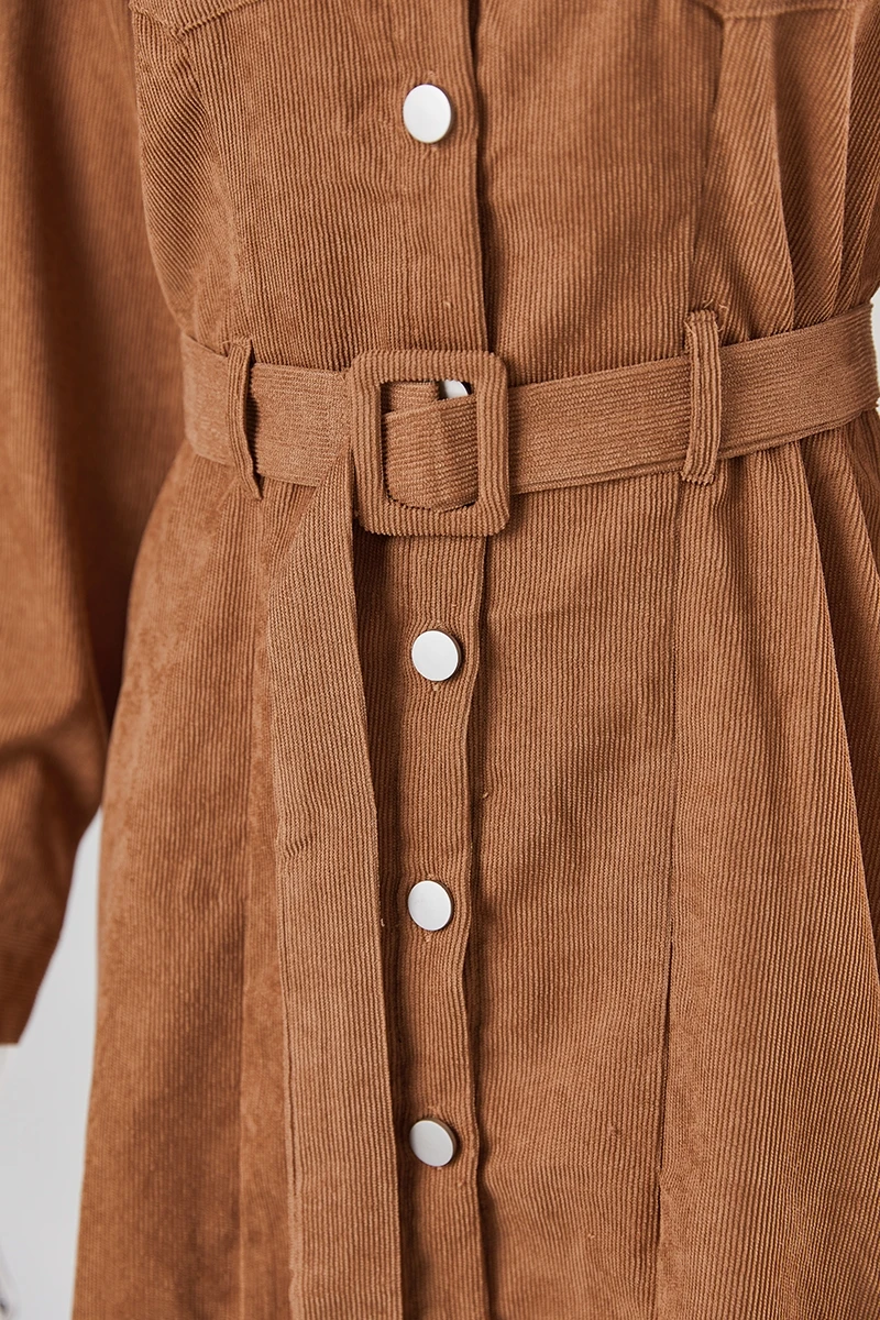 Non-stretch solid color single-breasted pocket belt corduroy casual mini dress
