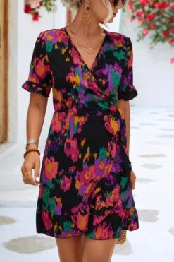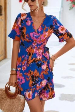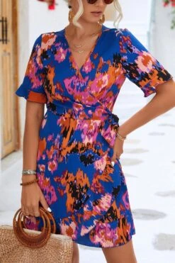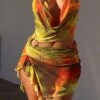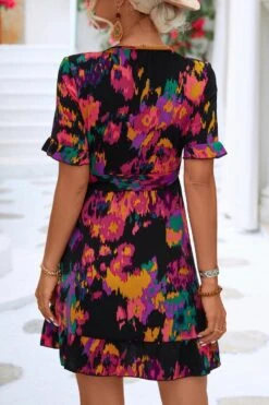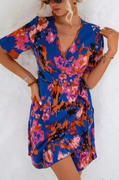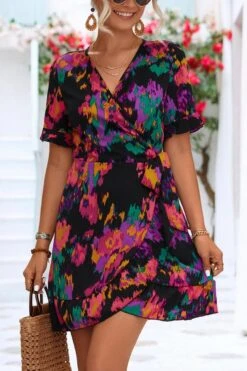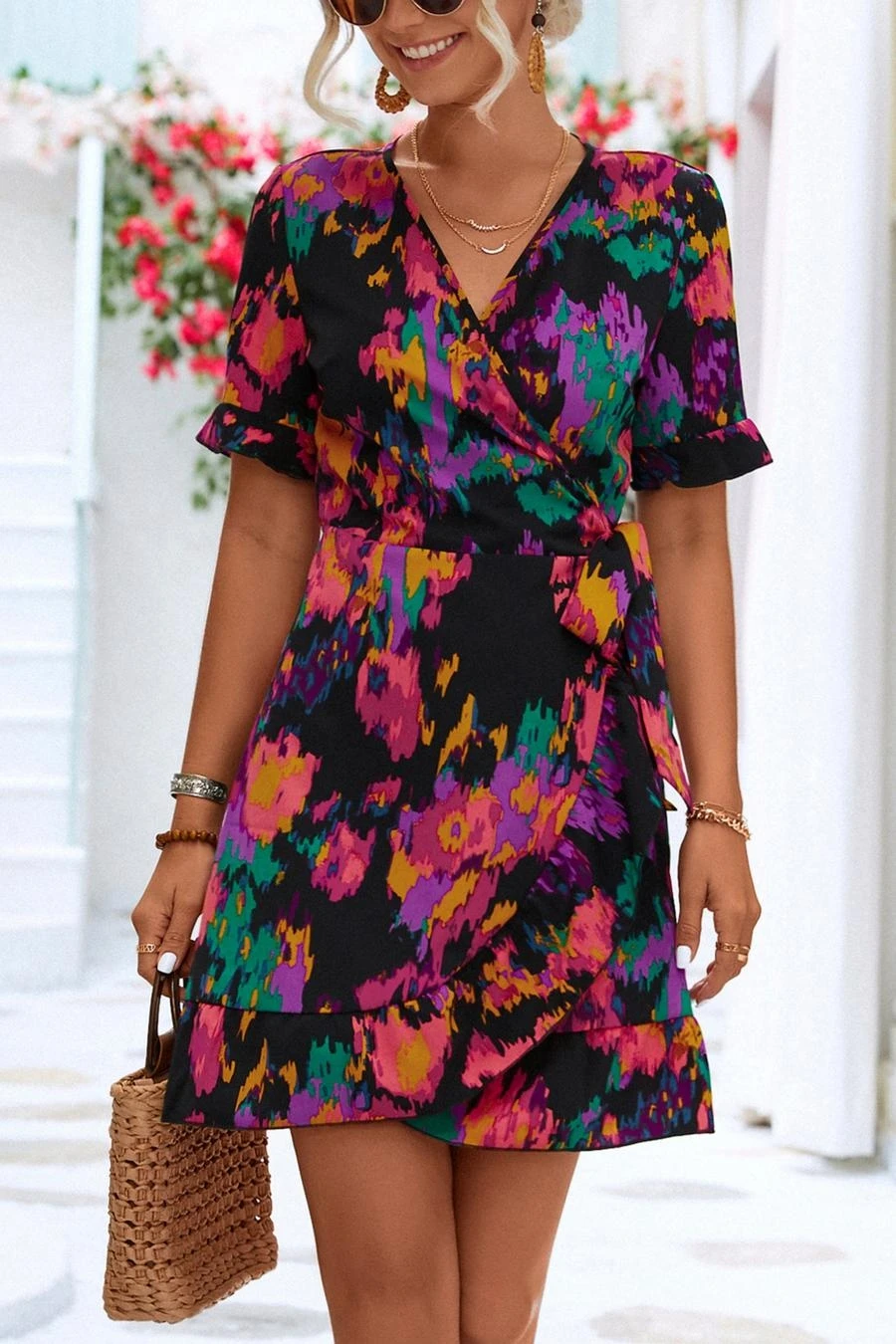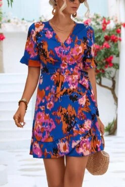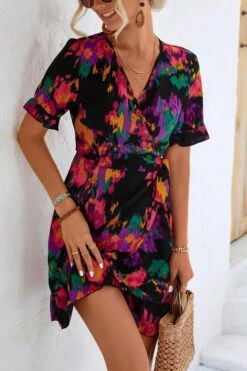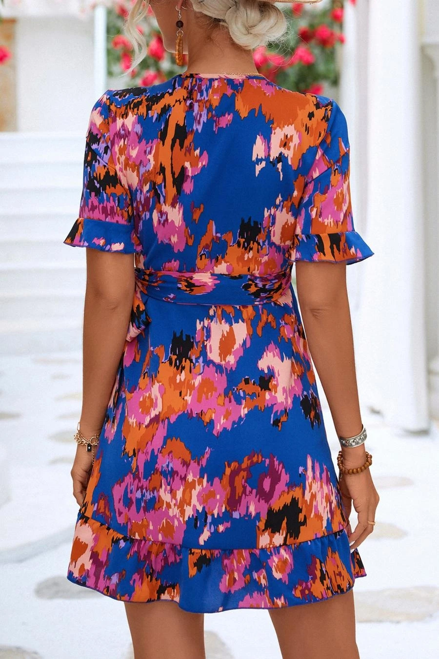 Non-stretch tie-dye batch printing v-neck stylish casual mini dress