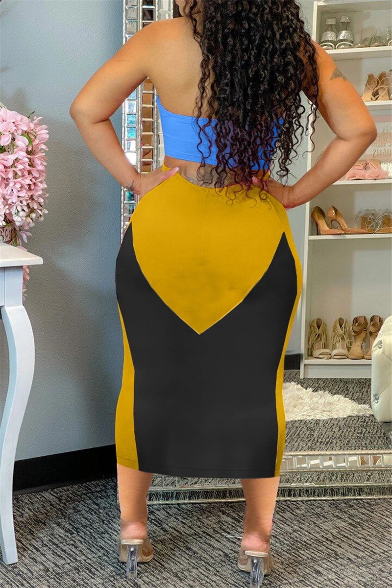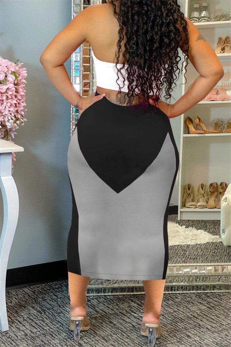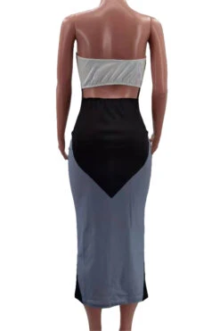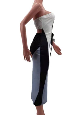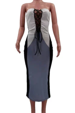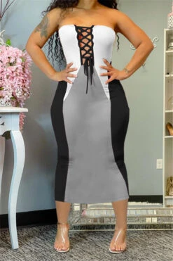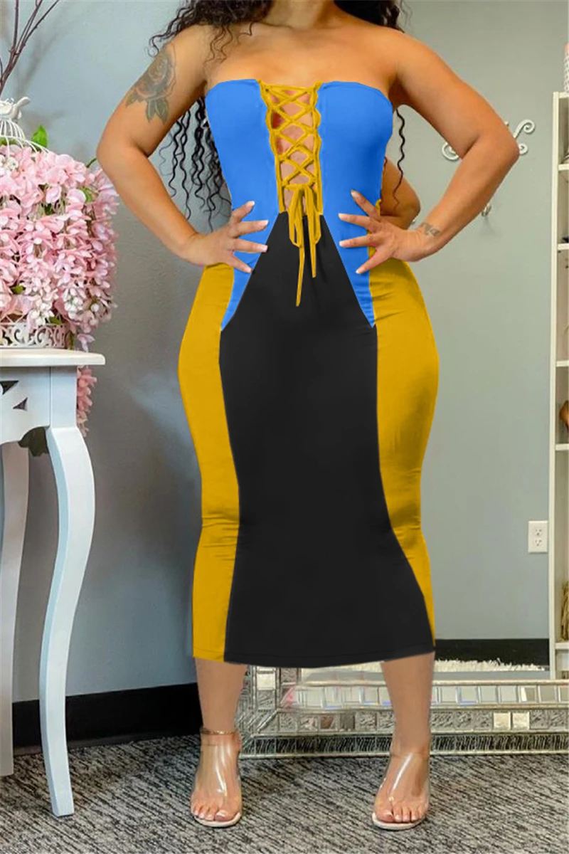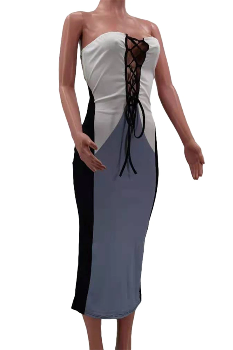 Plus size 4 colors contrast color hollow out strapless lace-up sexy slim dress