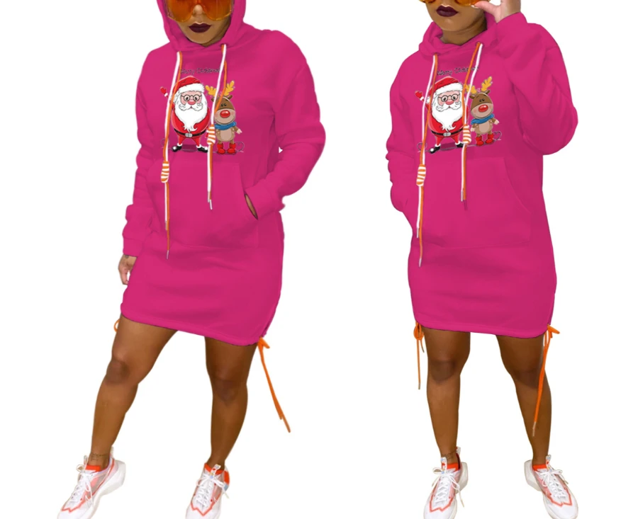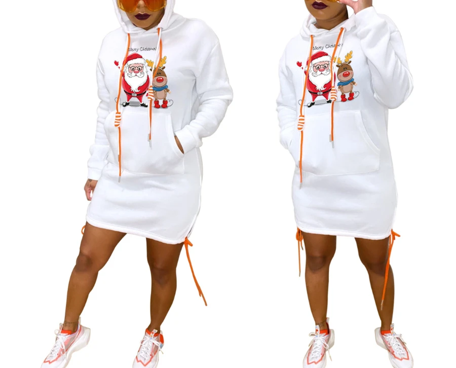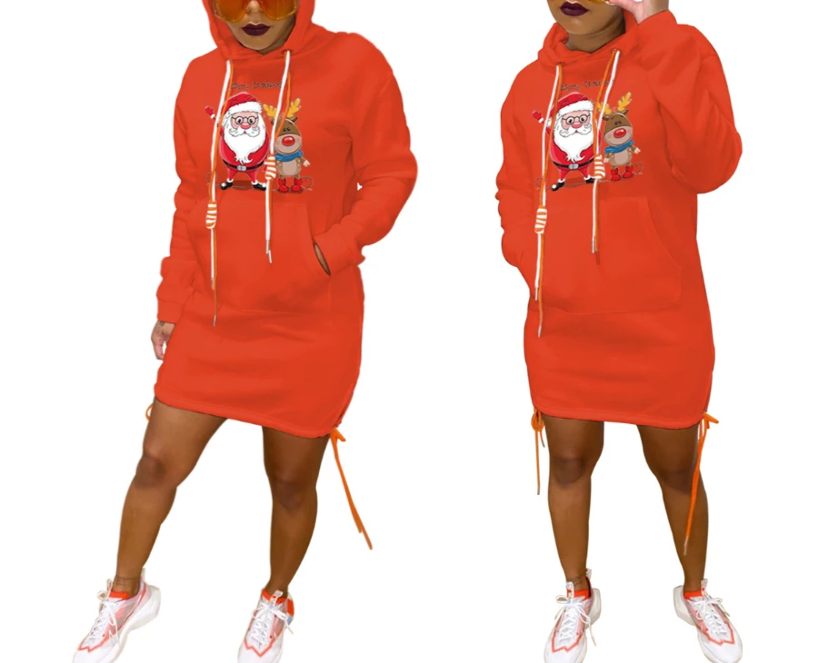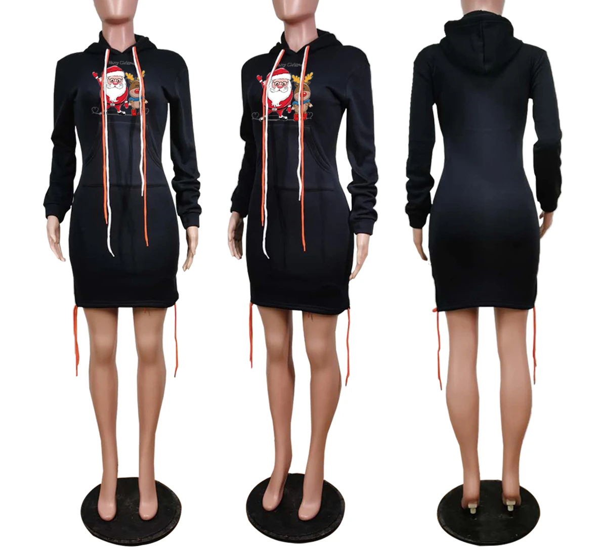 Plus size autumn 7 colors Christmas pattern printing hooded stretch casual mini dress