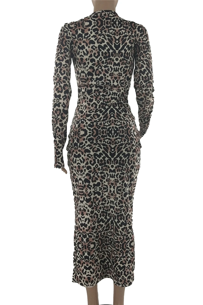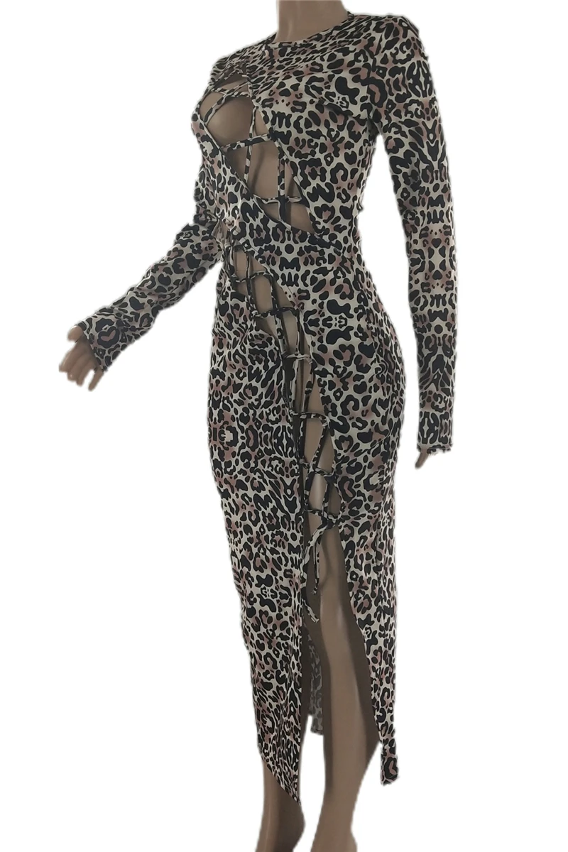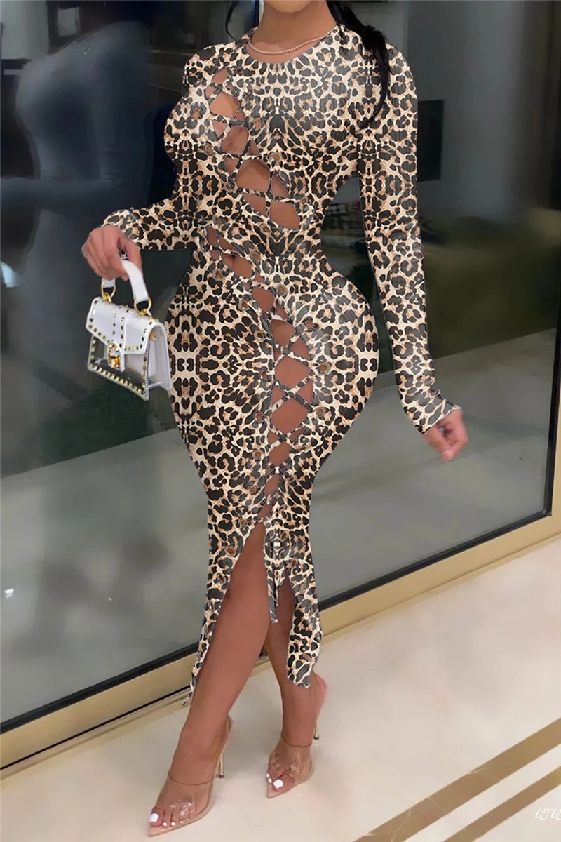 Plus size autumn leopard batch printing lace-up hollow out sexy dress
