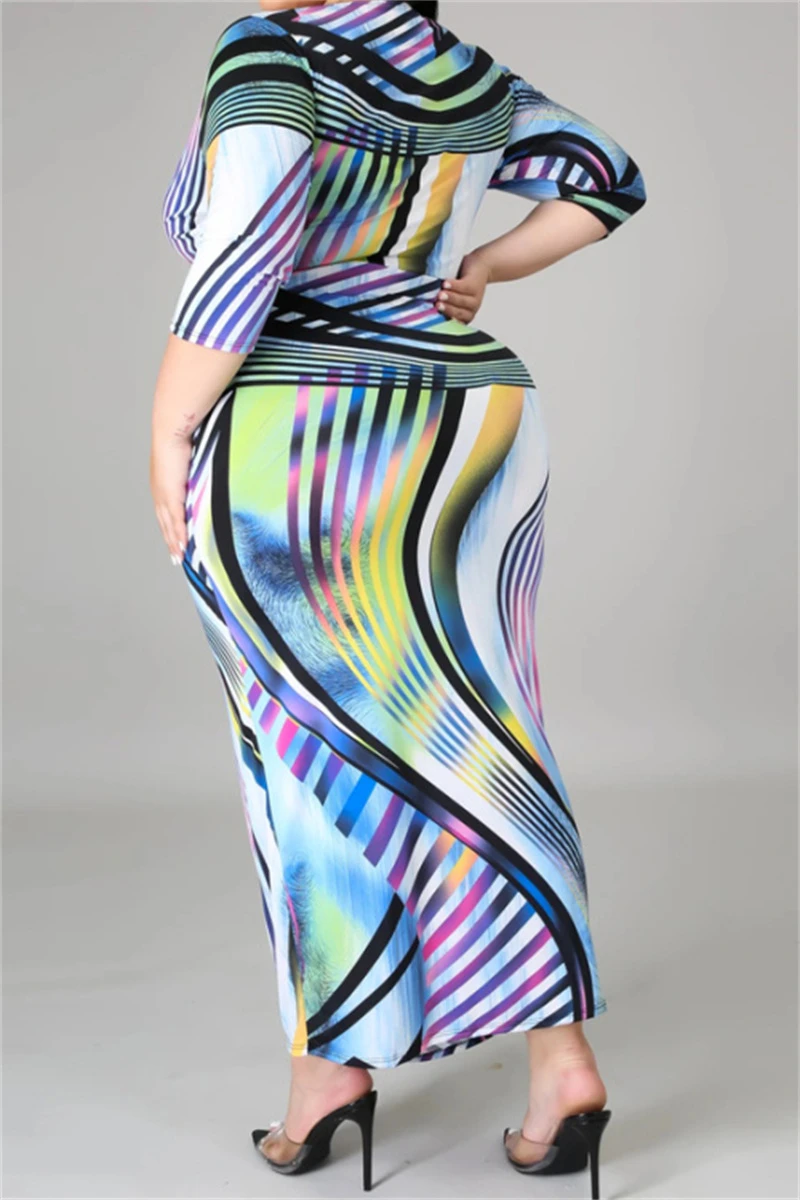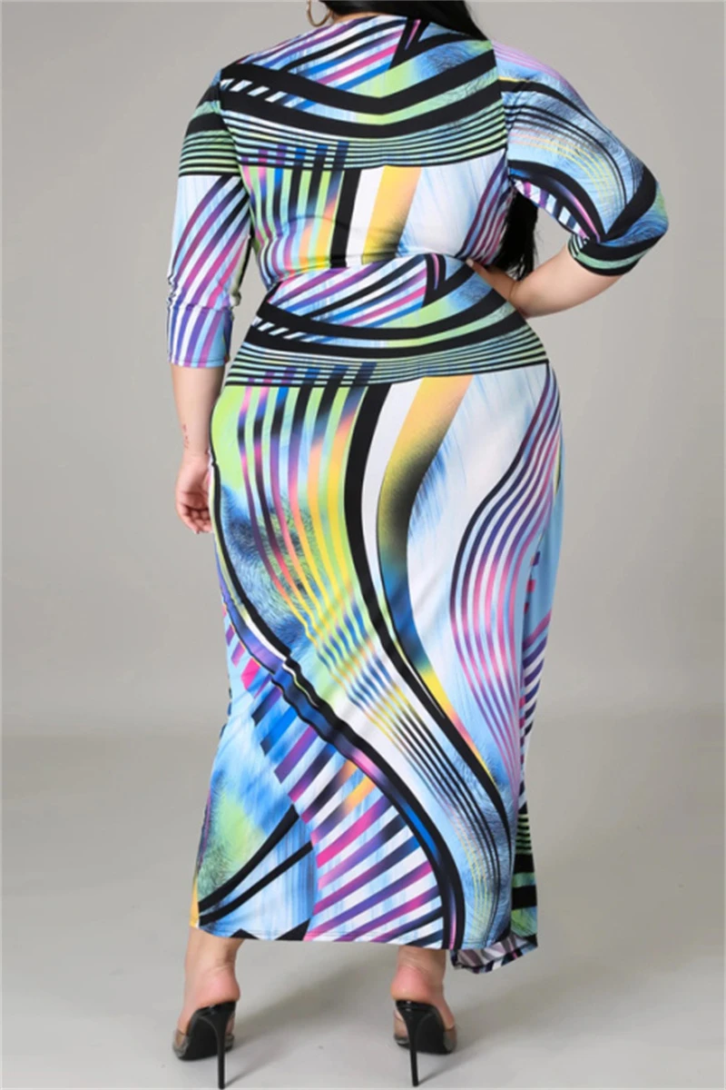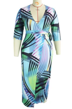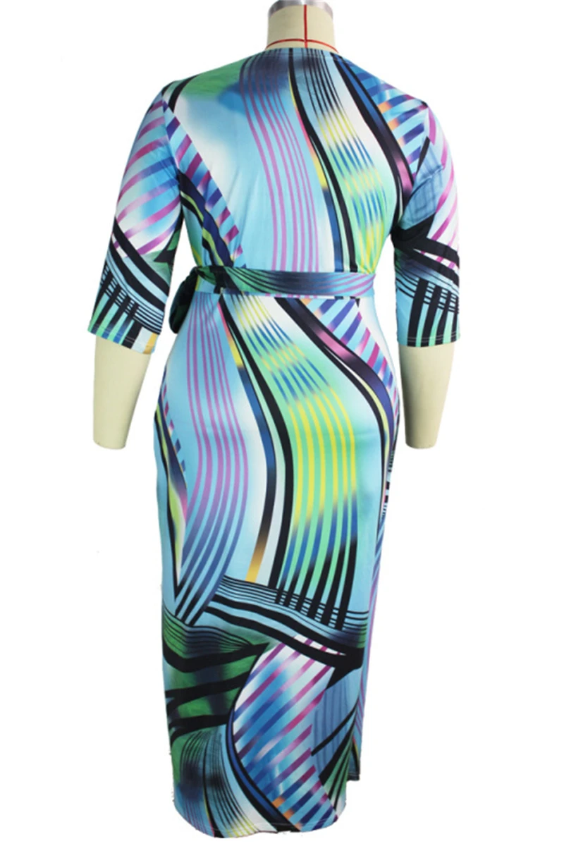 Plus size fashional casual batch printing with belt short sleeve slim elegant V neck maxi dress