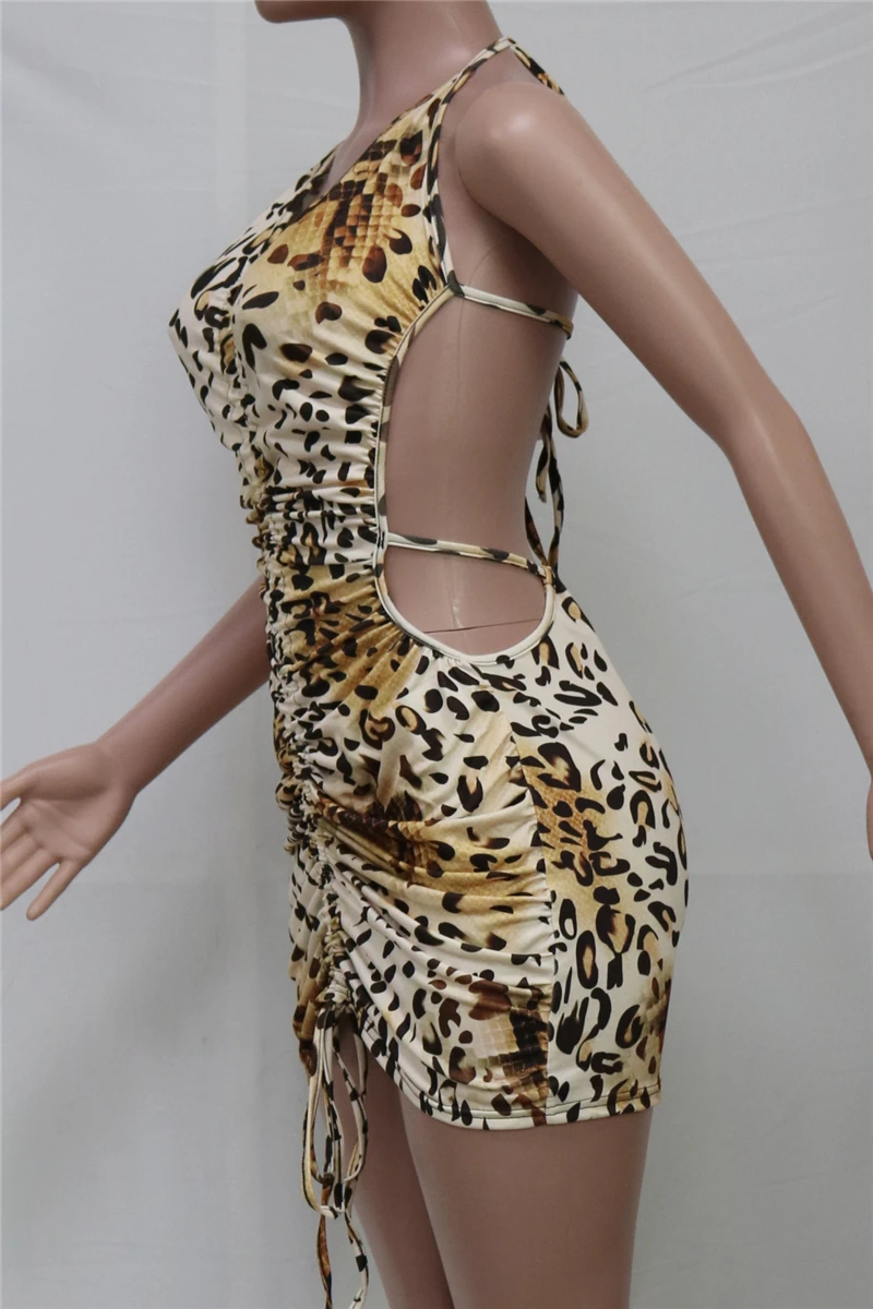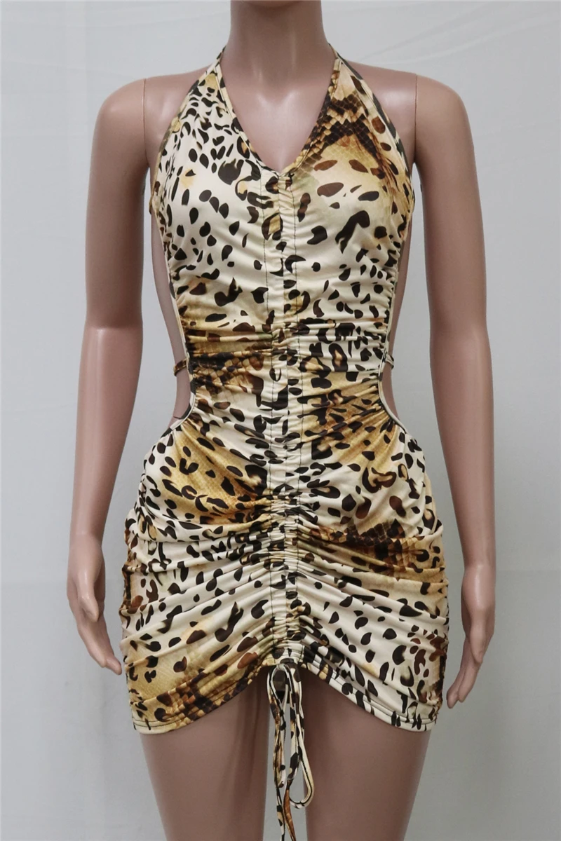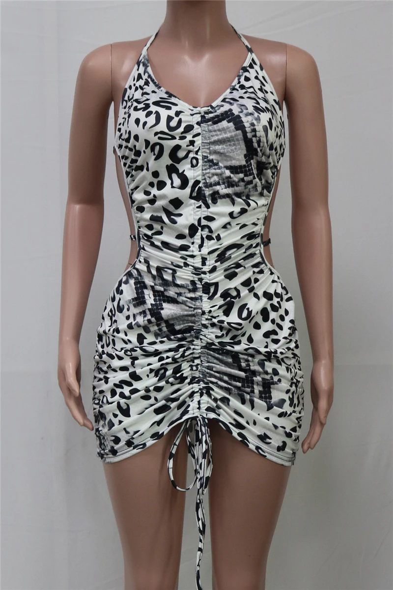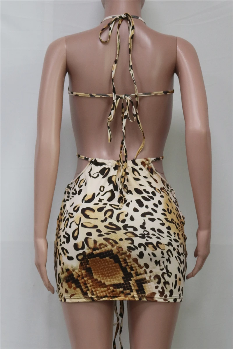 Plus size leopard batch printing summer backless halter-neck sexy slim mini dress