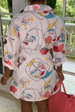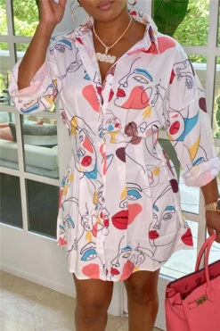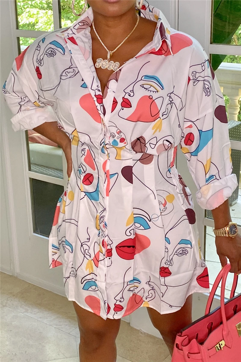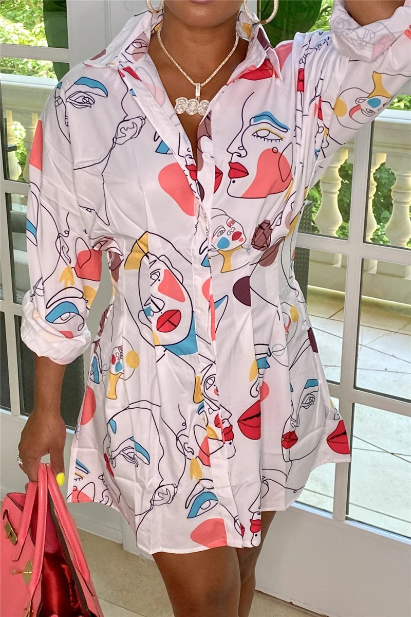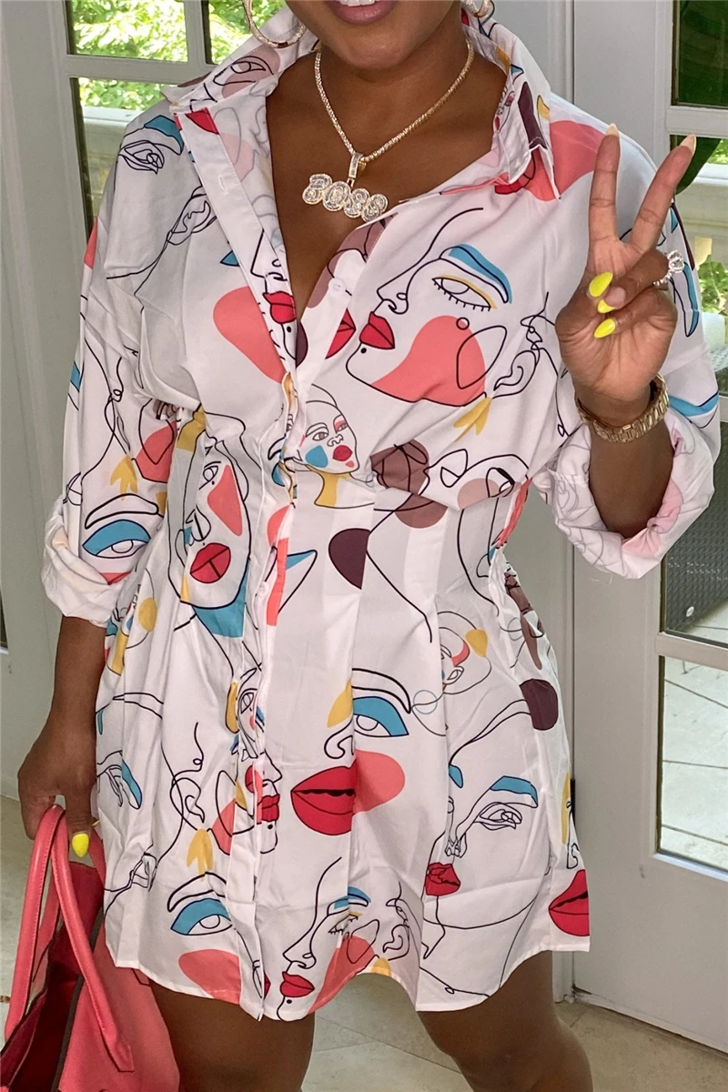 Plus size long sleeve summer single breasted inelastic batch printing mini dress