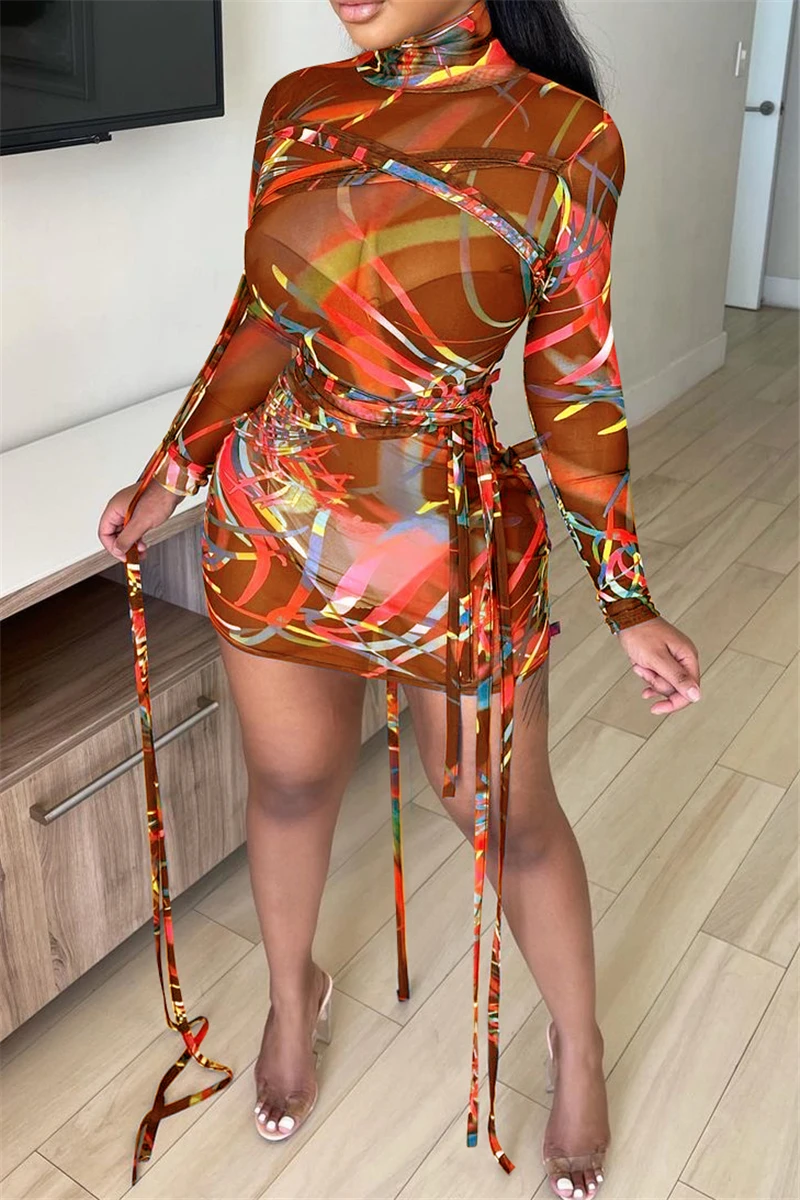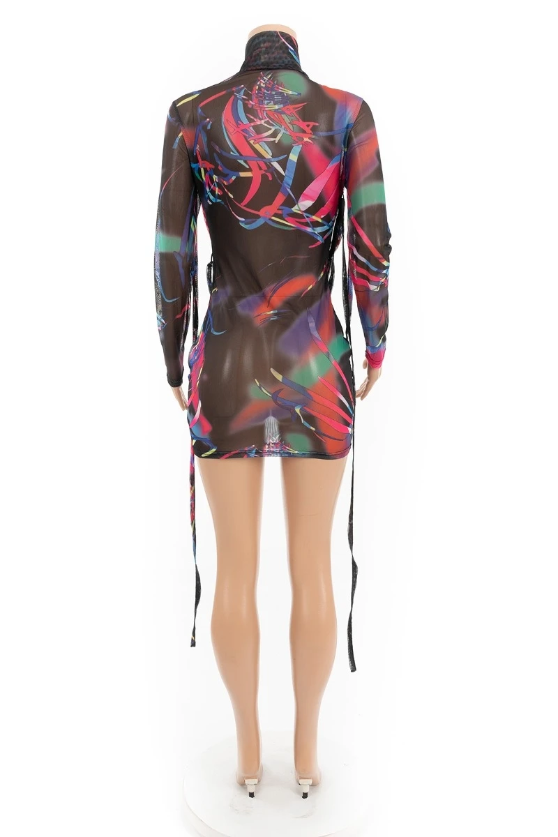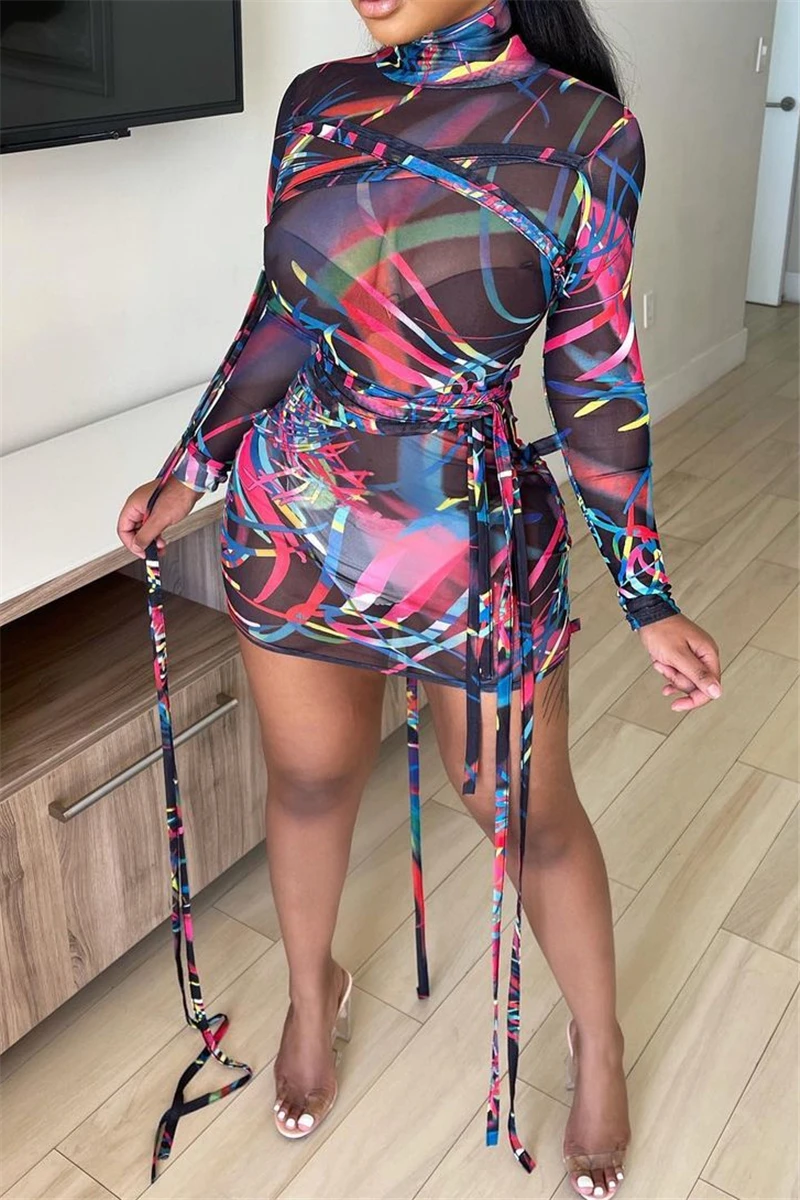 Plus size mesh see through batch printing high collar lace-up sexy slim dress (New add colors)