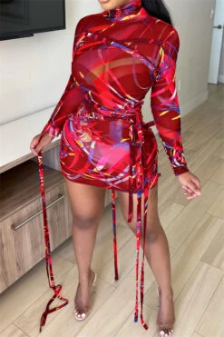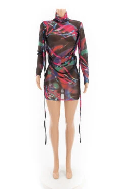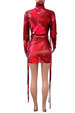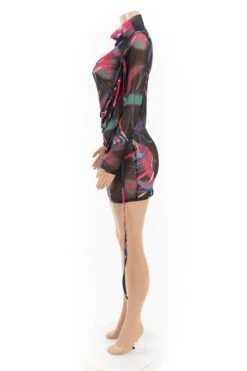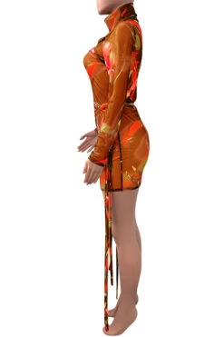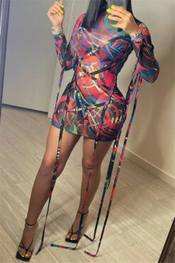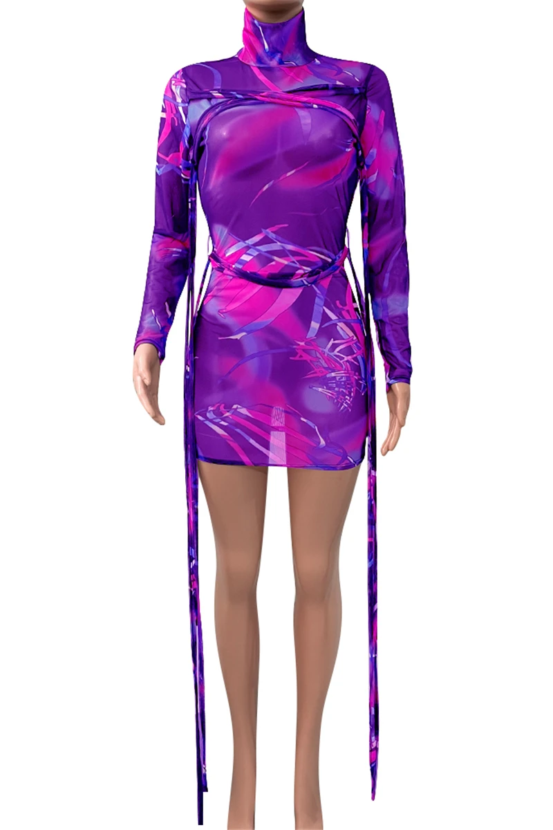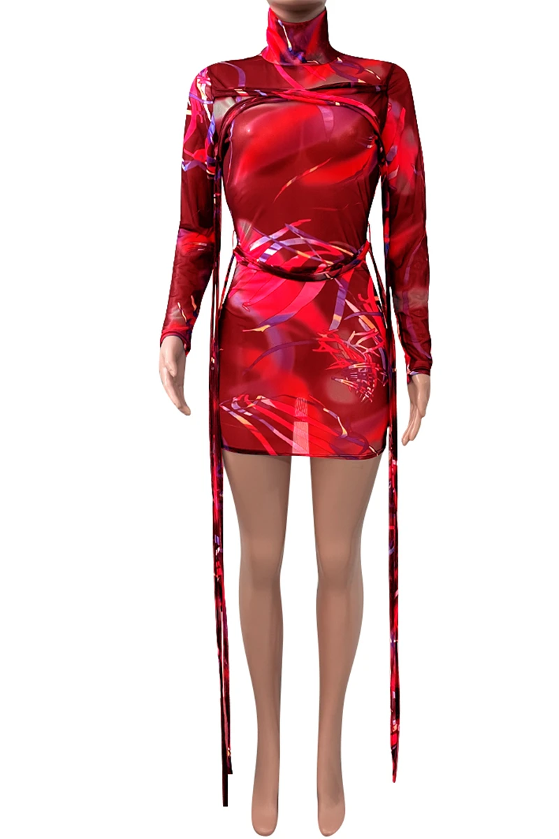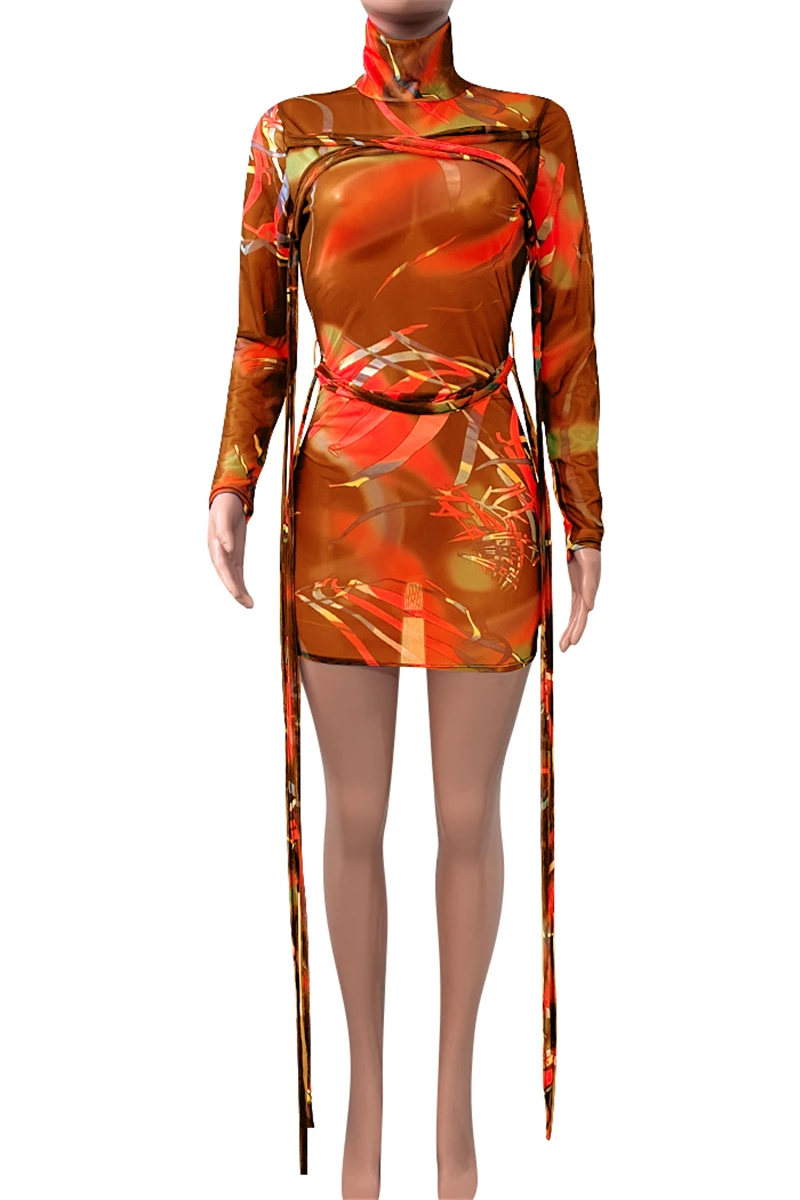 Plus size mesh see through batch printing high collar lace-up sexy slim dress (New add colors)