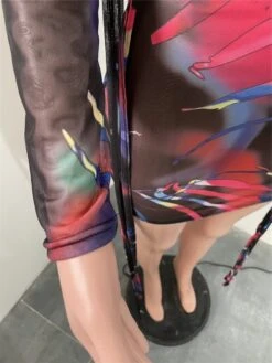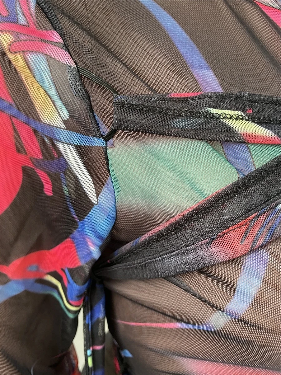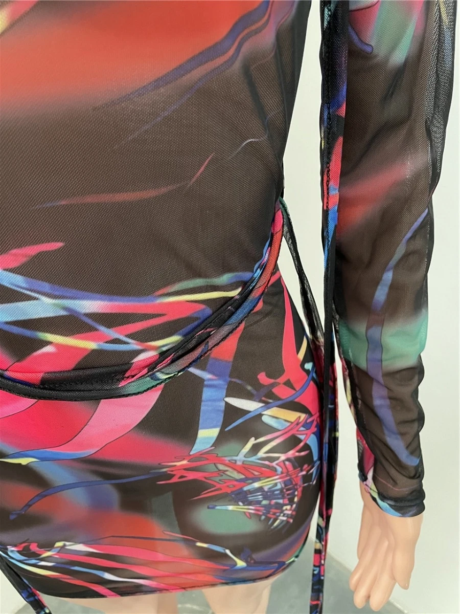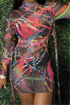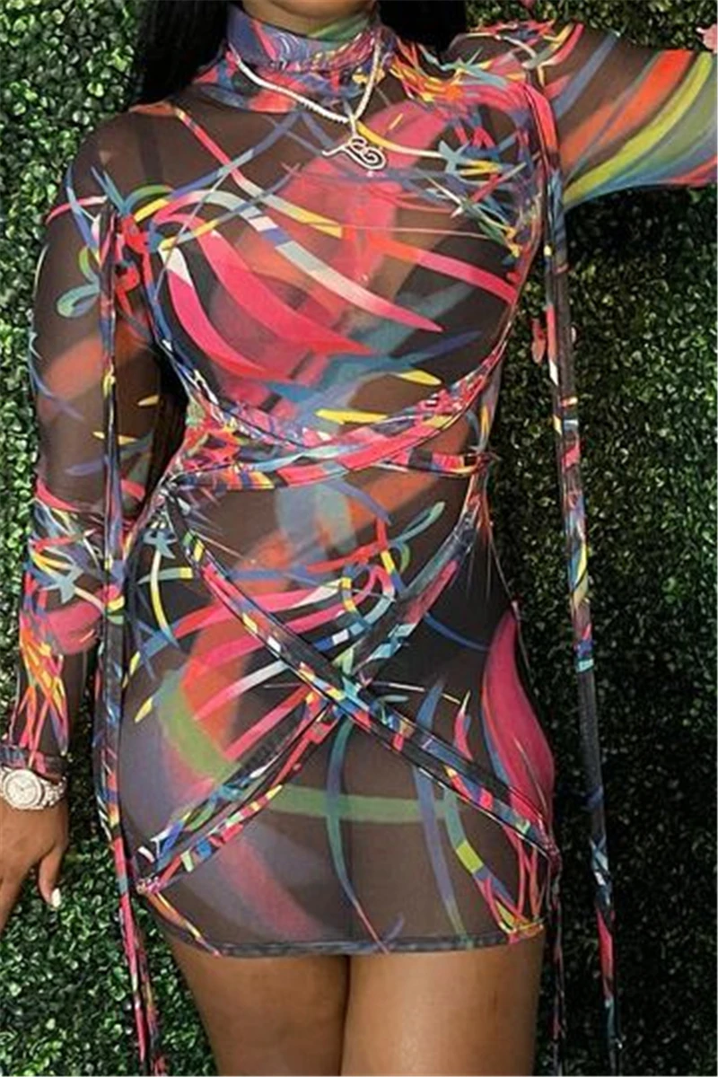 Plus size mesh see through batch printing high collar lace-up sexy slim dress