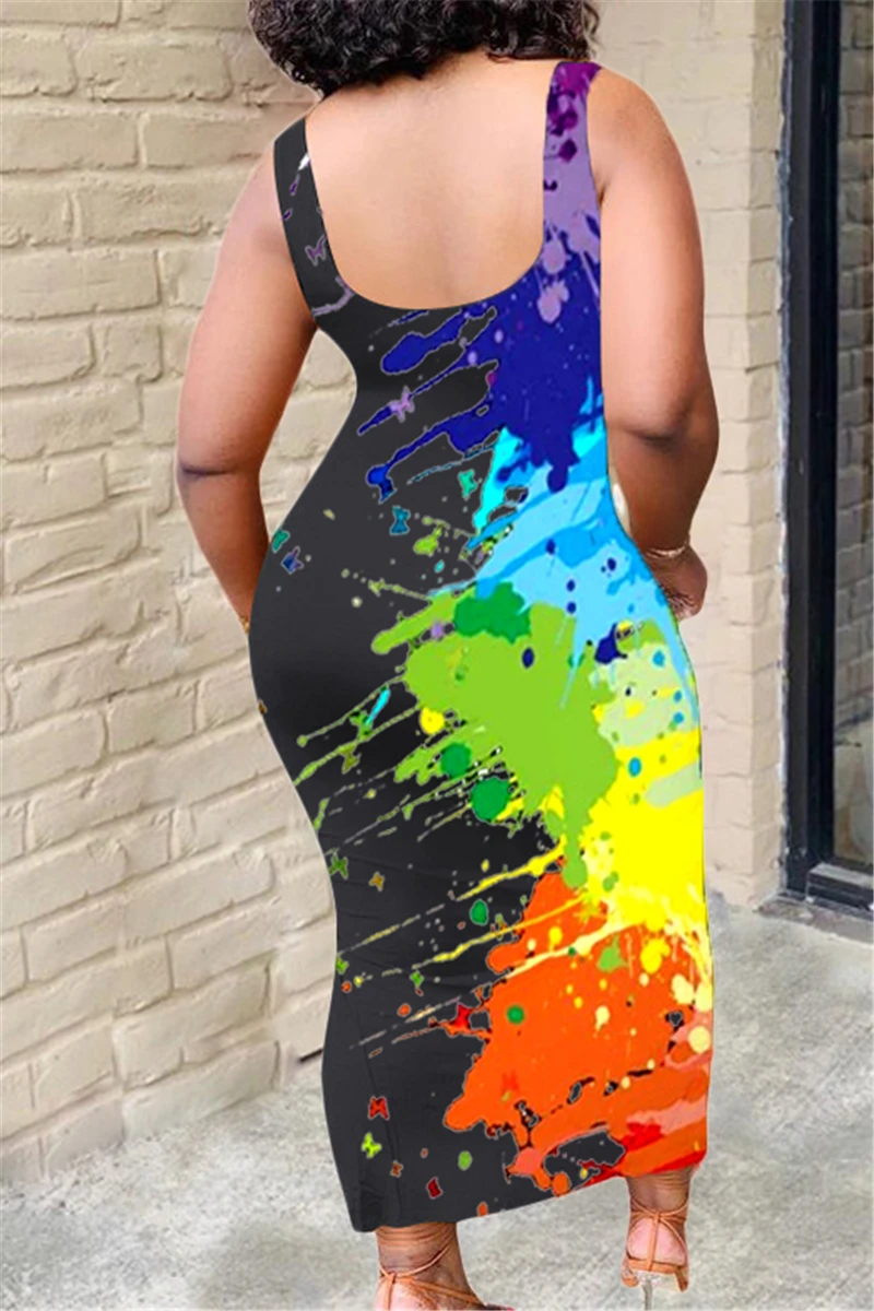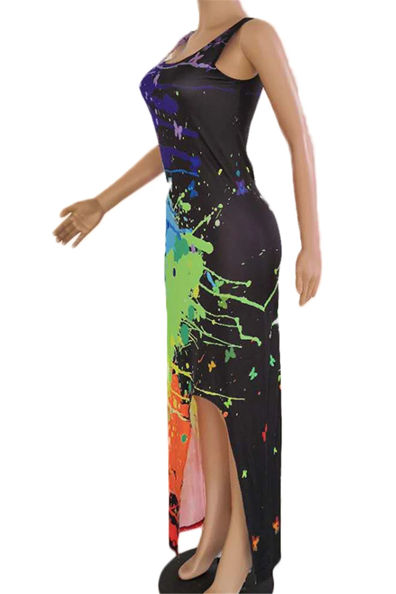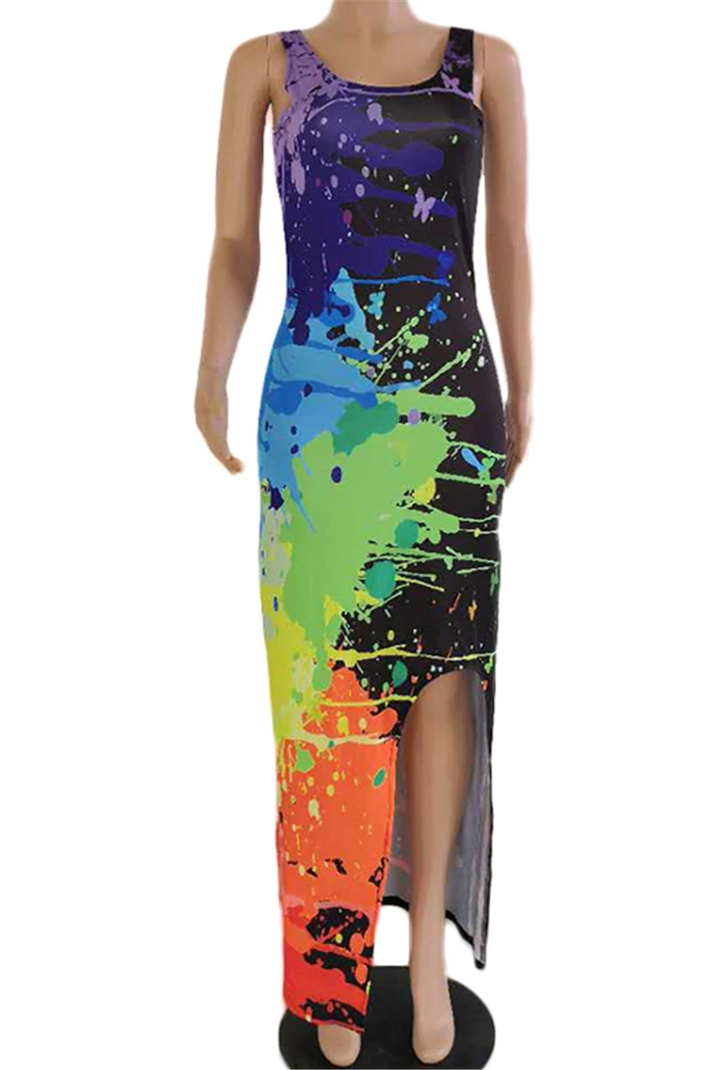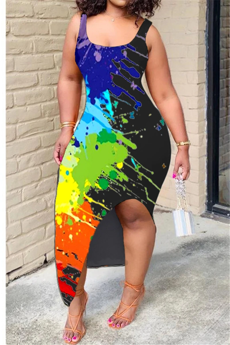 Plus size multicolor batch printing summer split stretch new fashion dress