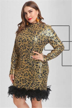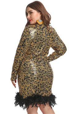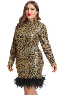 Plus size new stylish leopard batch printing spliced feather sequin stretch dress