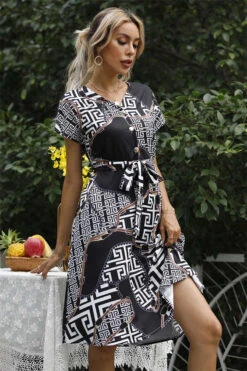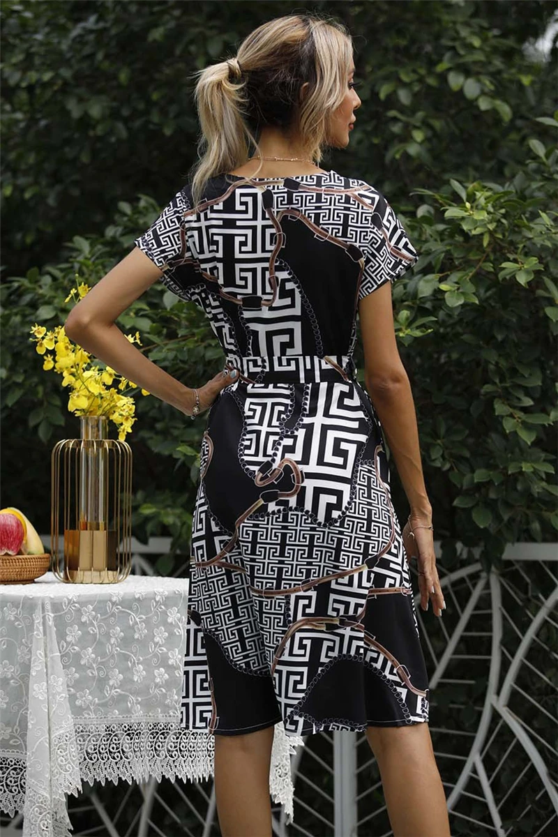 Plus size new stylish summer batch printing v-neck button dress (with belt) #5#