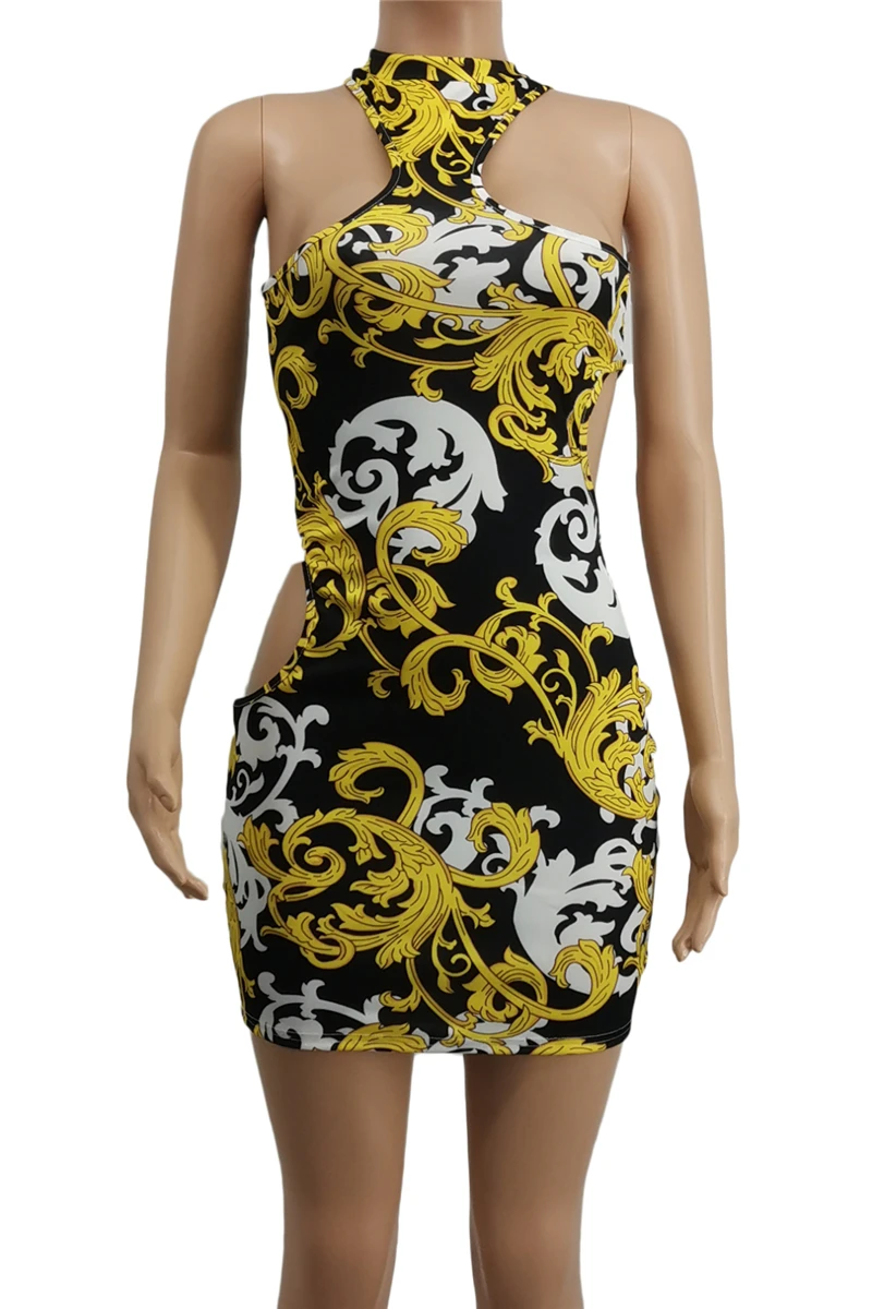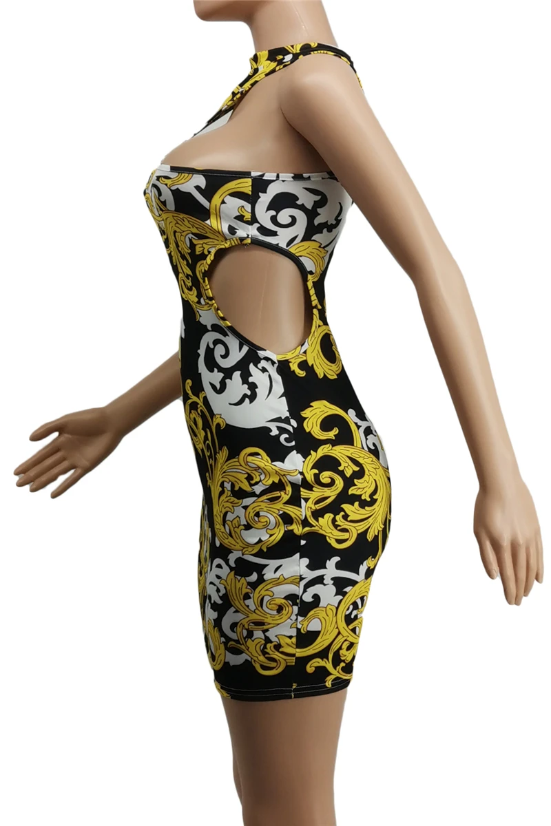 Plus size night club style sleeveless batch printing hollow slim mini dress#3#