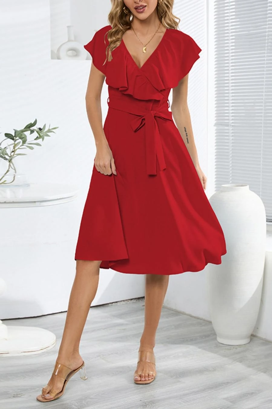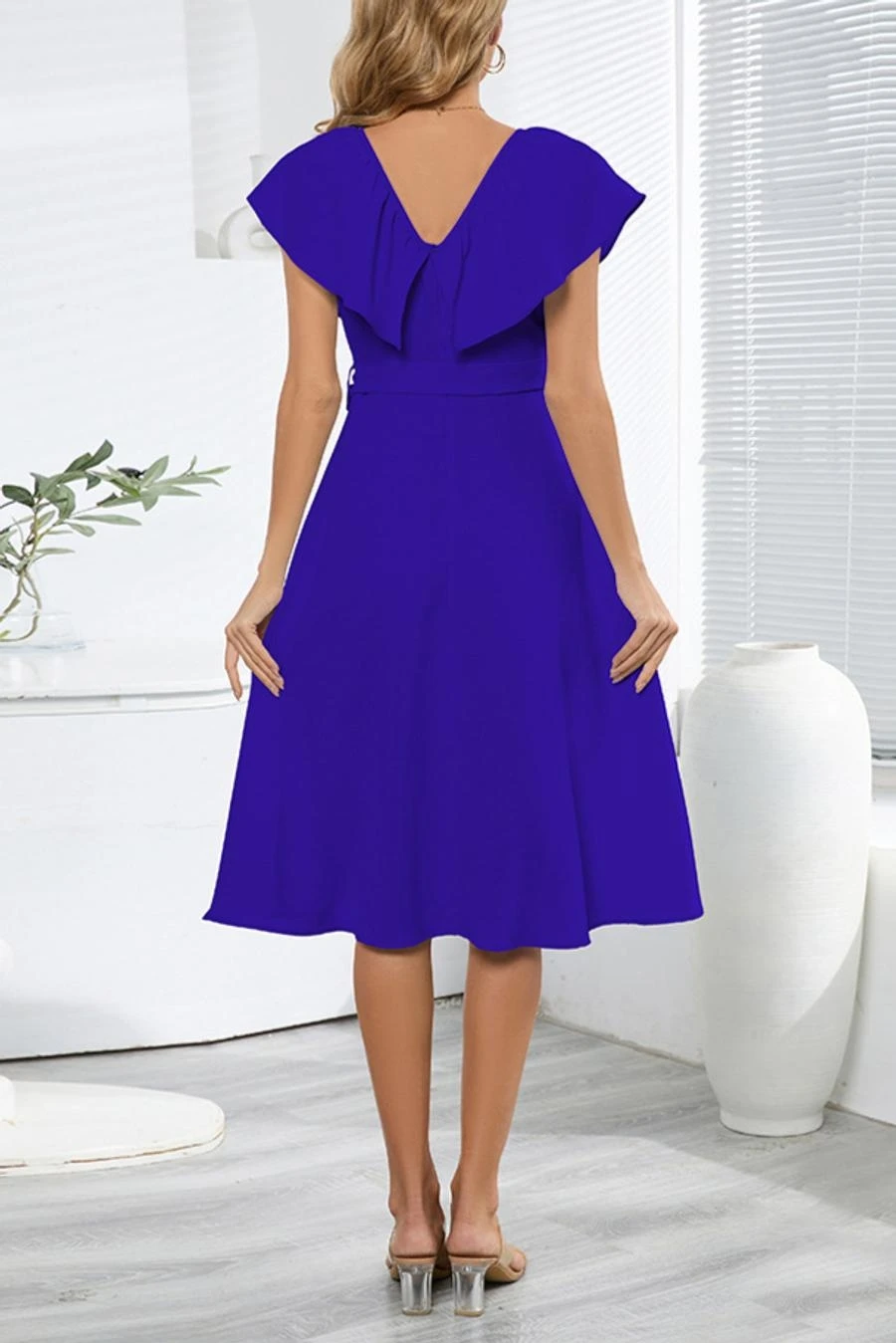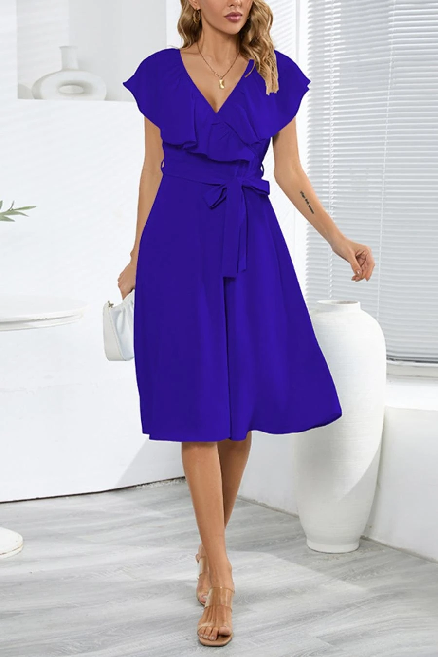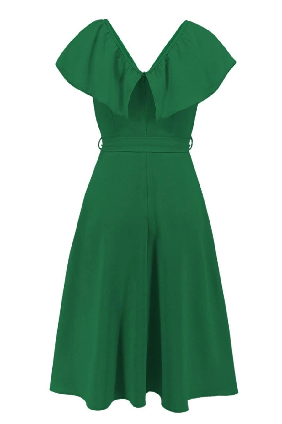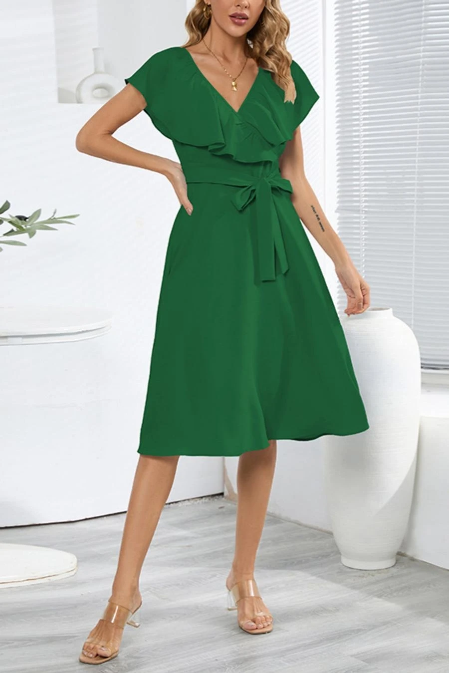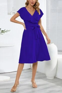Plus size non-stretch 4 colors solid zip-up belt ruffled stylish midi dress
