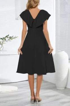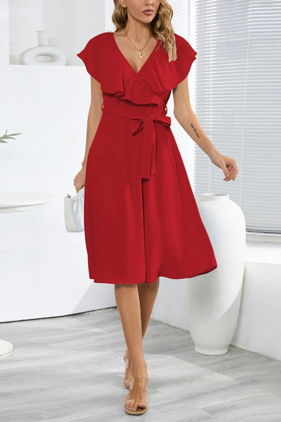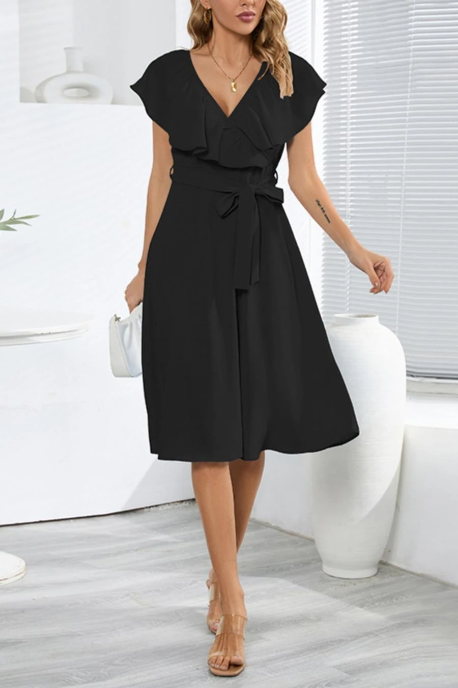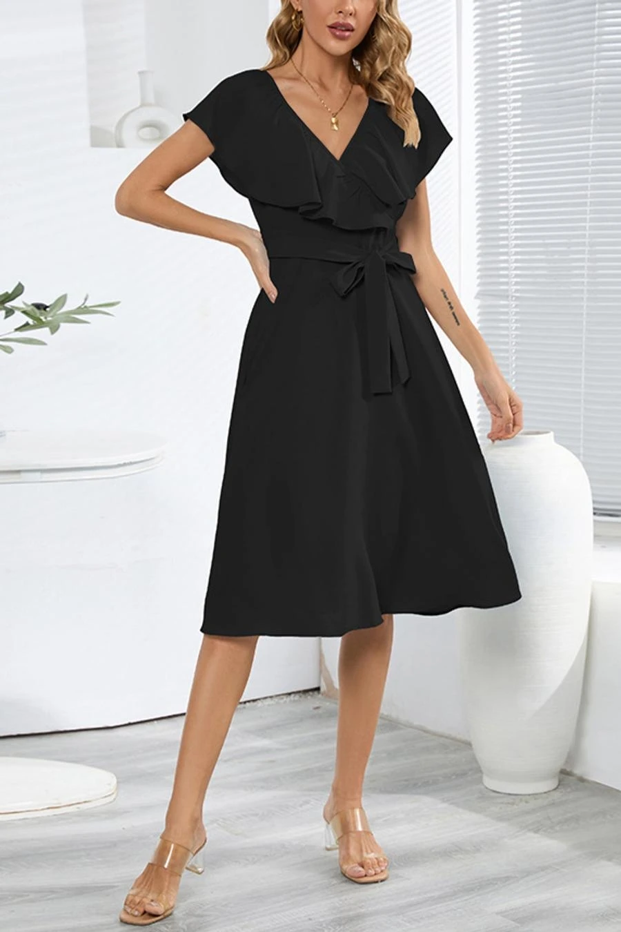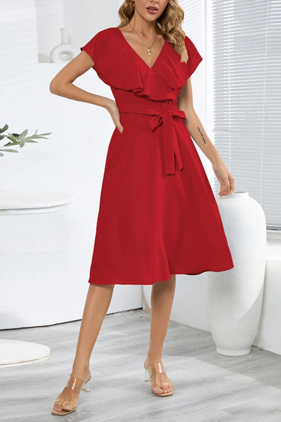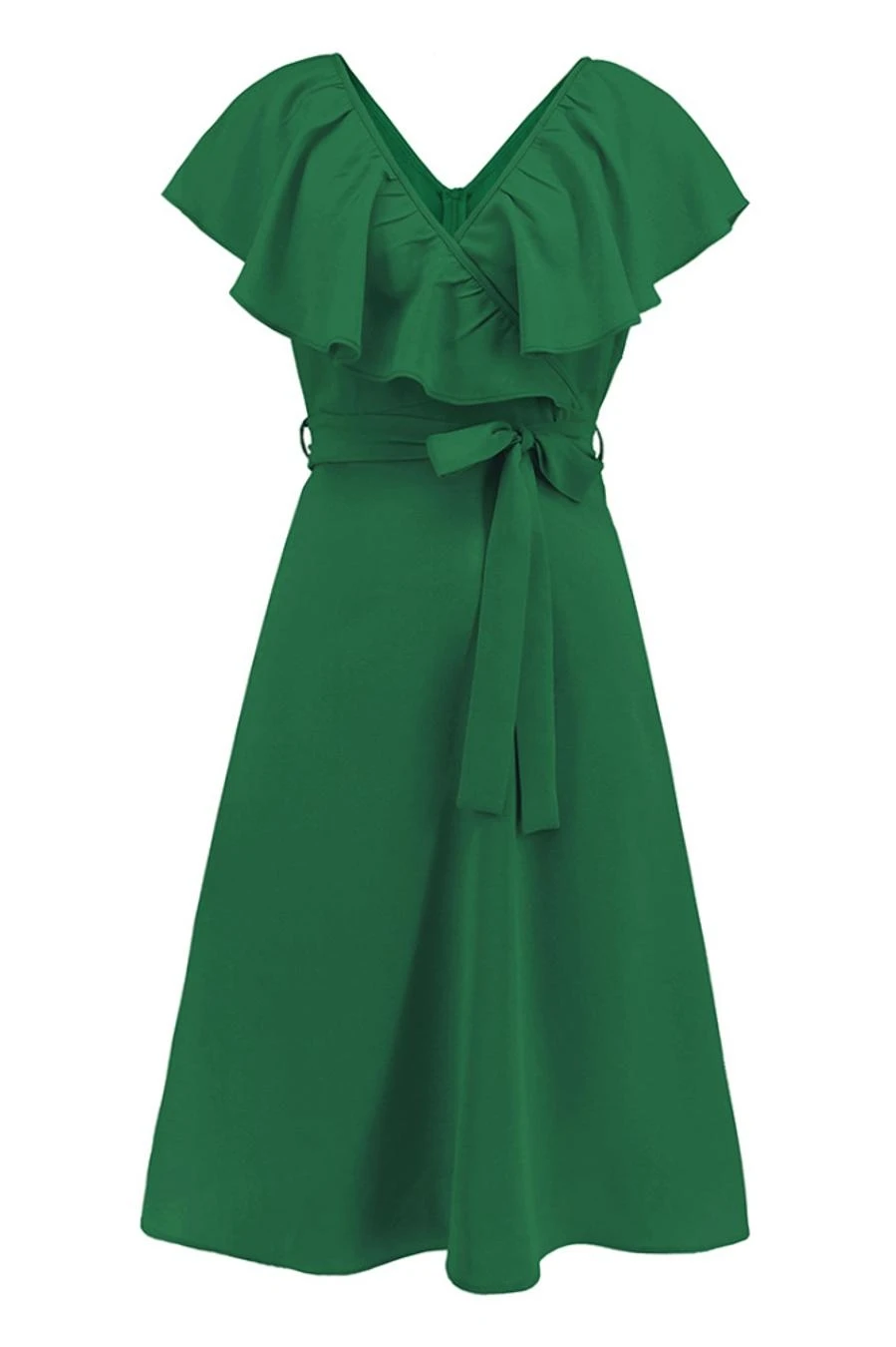 Plus size non-stretch 4 colors solid zip-up belt ruffled stylish midi dress