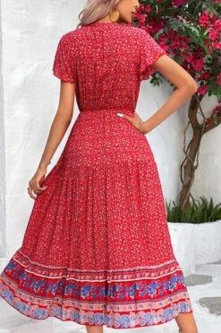 Plus size non-stretch floral printing patchwork button v-neck stylish midi dress