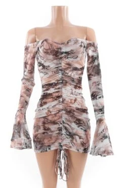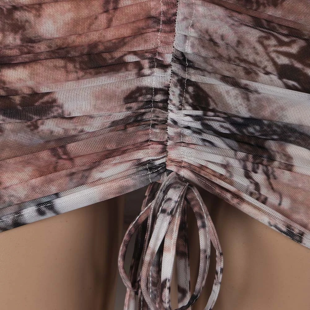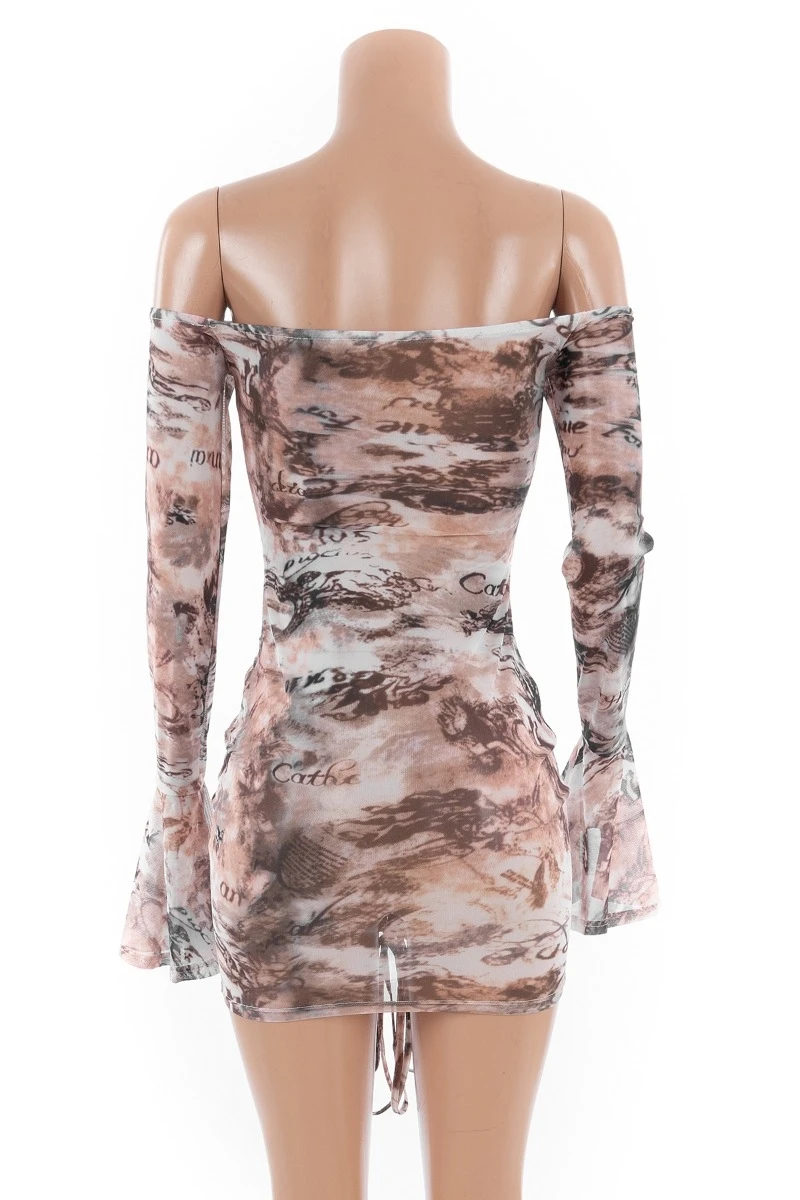 Plus size off-shoulder mesh sexy drawstring batch printing stretch slim dress