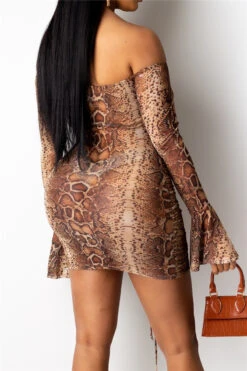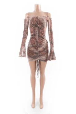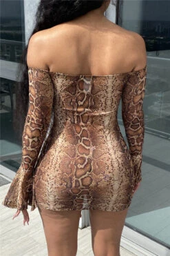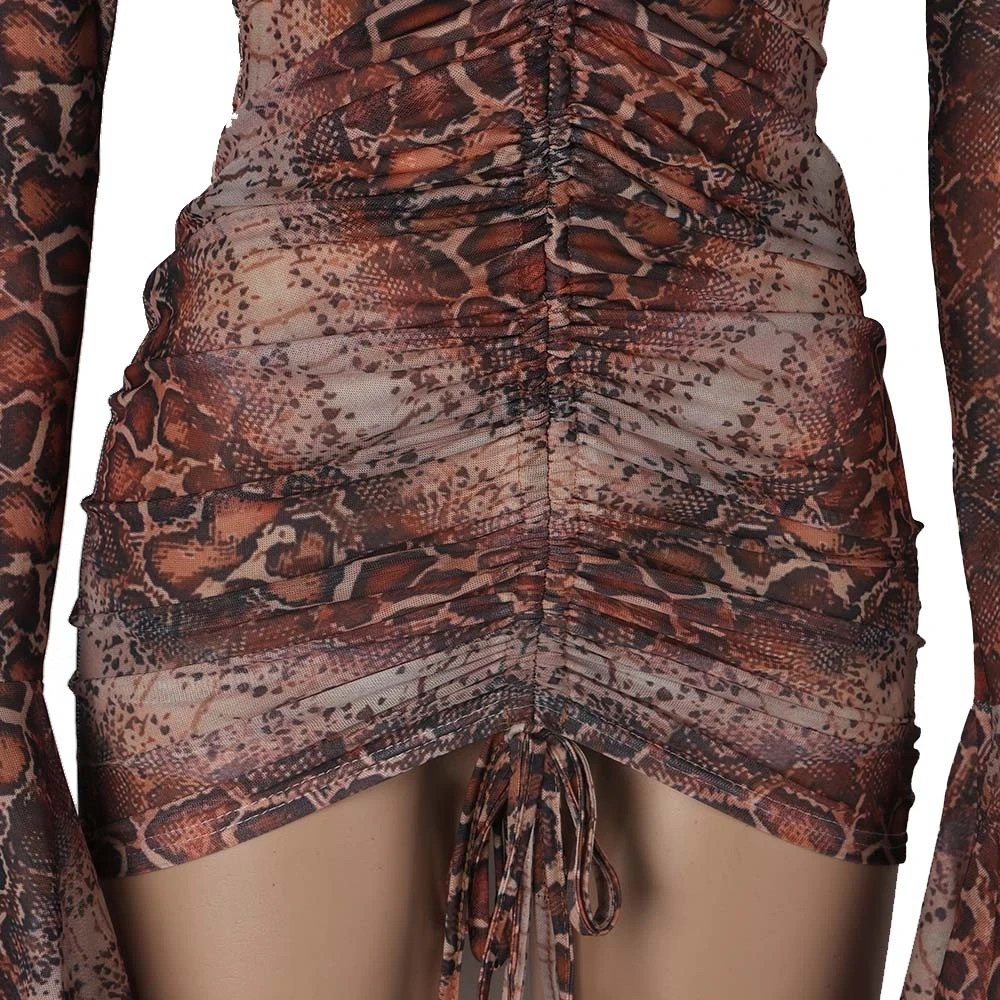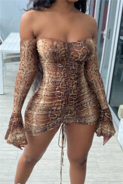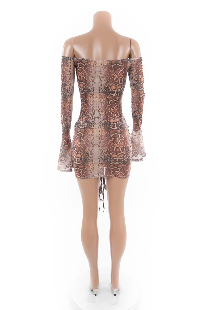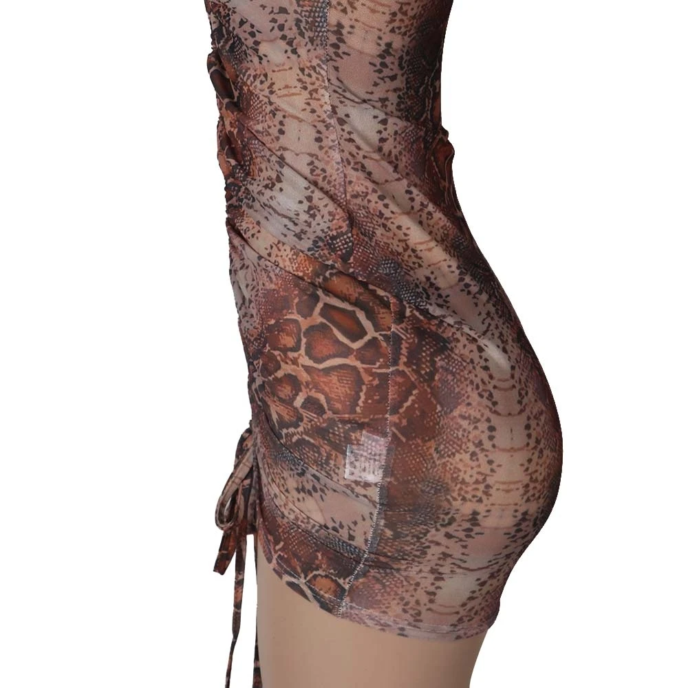 Plus size off-shoulder mesh sexy drawstring snakeskin batch printing stretch slim dress