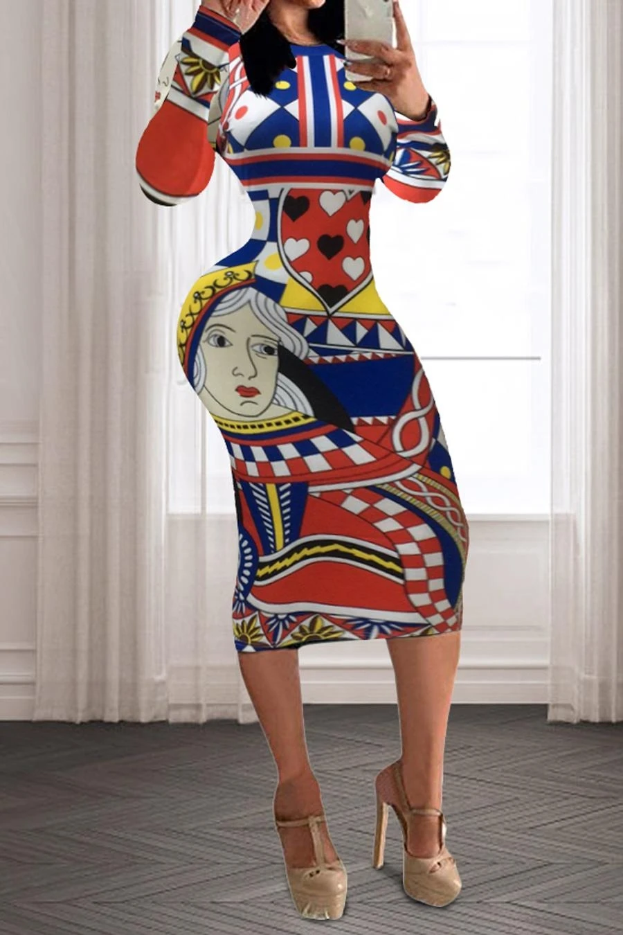 Plus size poker fixed printing stretch crew neck slim stylish midi dress