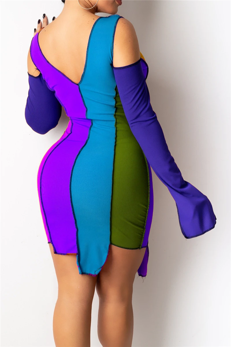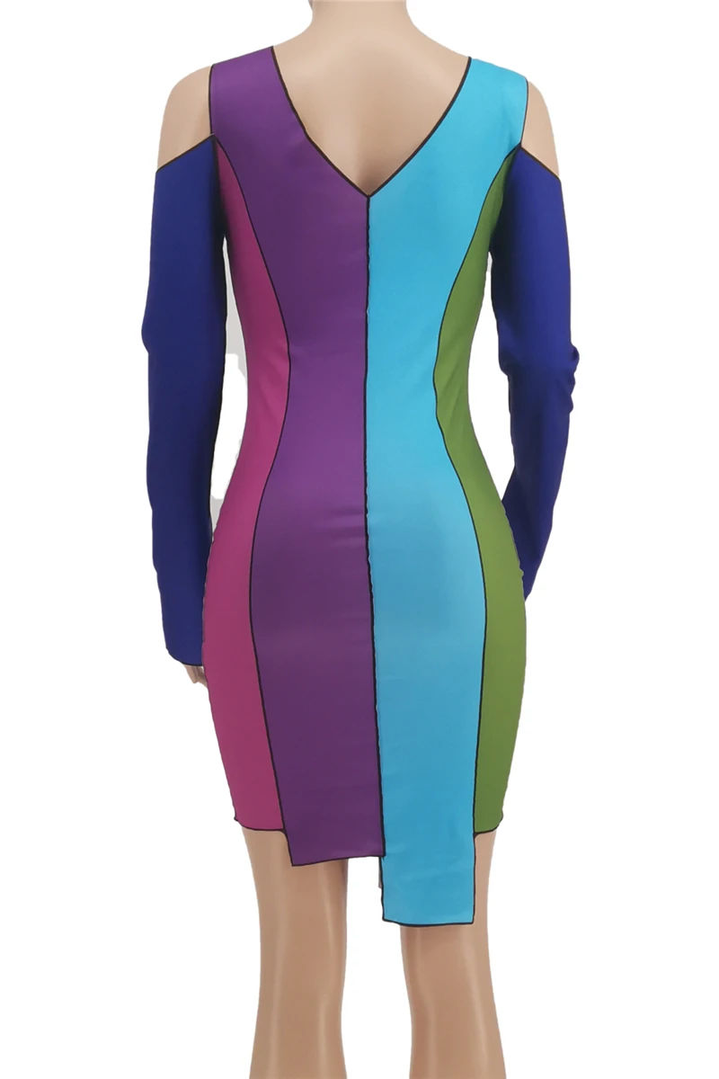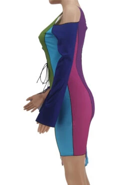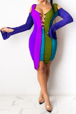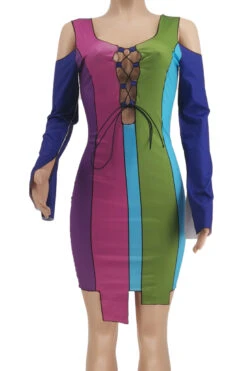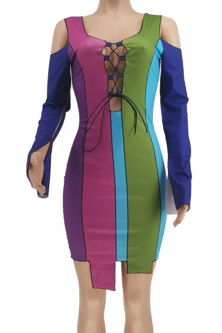 Plus size sexy contrast color printing hollow out lace-up autumn slim dress