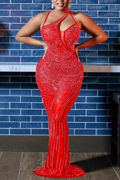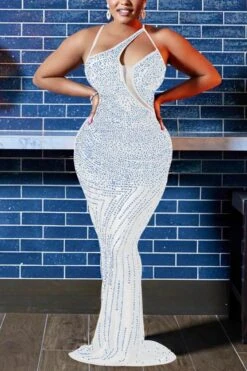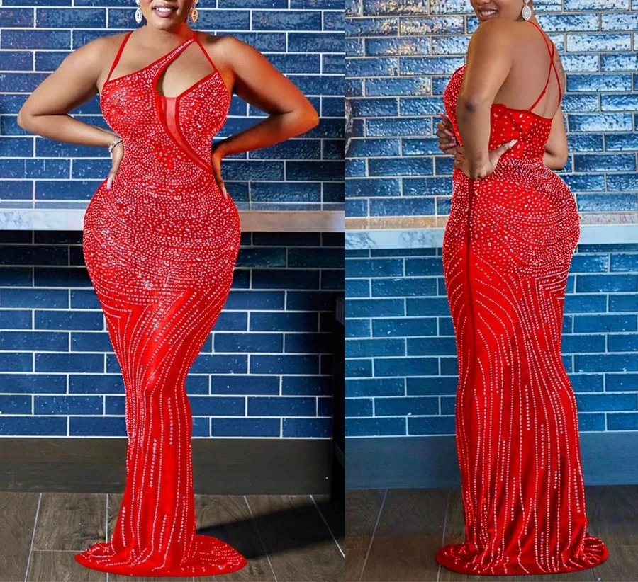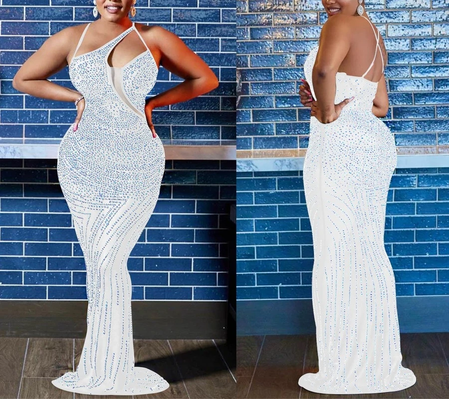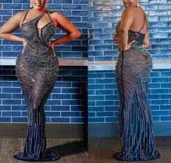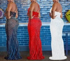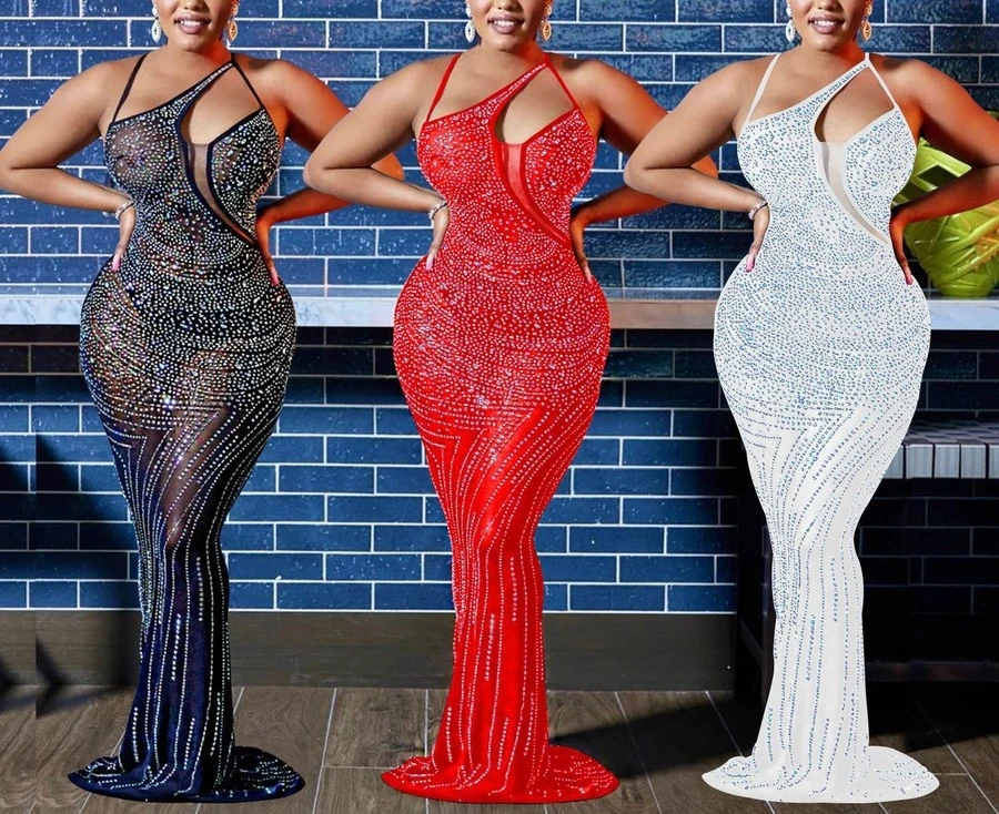 Plus size slight stretch 3-colors rhinestone mesh sexy maxi dress(with panties)