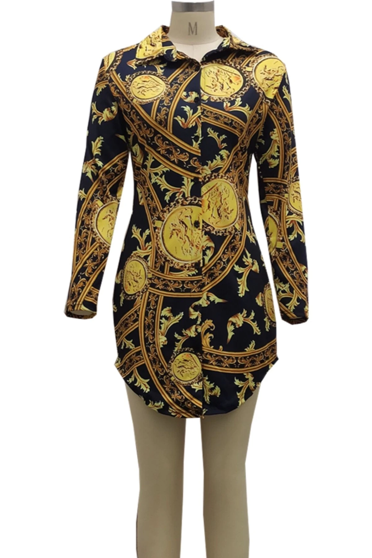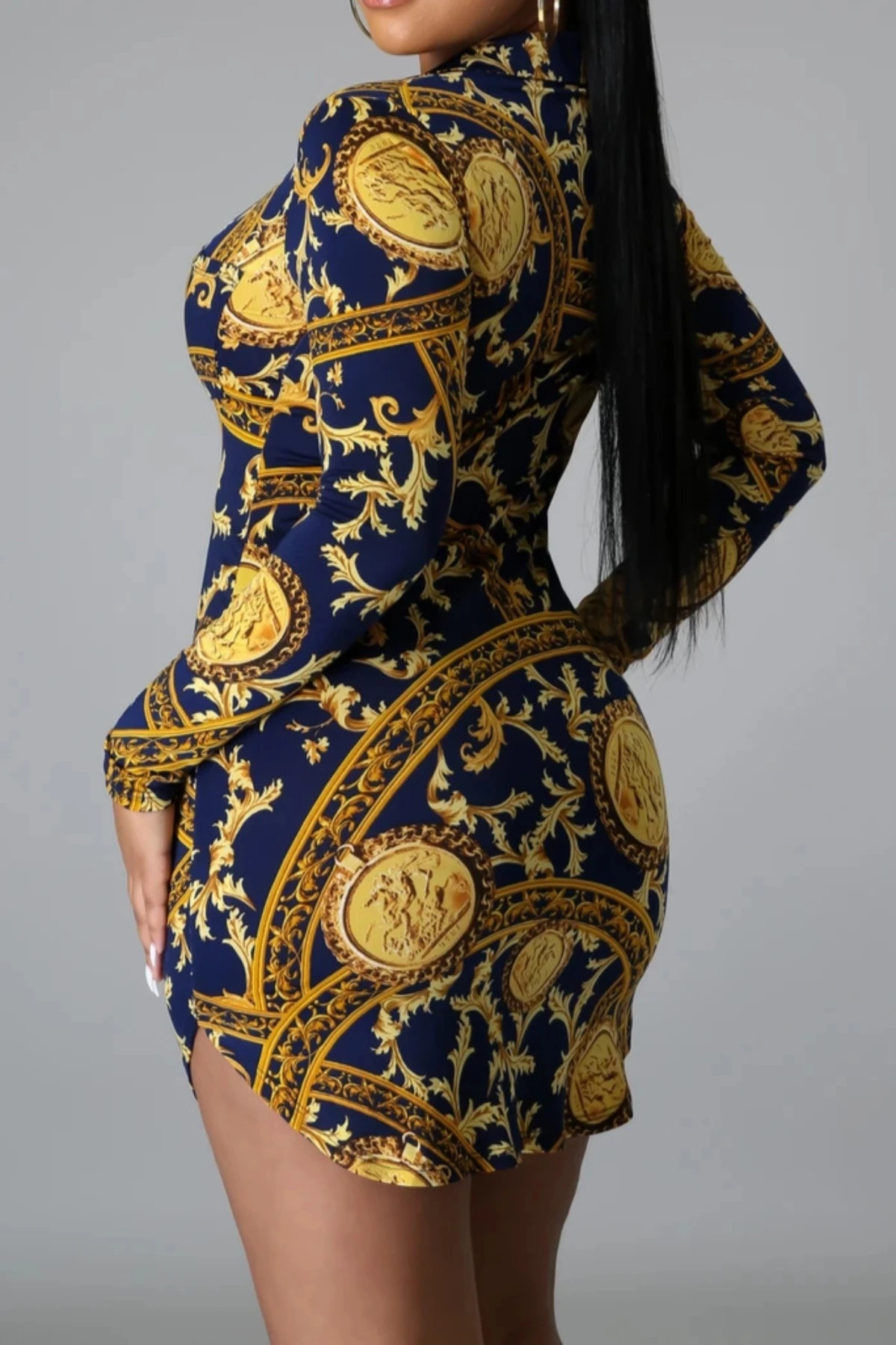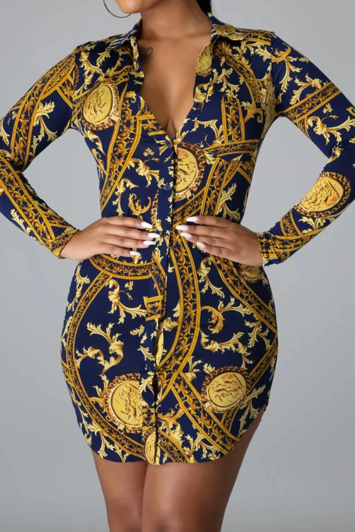 Plus size spring autumn single breasted pattern batch printing new micro elastic mini dress