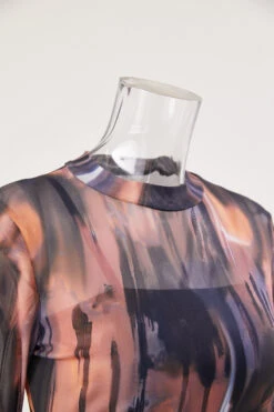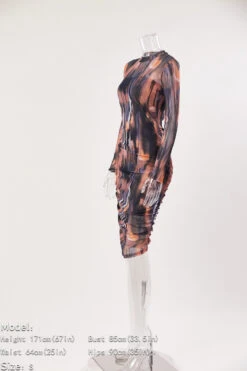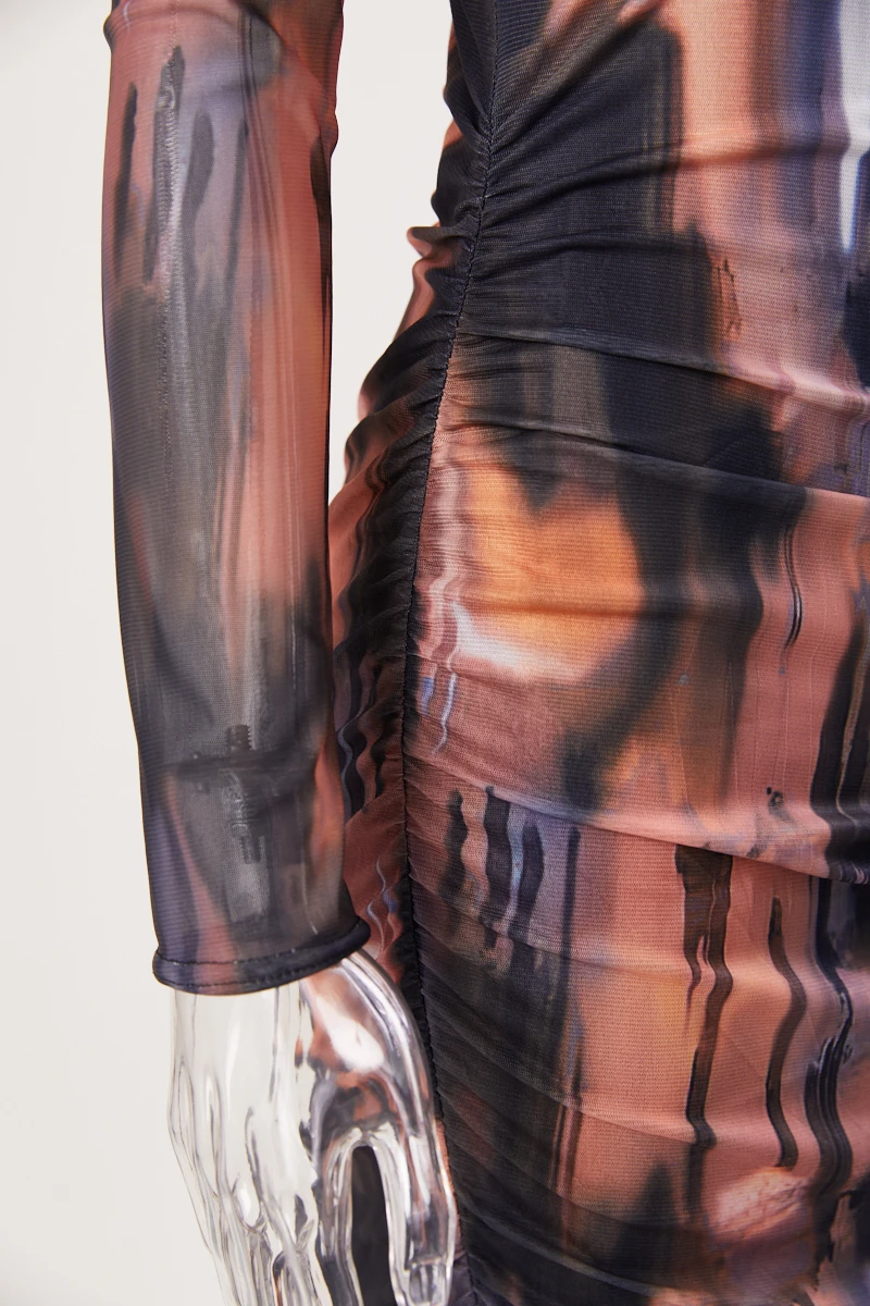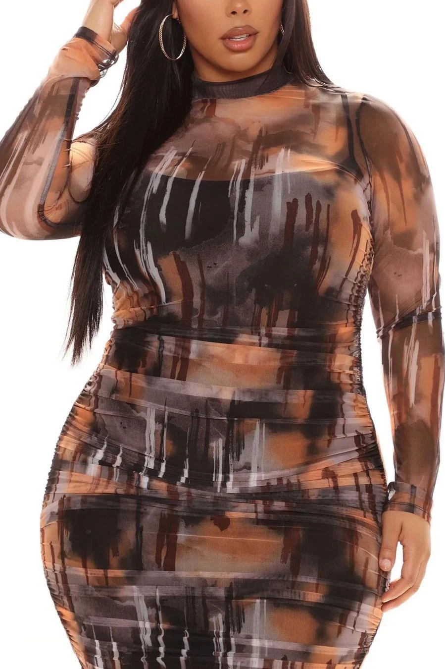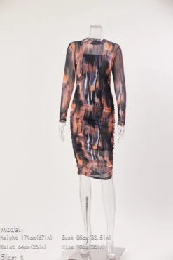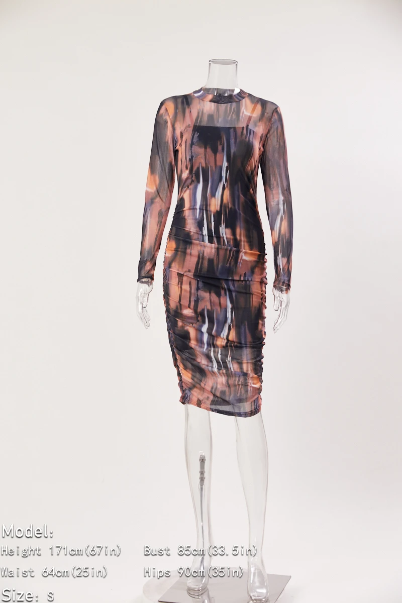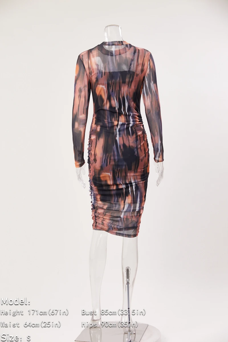 Plus size stretch multicolor print mesh shirring midi dress(with sling base)#1