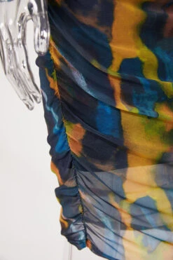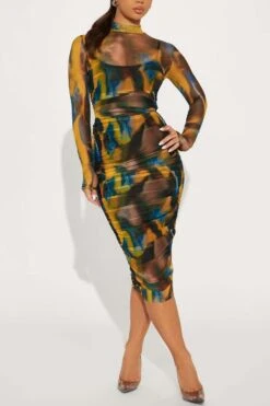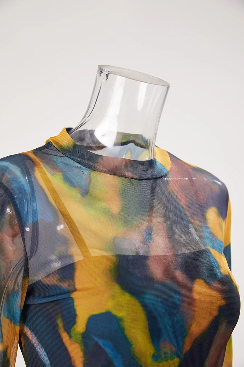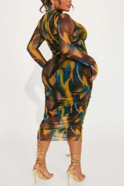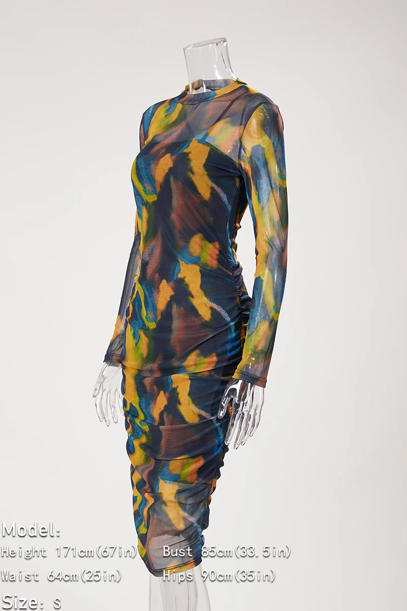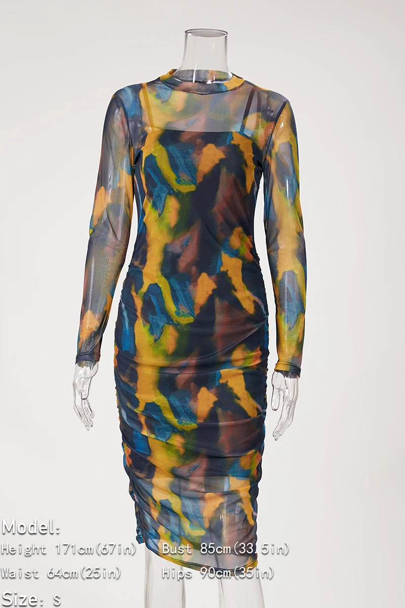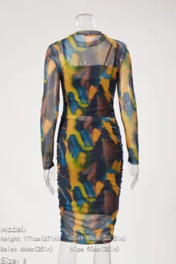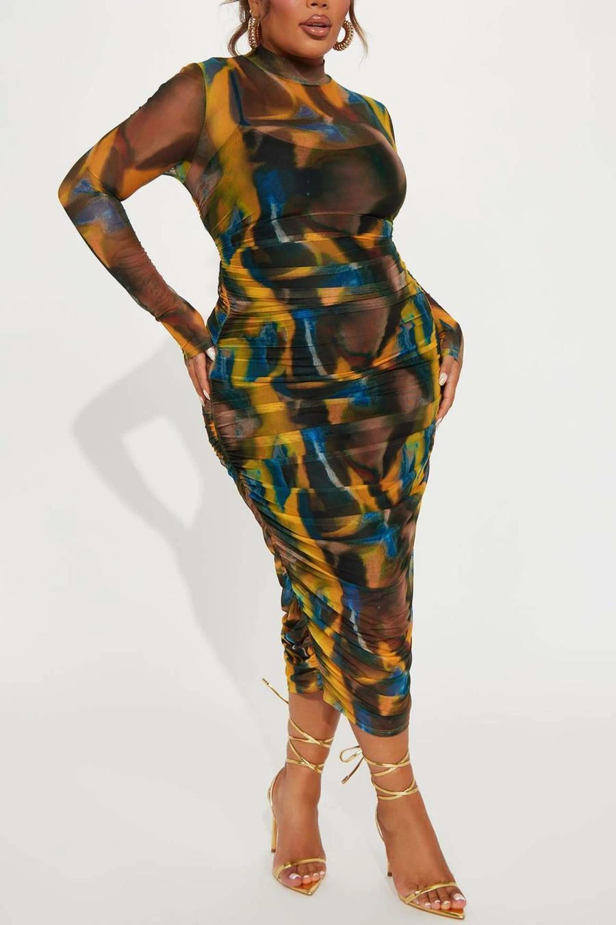 Plus size stretch multicolor print mesh shirring midi dress(with sling base)#4
