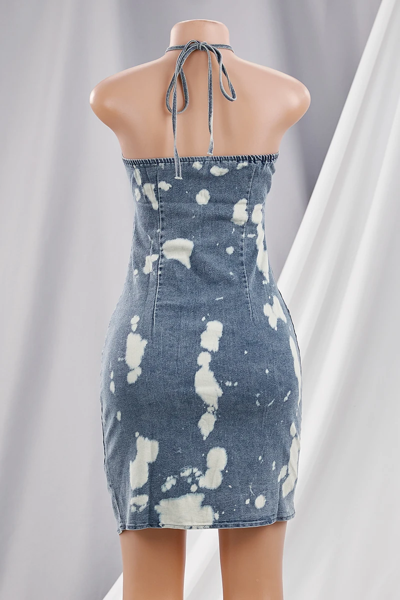 Plus-size summer denim batch printing cutout zip-up halter-neck backless irregular tight mini dress