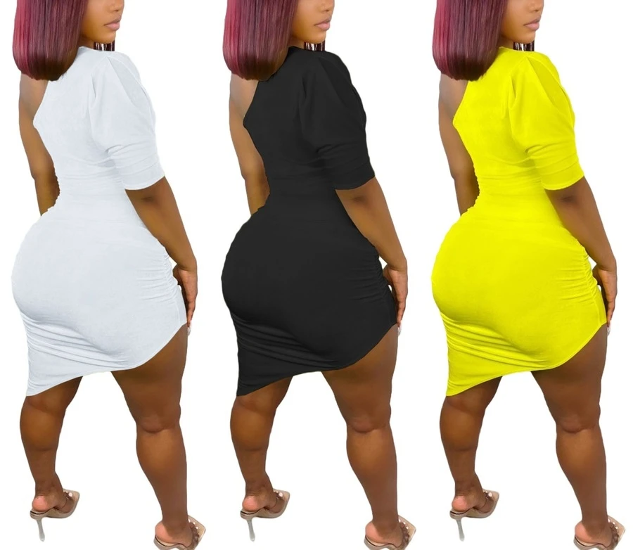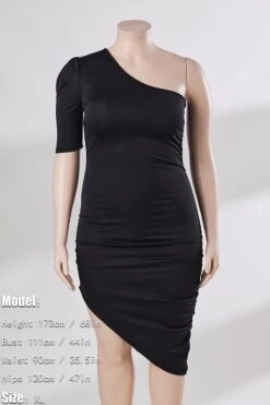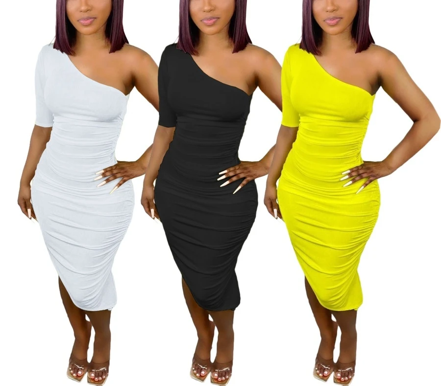 Plus size summer three colors sexy classic solid color one shoulder irregular shirring micro-elastic midi dress
