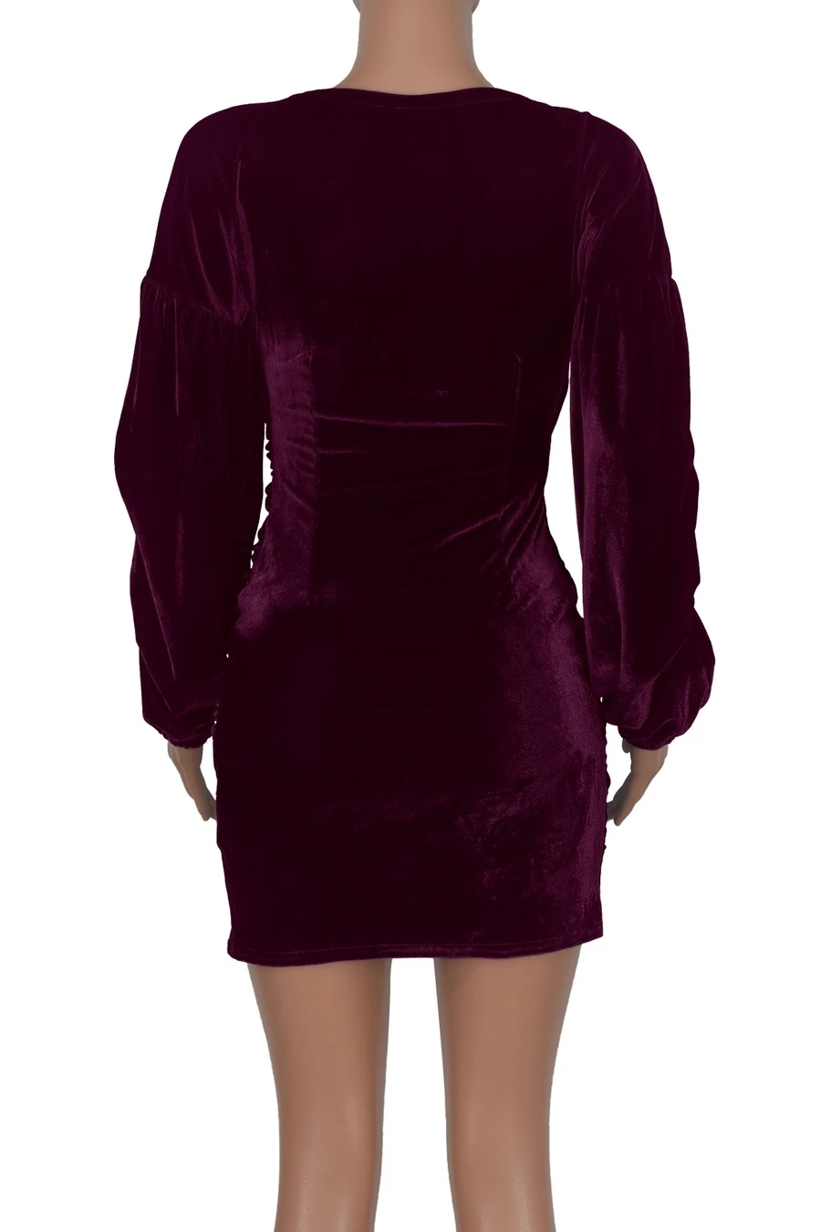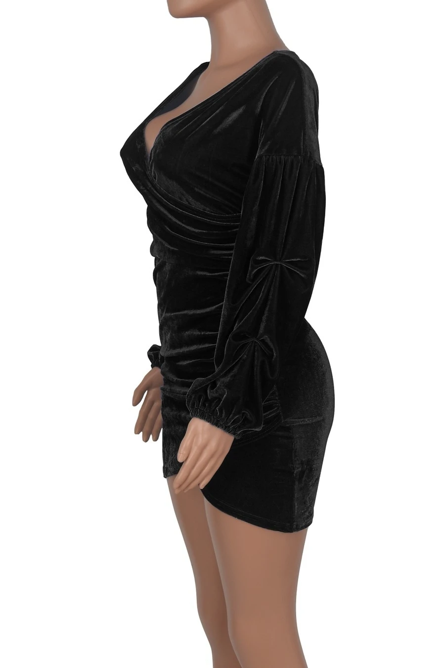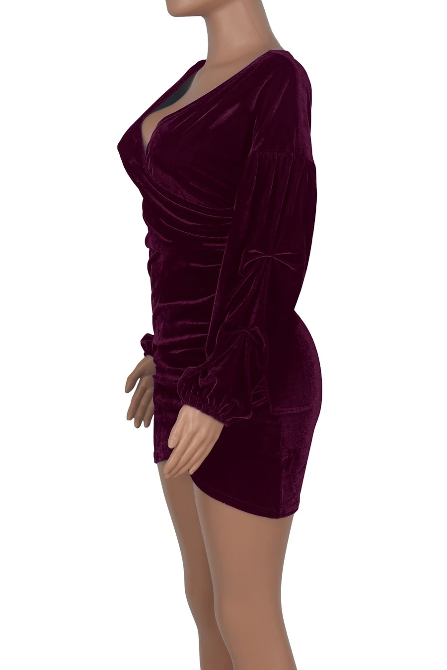S-2XL autumn new plus size 3 colors solid color velvet high stretch v-neck long sleeves ruched sexy bodycon mini dress