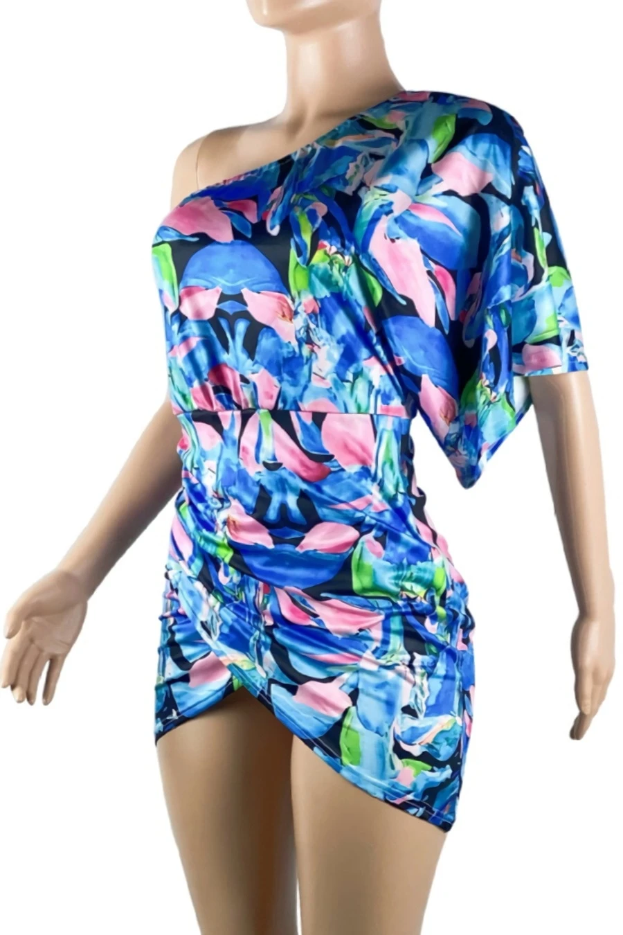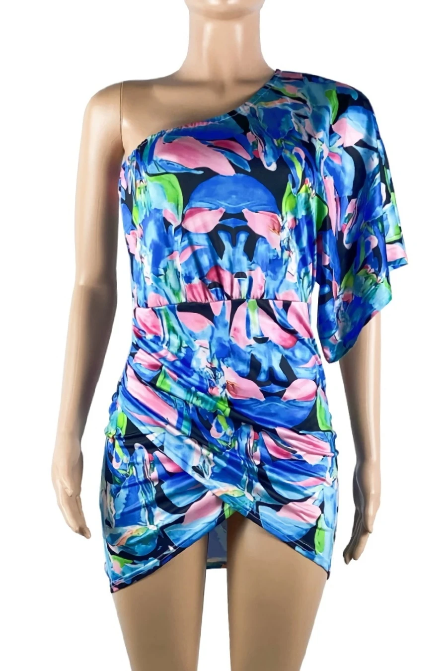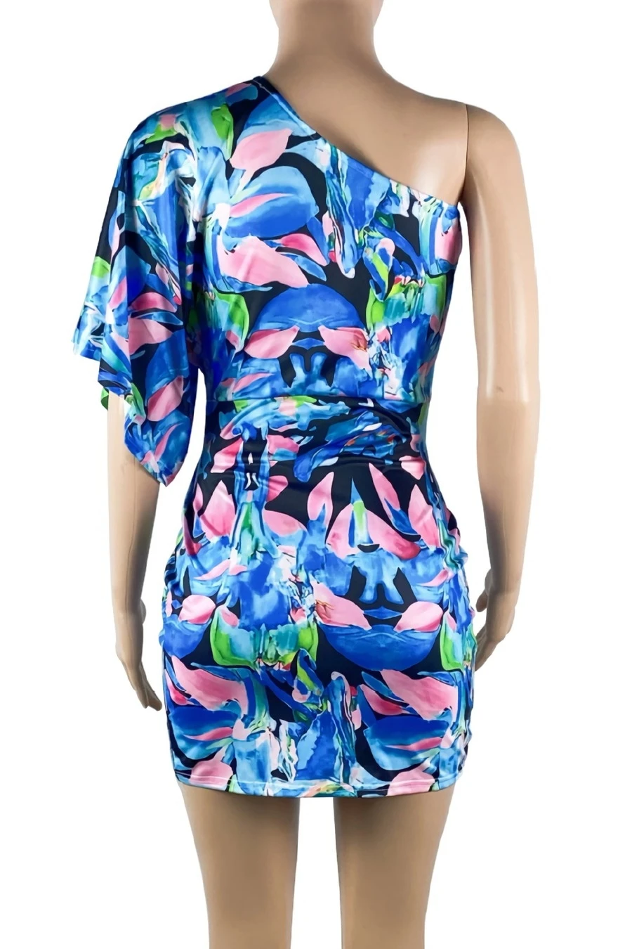 S-2XL plus size summer new stylish two colors batch printing one shoulder short sleeve shirring sexy mini dress
