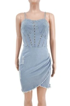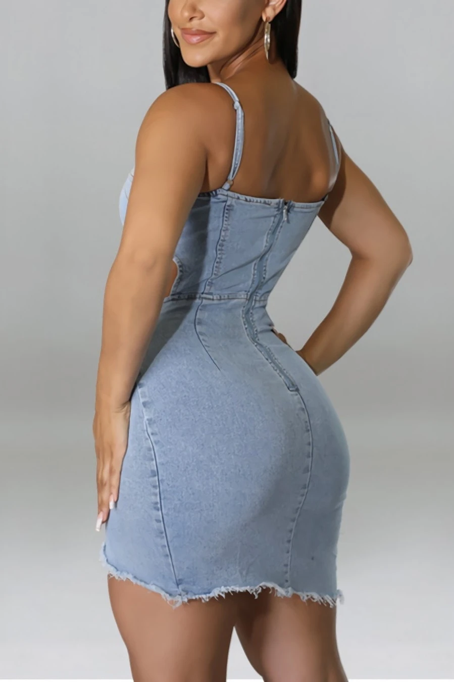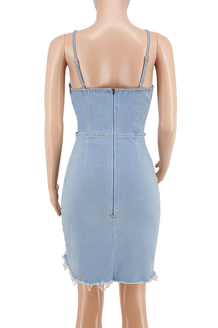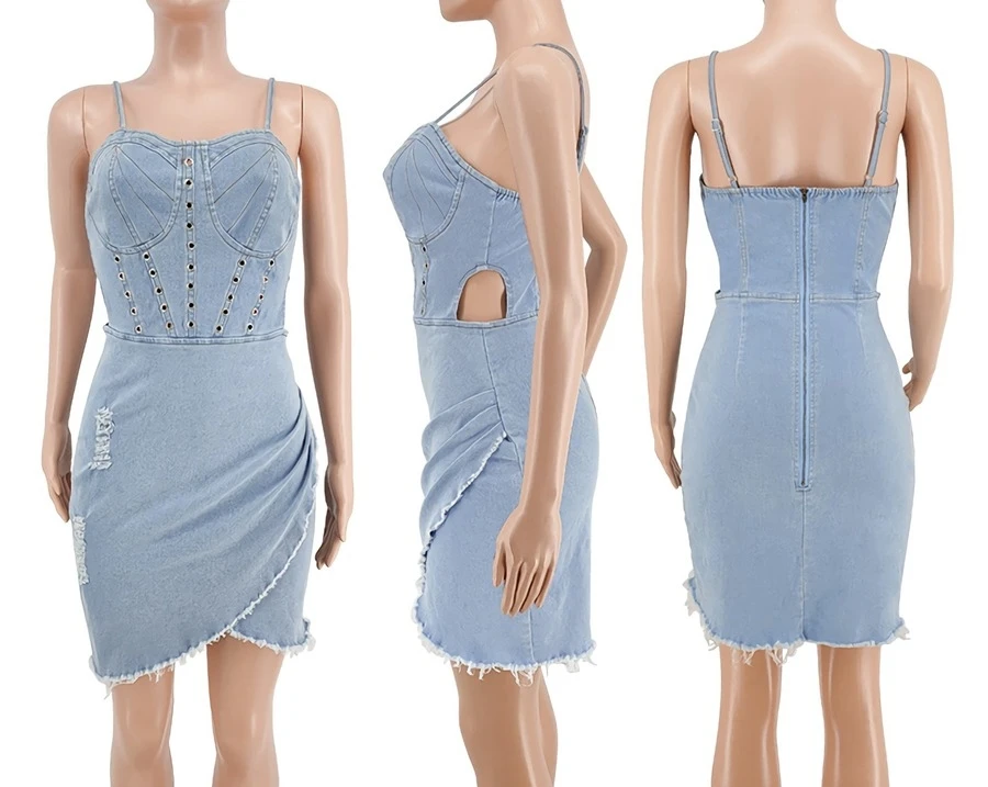 S-2XL summer new plus size 3 colors micro-elastic backless sling hollow out zip-up asymmetrical raw edge sexy bodycon denim mini dress