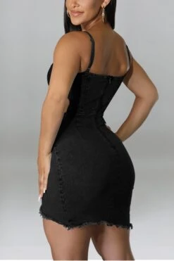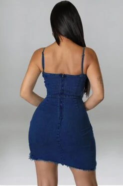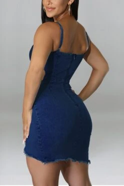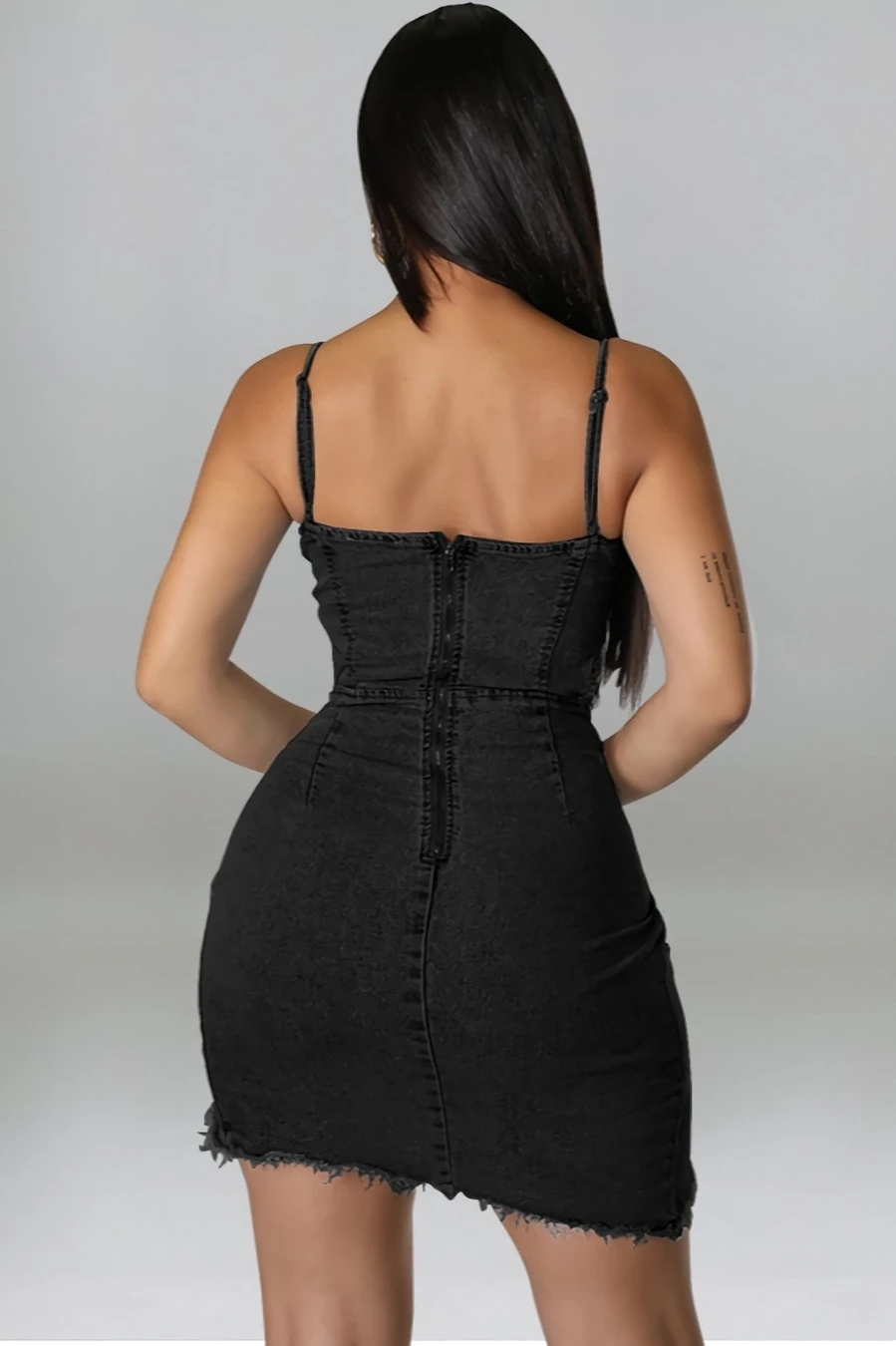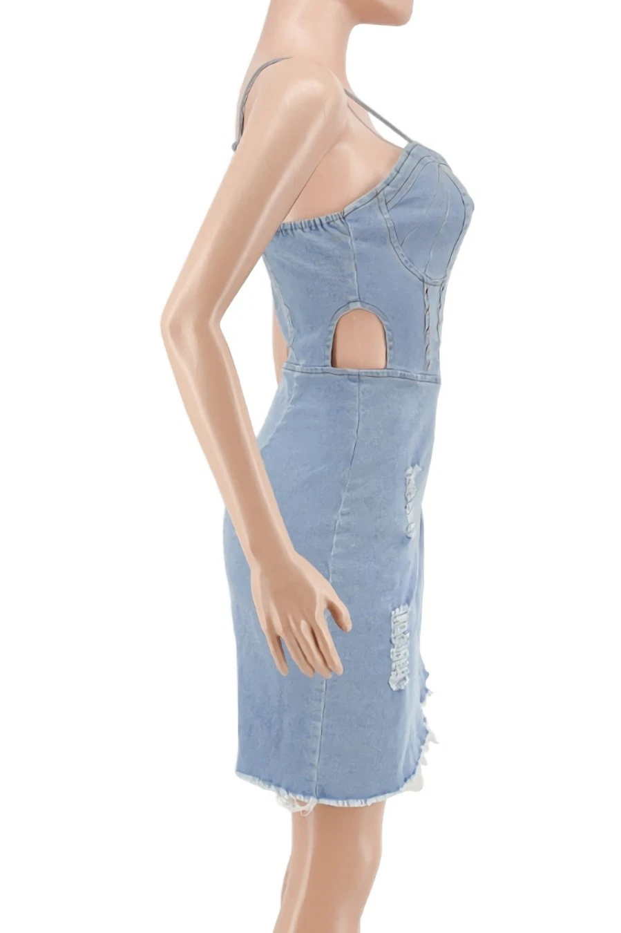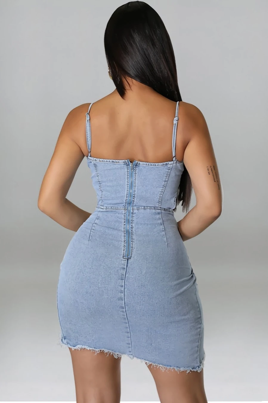 S-2XL summer new plus size 3 colors micro-elastic backless sling hollow out zip-up asymmetrical raw edge sexy bodycon denim mini dress