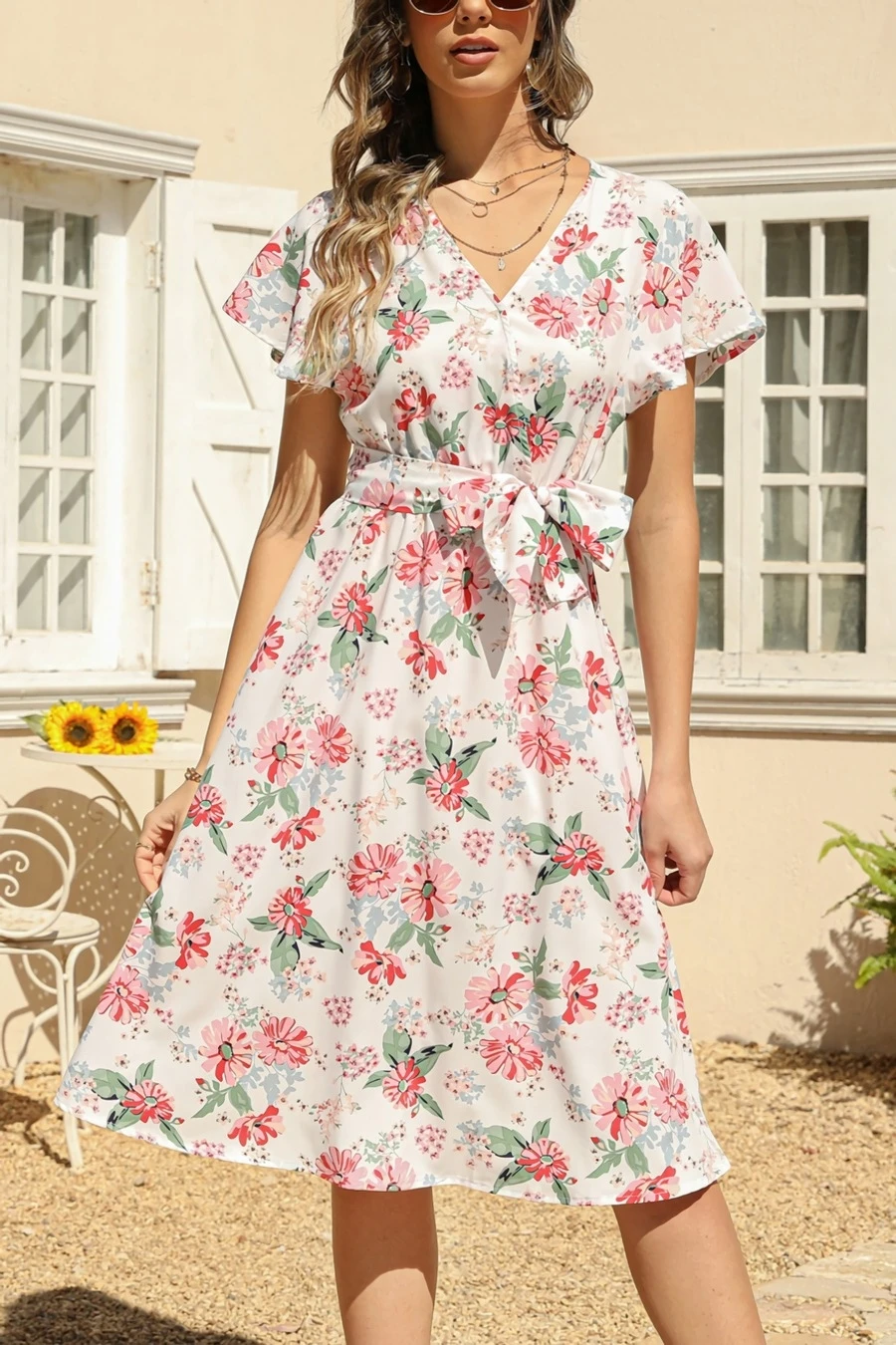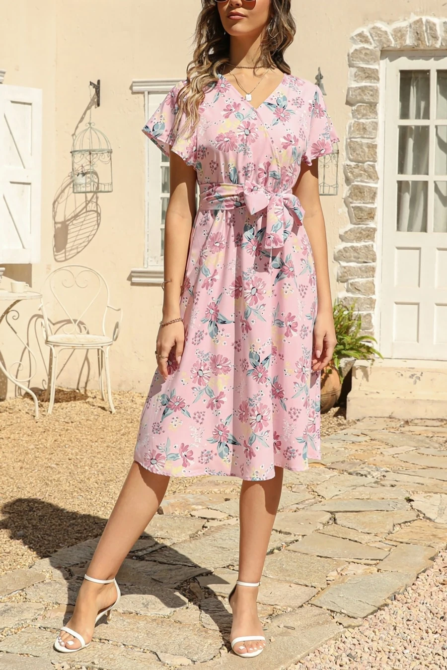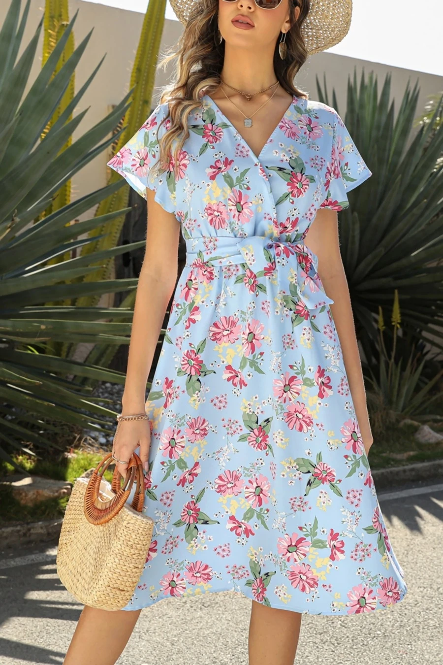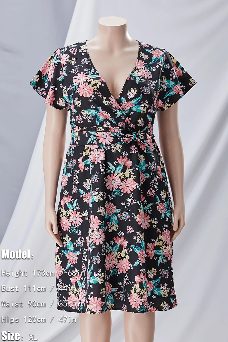 S-2XL summer new plus size 4 colors flower batch printing inelastic chiffon v-neck stylish vacation style midi dress with belt