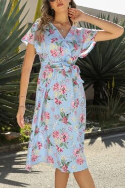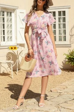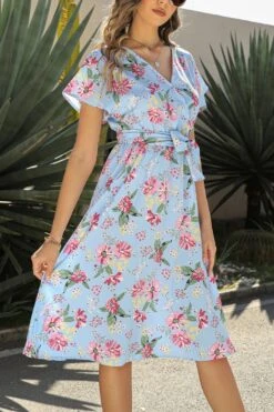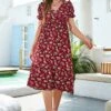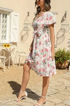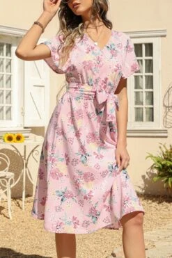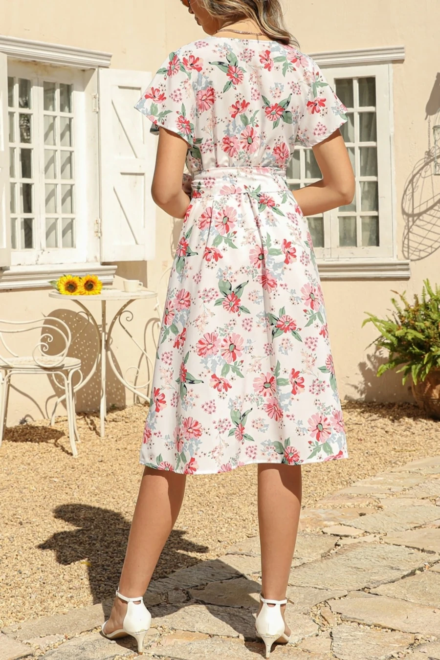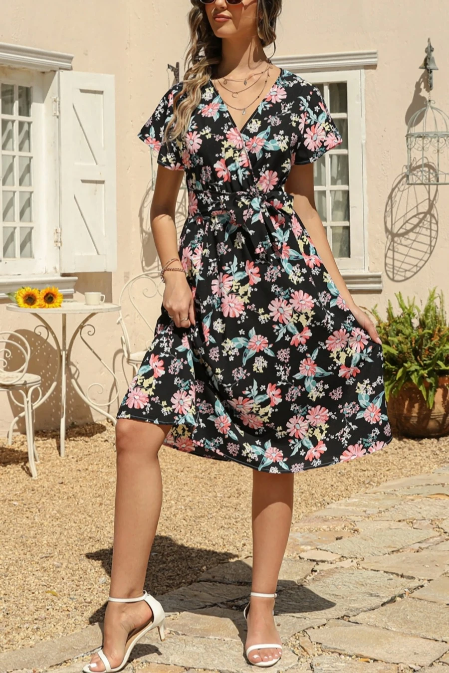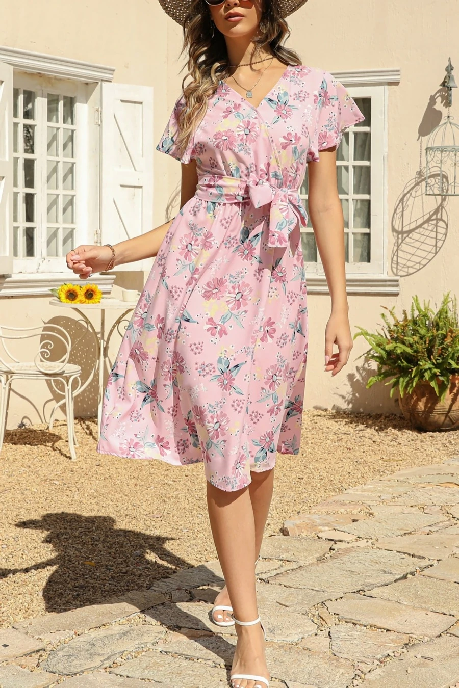 S-2XL summer new plus size 4 colors flower batch printing inelastic chiffon v-neck stylish vacation style midi dress with belt