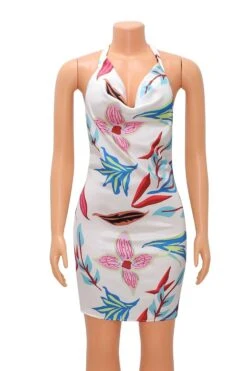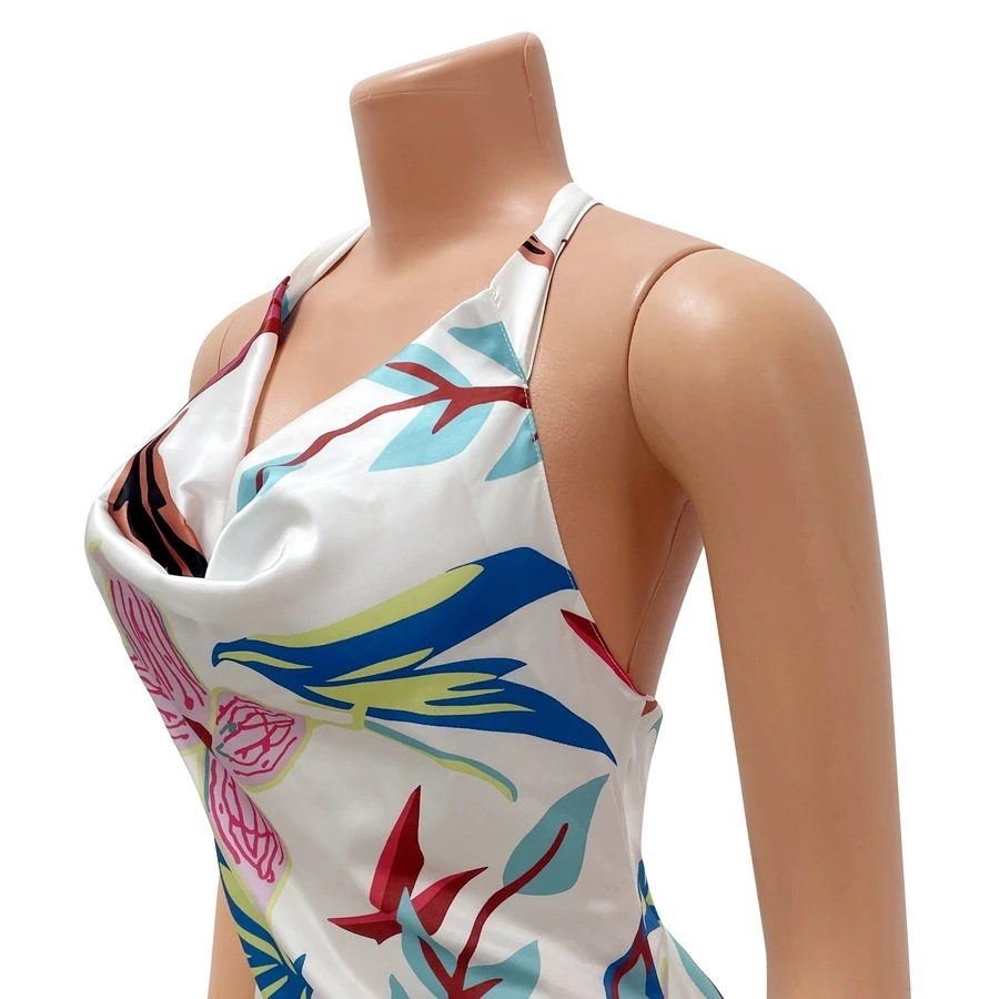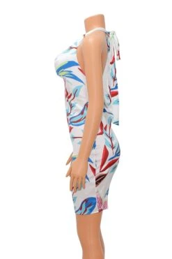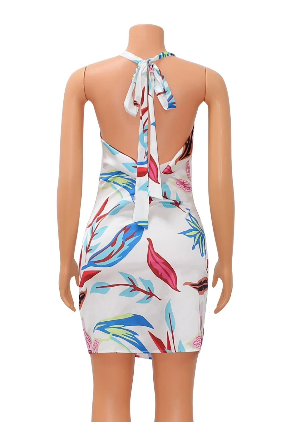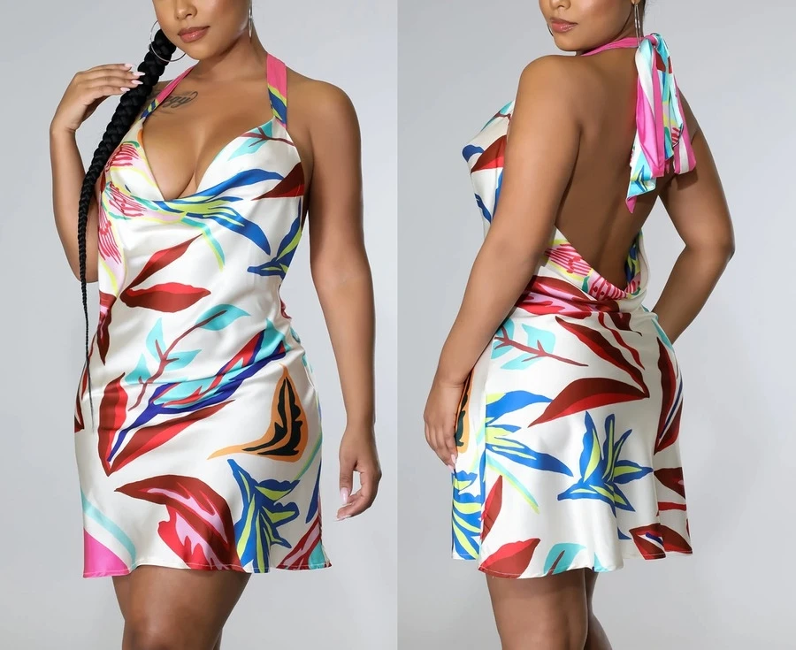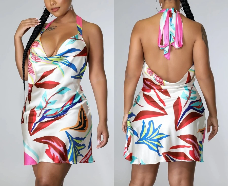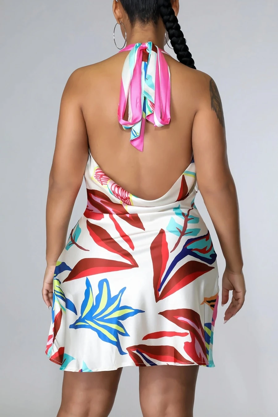 S-2XL summer new plus size leaf batch printing slight stretch halter-neck tied sexy mini dress