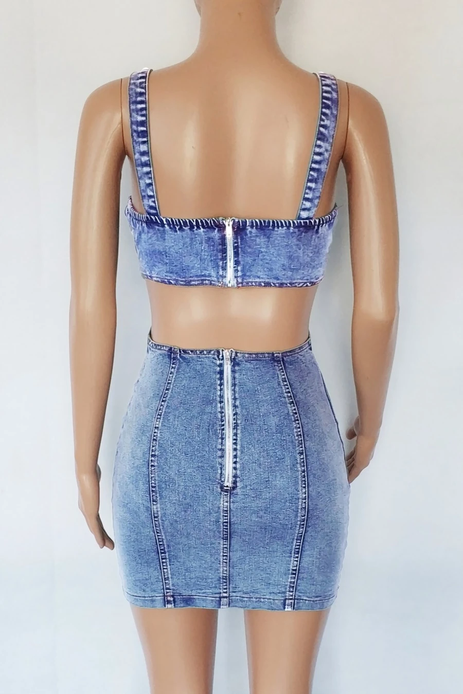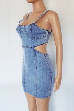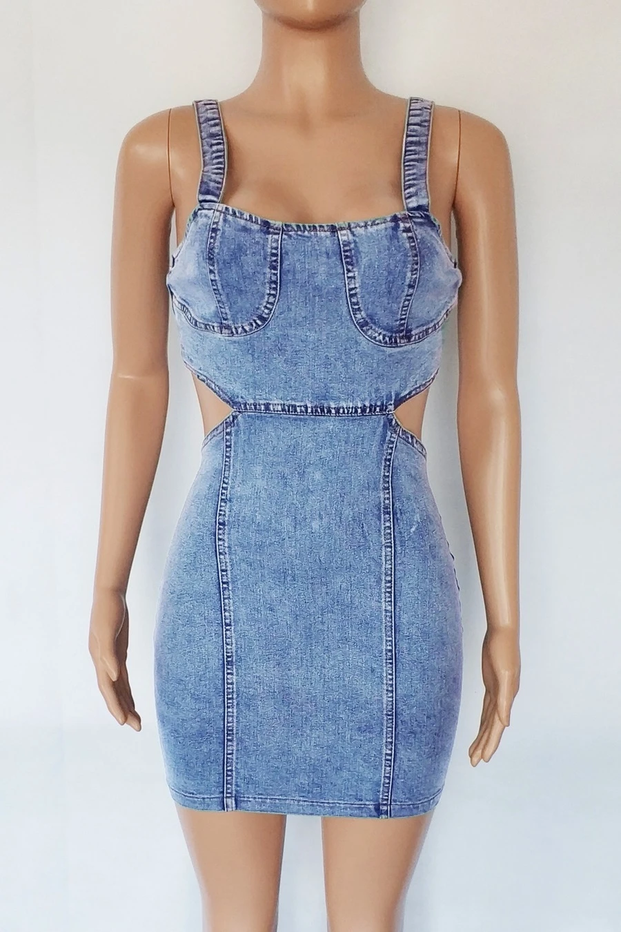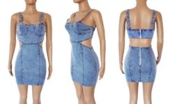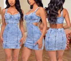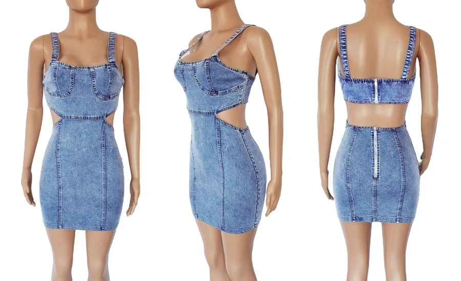 S-2XL summer new plus size micro-elastic low-cut sling hollow out zip-up sexy bodycon denim mini dress