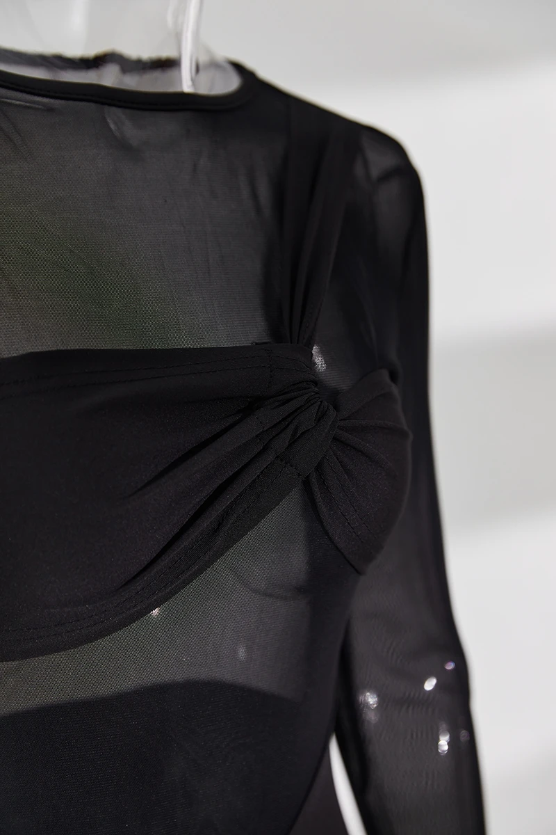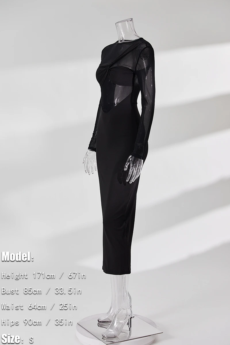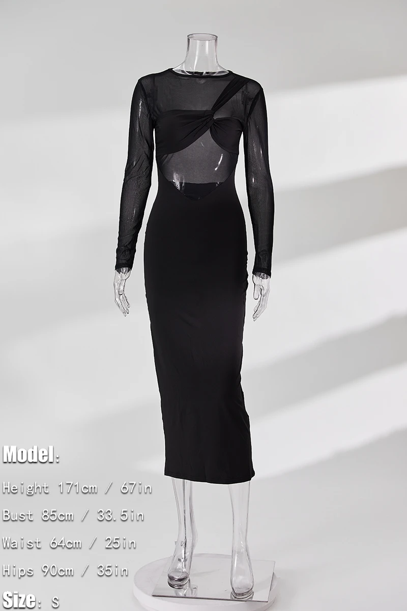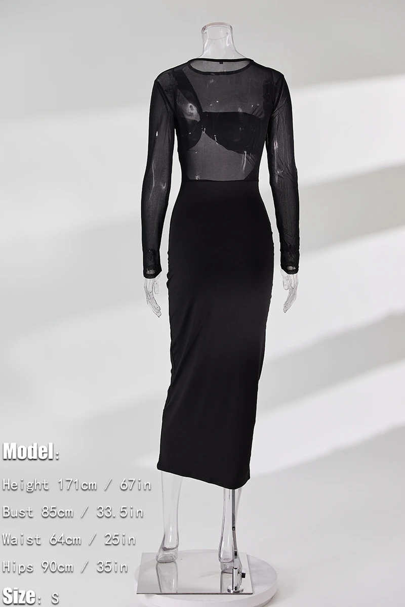 S-2XL summer new plus size see through mesh patchwork long sleeves sexy bodycon maxi dress