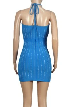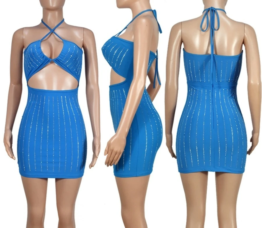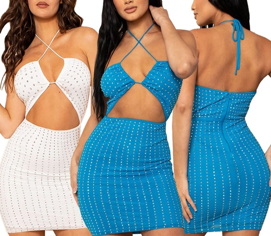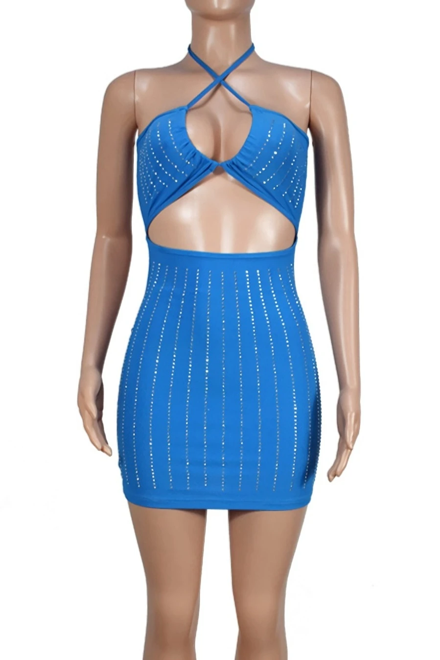 S-2XL summer new plus size two colors rhinestone decor hollow halter-neck lace-up zip-up sexy bodycon mini dress