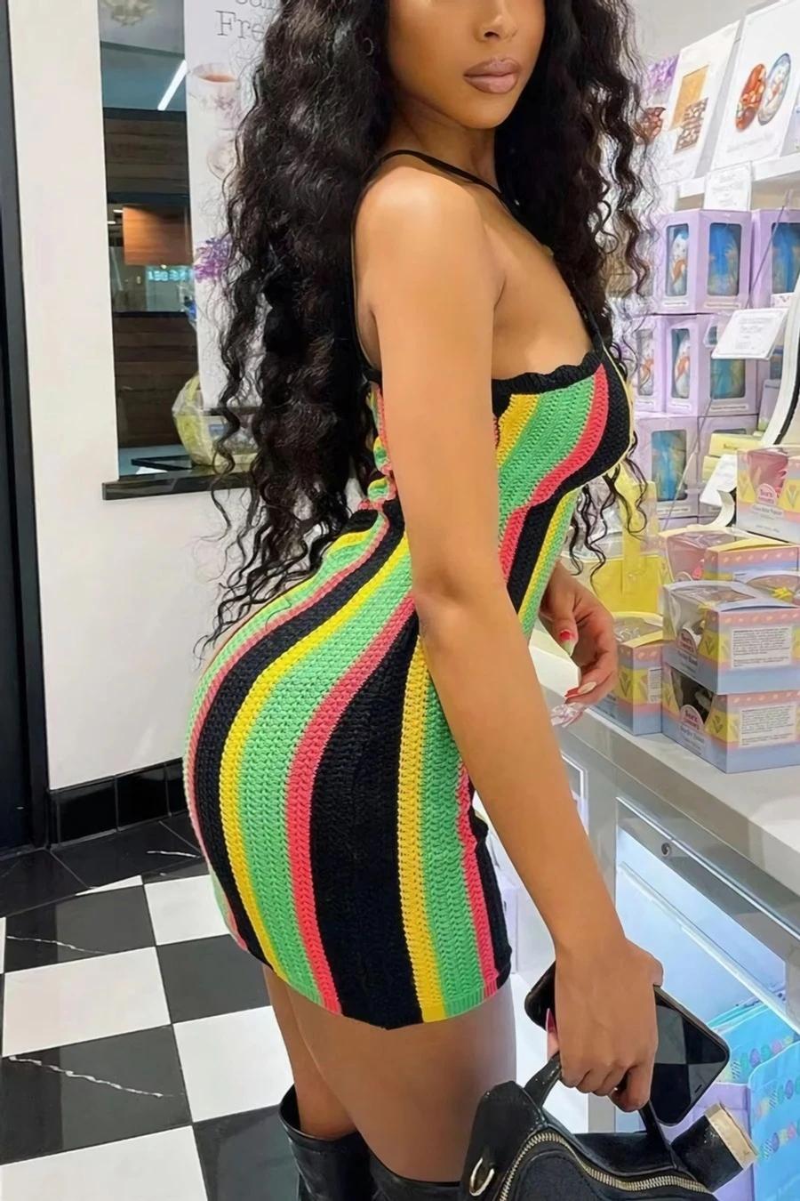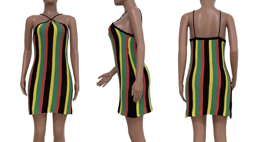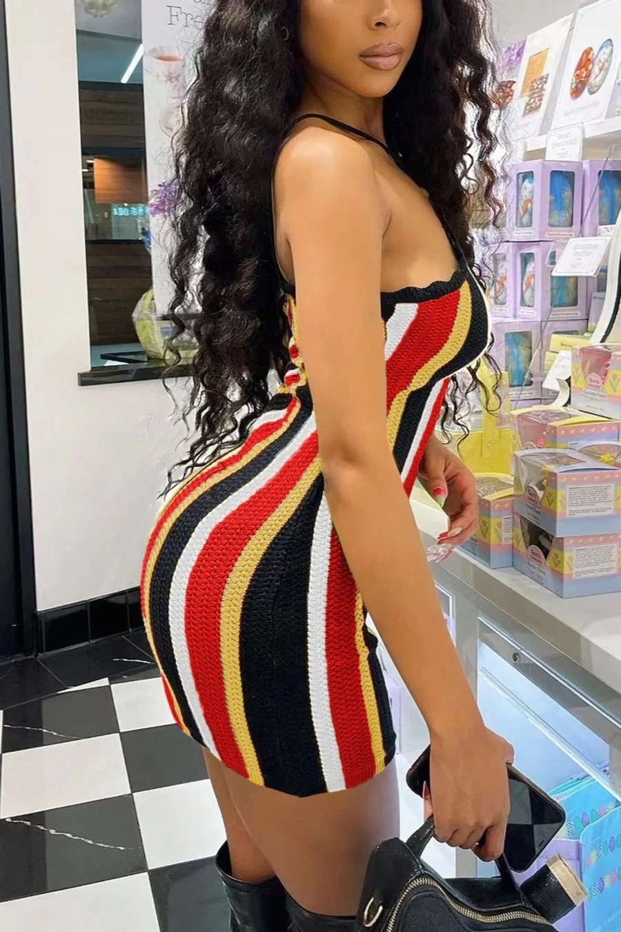 S-2XL summer new plus size two colors stripe knitted stretch backless ring linked sling sexy mini dress