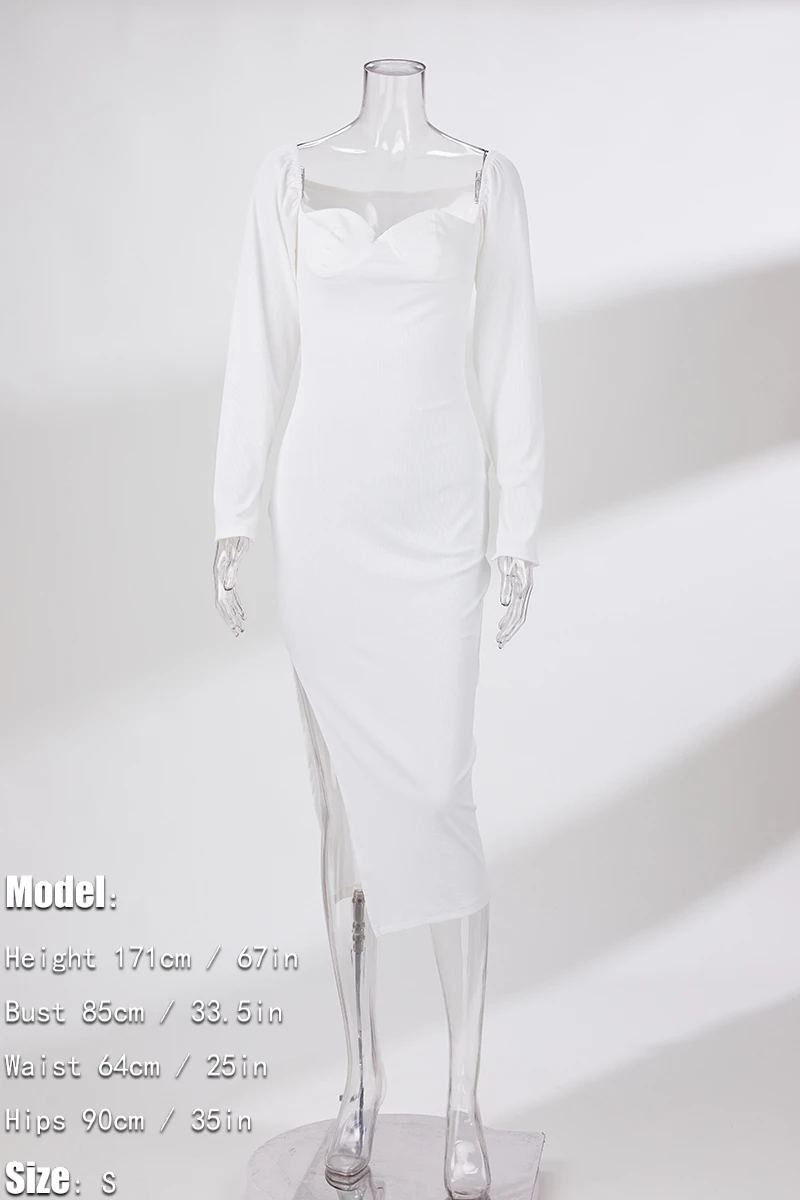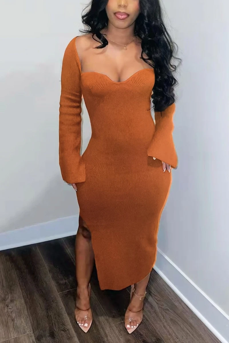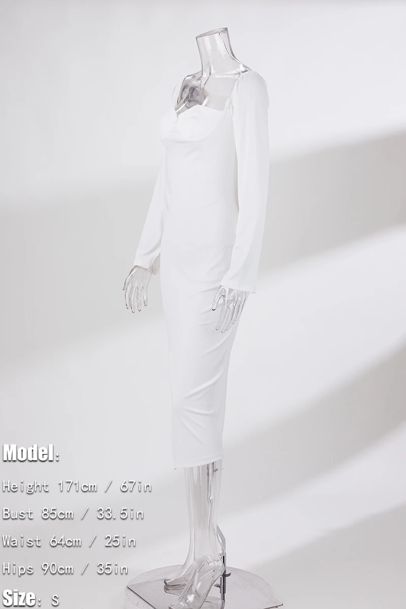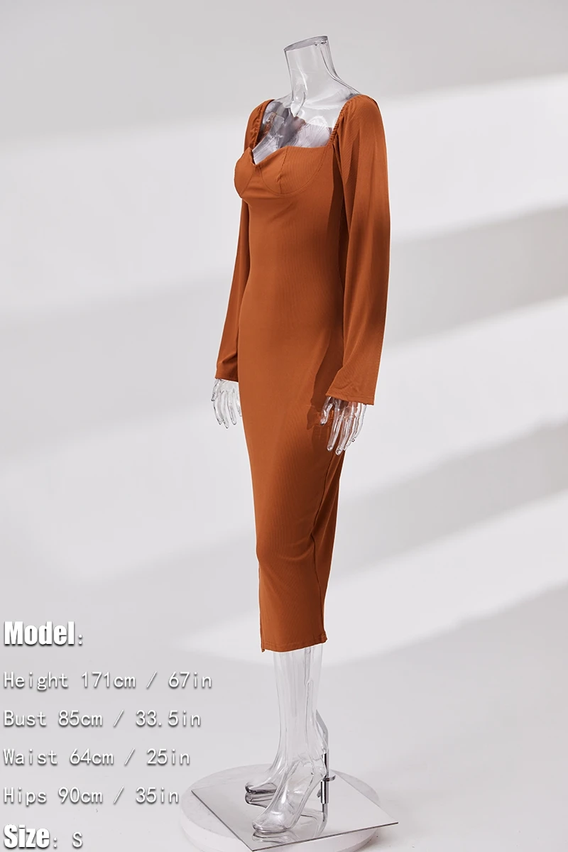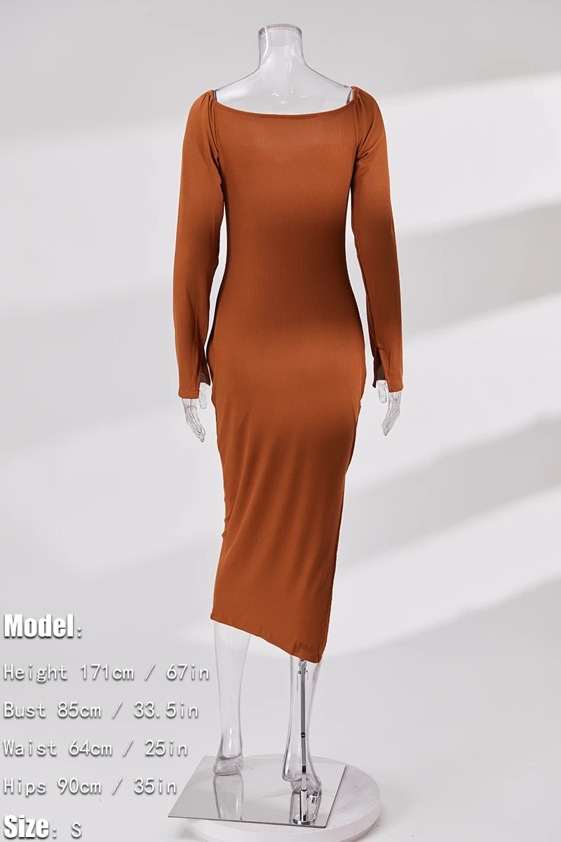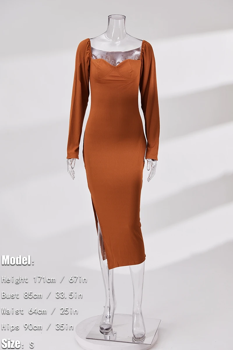 S-3XL plus size autumn new stylish three colors solid color square neck long sleeve stretch slit sexy midi dress