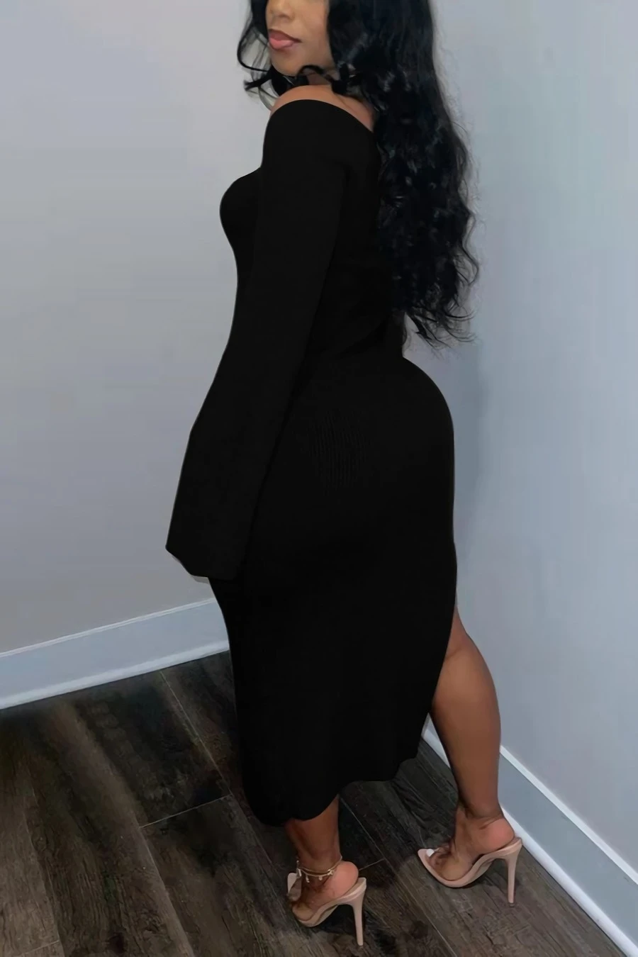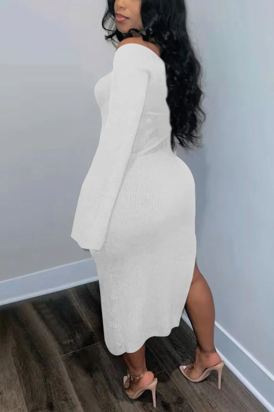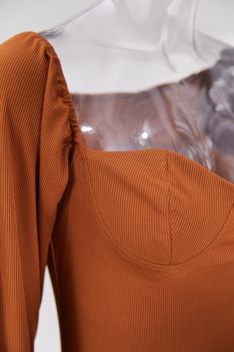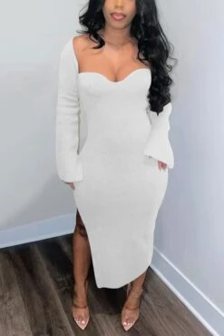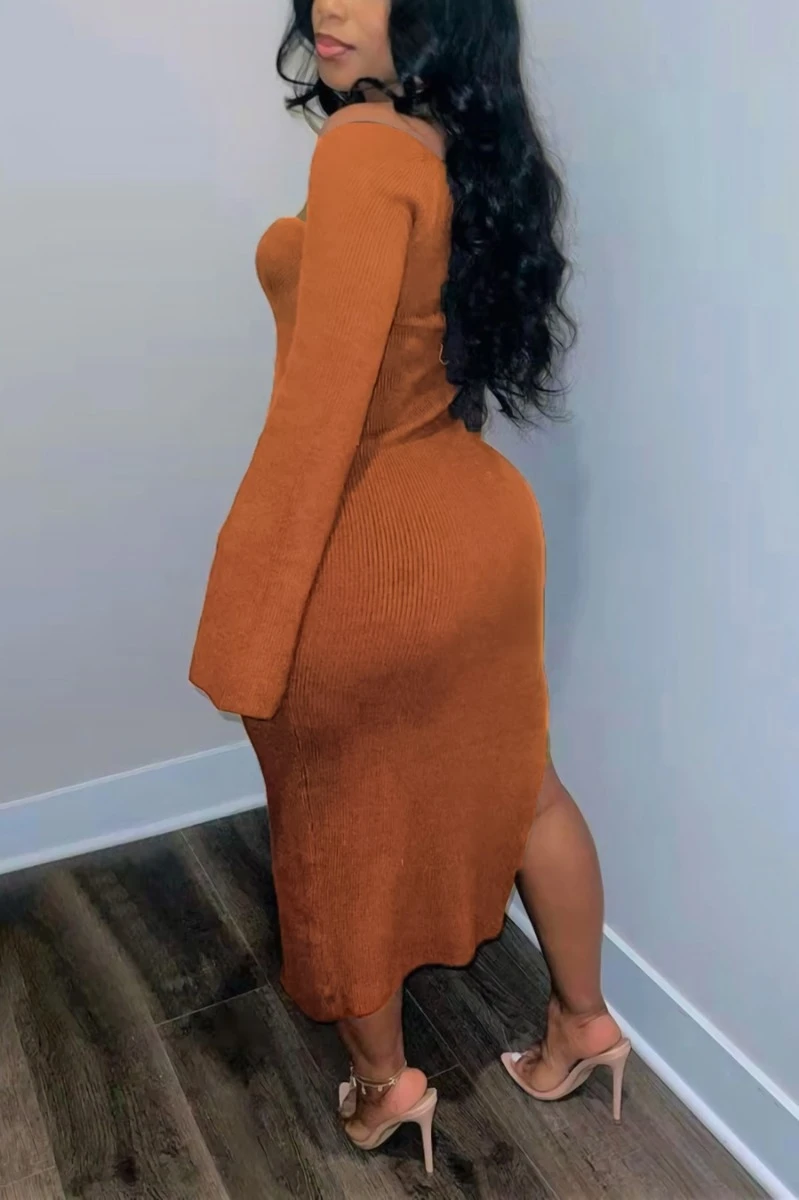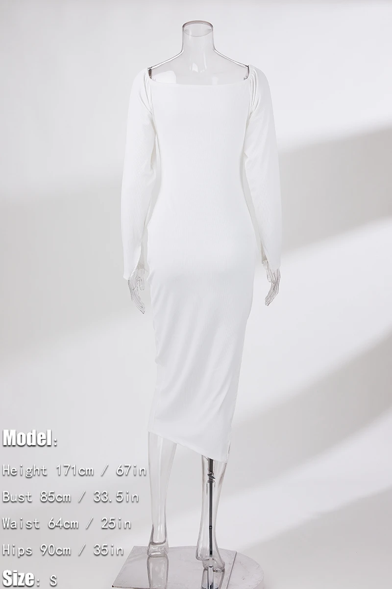 S-3XL plus size autumn new stylish three colors solid color square neck long sleeve stretch slit sexy midi dress