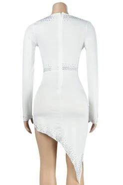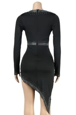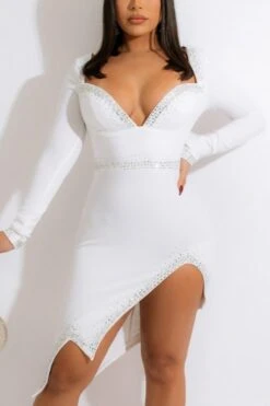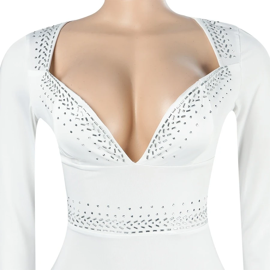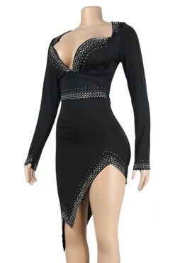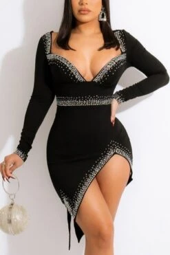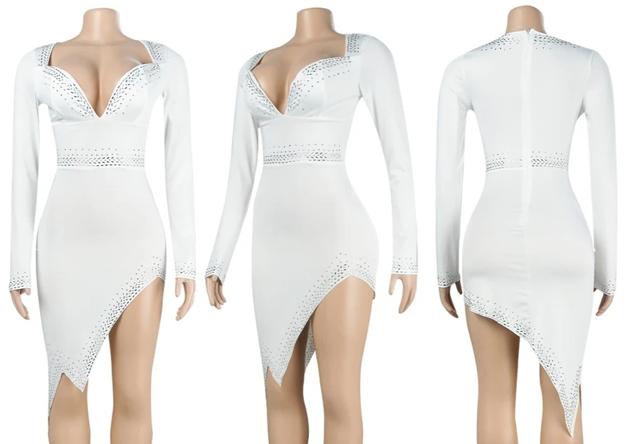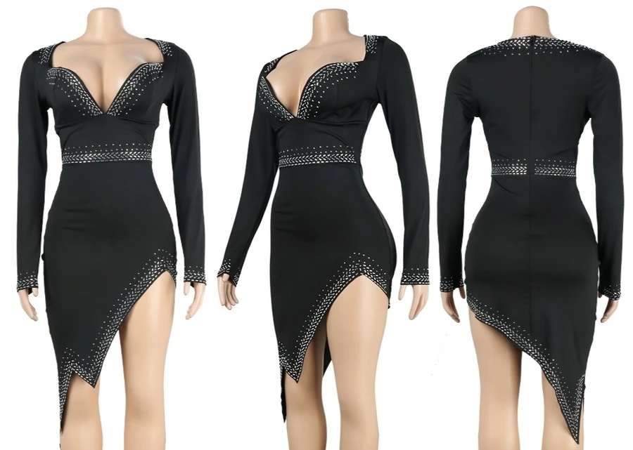 S-3XL plus size rhinestone decor deep v-neck slit sexy midi dress
