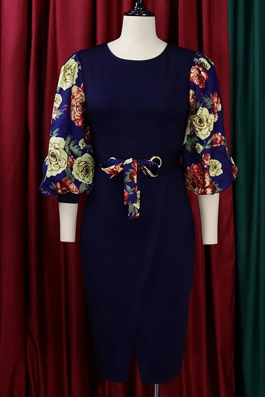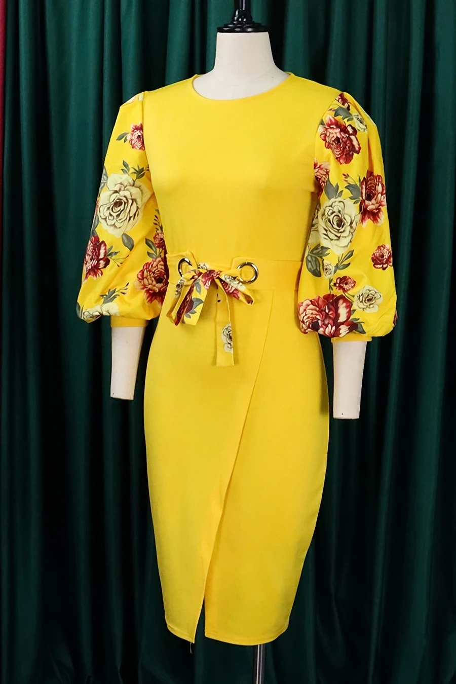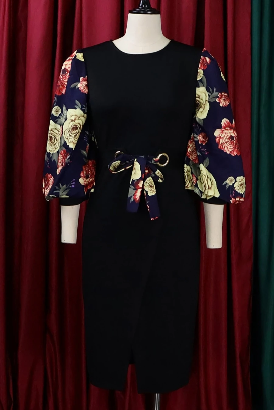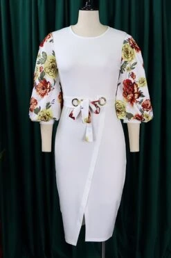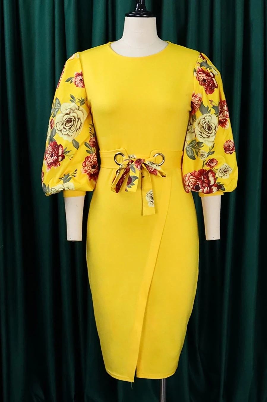 S-3XL plus size spring & summer new 7colors mesh floral printing patchwork high stretch three-quarter sleeve nipped waist lace up slit irregular stylish causal midi dress(with belt)