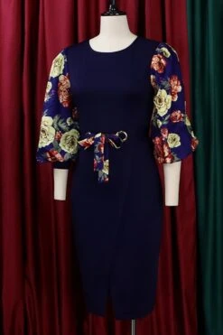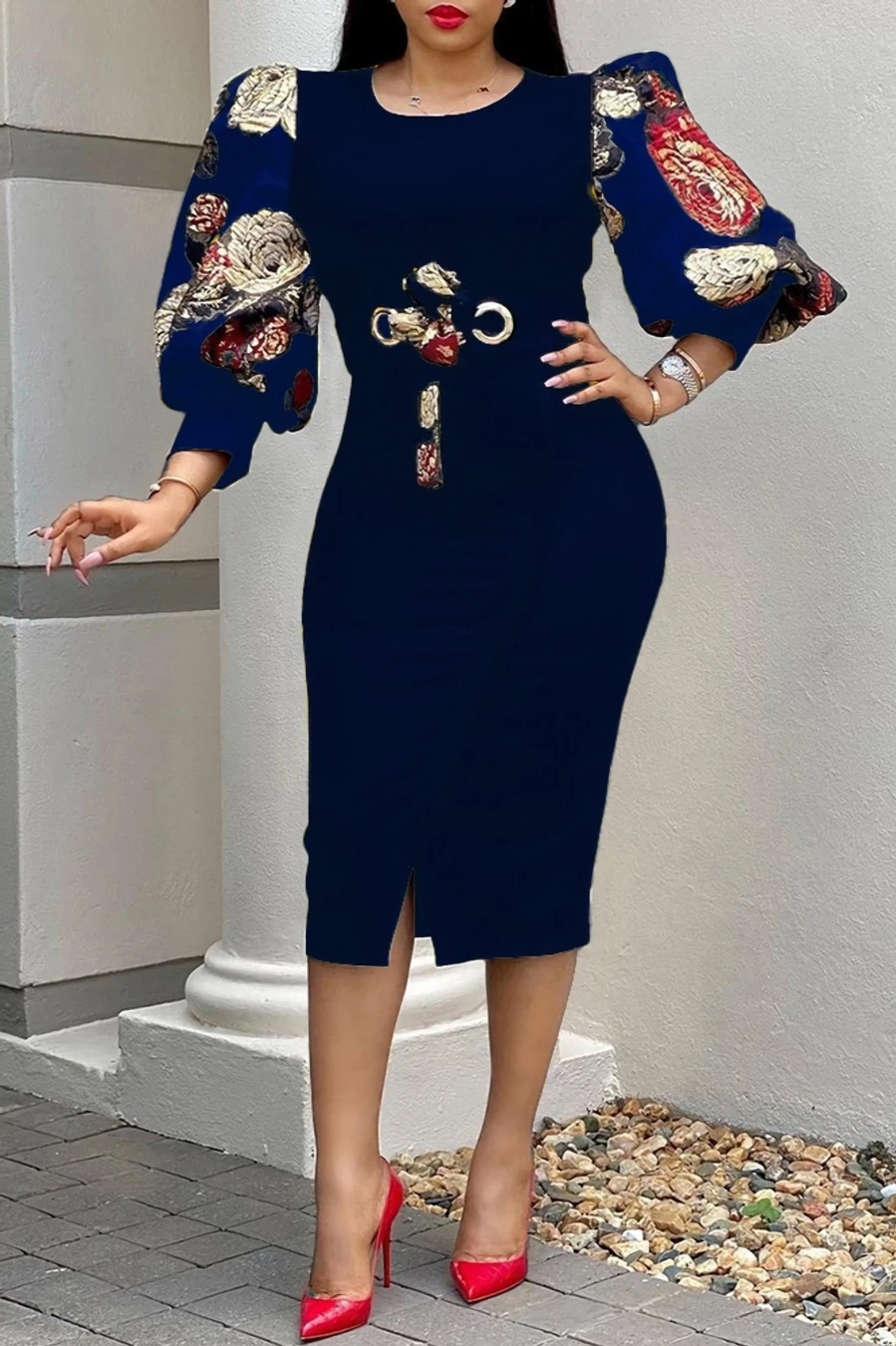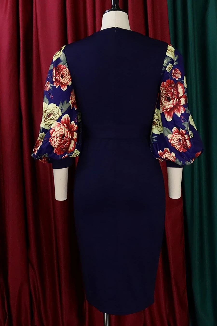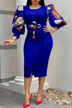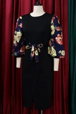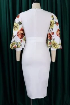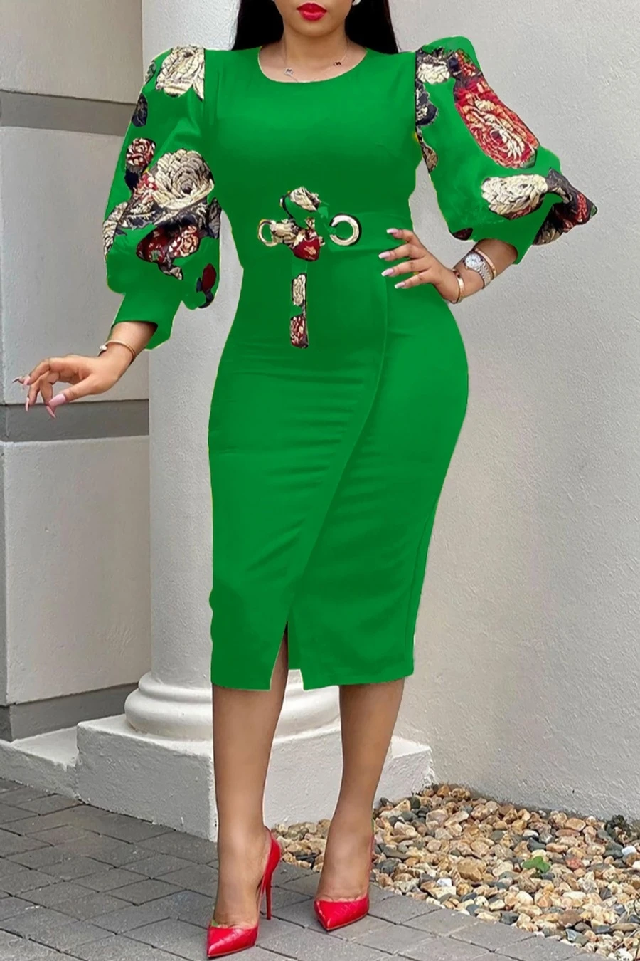 S-3XL plus size spring & summer new 7colors mesh floral printing patchwork high stretch three-quarter sleeve nipped waist lace up slit irregular stylish causal midi dress(with belt)
