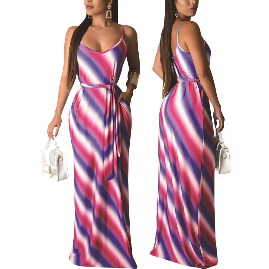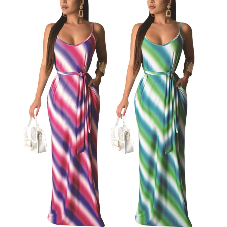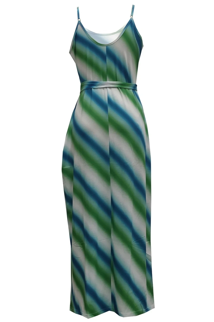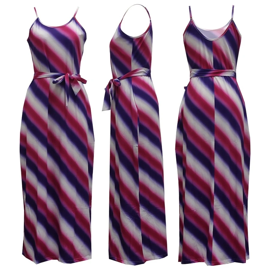 S-3XL summer new plus size two colors stripe tie dye printing stretch sling pockets floor length loose stylish casual maxi dress with belt